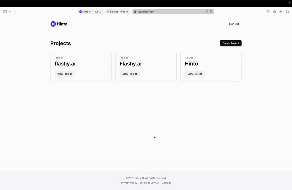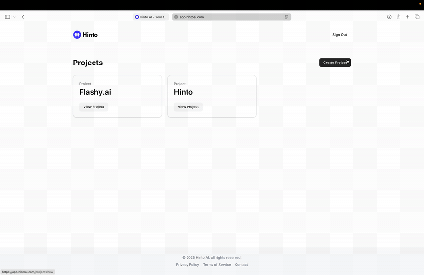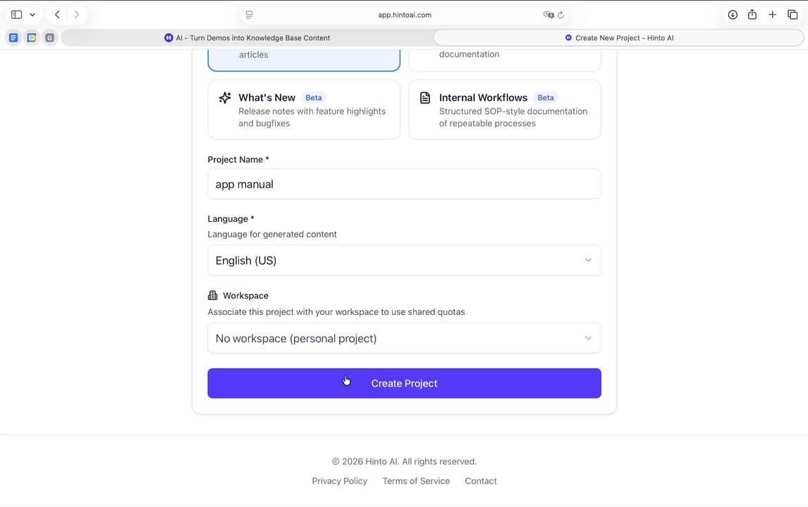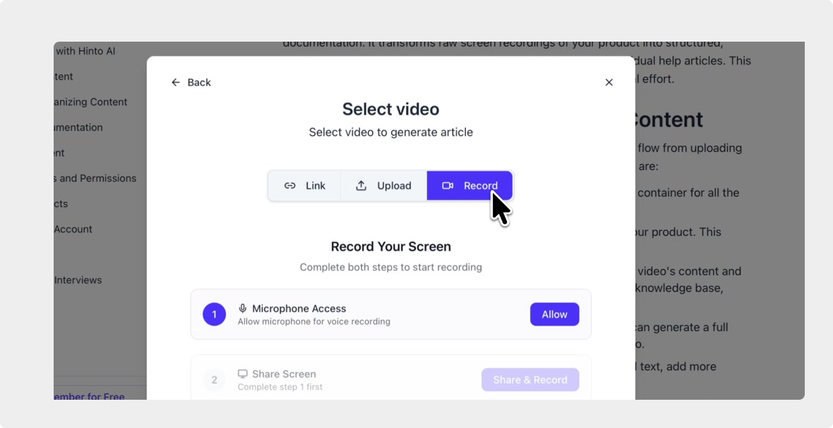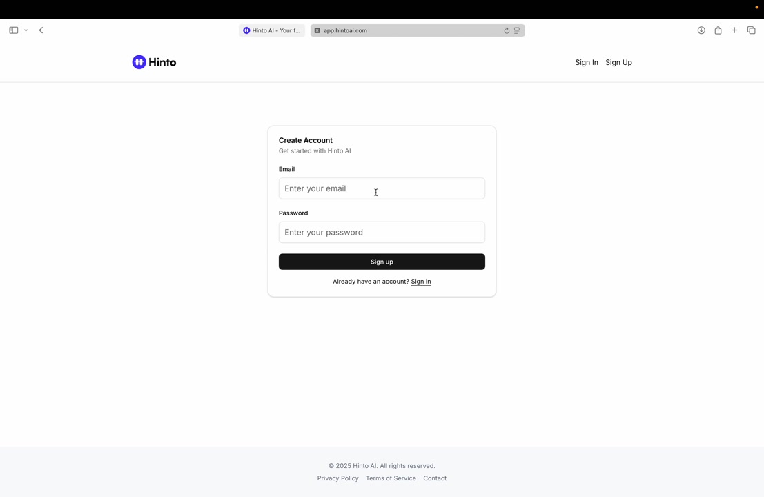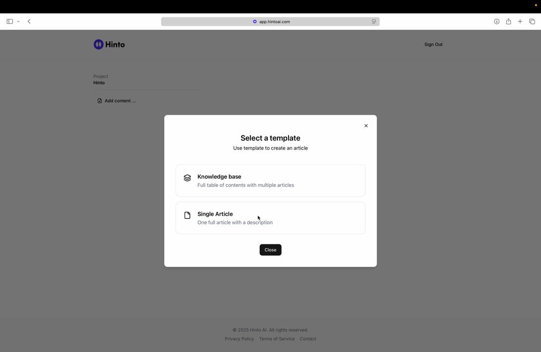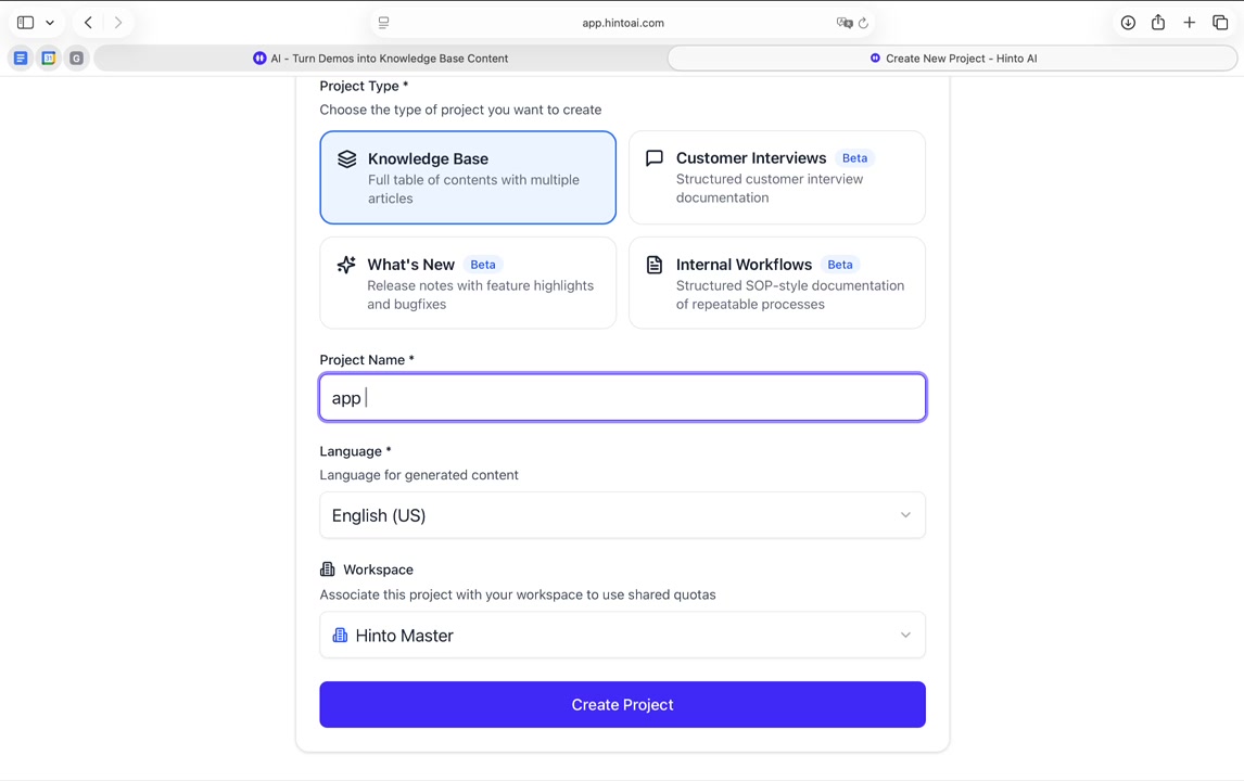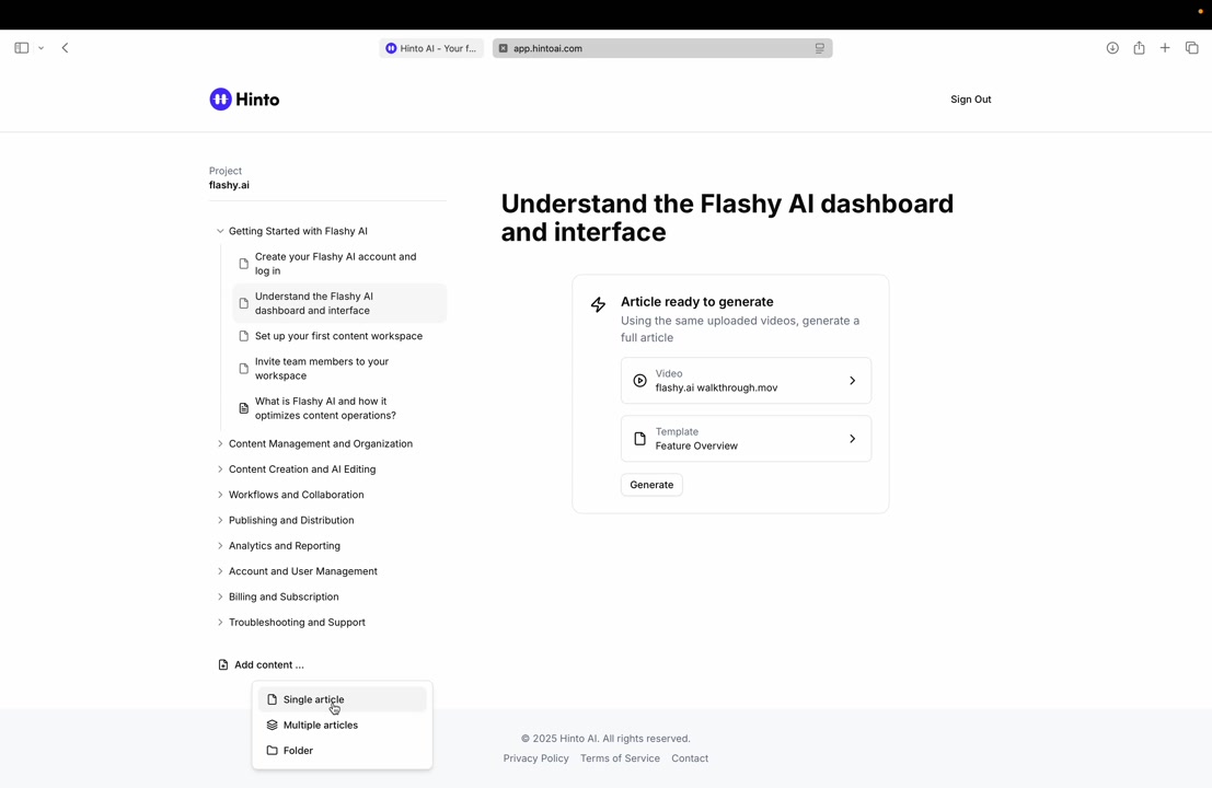 # Hinto AI --- ## Getting Started with Hinto AI ### Sign up and log in with Google # Sign up and log in with Google Hinto AI allows you to create an account and sign in using your existing Google account for a faster and more secure experience. This option is available on the main sign-up and sign-in pages, streamlining your access to the platform without needing to manage a separate password. ## Signing Up with Google If you are creating a new Hinto AI account, you can use your Google credentials to get started quickly. On the **Create Account** page, you will find the option to sign up with Google. 1. Navigate to the Hinto AI sign-up page. 2. Instead of filling out the email and password fields, click the **Sign up with Google** button. 3. A new window will open, prompting you to choose a Google account. Select the account you wish to use. 4. After selecting your account, you will be automatically authenticated and redirected to your Hinto AI projects dashboard.  ## Logging In with Google Once you have created an account using Google, you can use the same method to log in for subsequent sessions. The process is similar to signing up. 1. On the Hinto AI sign-in page, click the **Sign in with Google** button. 2. If you are already logged into your Google account in your browser, you may be logged into Hinto AI automatically. 3. If not, select your Google account from the list that appears. You will then be redirected to your dashboard. ### Important Considerations - **One Account, One Method:** If you sign up with Google, you should continue to log in with Google. An account created via Google OAuth is separate from an account created with the same email address and a password. - **Security:** Using Google for authentication leverages Google's security features, such as two-factor authentication (2FA), for your Hinto AI account. ## Summary This article explains how to use your Google account to both create and access your Hinto AI profile. By using the 'Sign up with Google' feature, you can bypass manual password creation for a streamlined and secure authentication process, getting you to your projects dashboard in just a few clicks. ## Related - [Create your Hinto AI account](/docs/getting-started-with-hinto-ai/create-your-hinto-ai-account) - [Log in into your Hinto AI account](/docs/getting-started-with-hinto-ai/log-in-into-your-hinto-ai-account) - [Create your first project](/docs/getting-started-with-hinto-ai/create-your-first-project) --- ### Complete the onboarding setup # Complete the onboarding setup After creating your Hinto AI account, you will be guided through a brief, multi-step onboarding process. This setup helps personalize your experience, create your first project, and prepares you to generate your first knowledge base. ## Step 1: Welcome to Hinto AI The first step helps us understand your needs better. You'll be asked to provide some basic information about yourself and your company. You must make a selection for each required field to proceed. - **How did you hear about Hinto AI?:** Select the source from the options provided. - **Company size:** Choose the option that best represents the number of employees in your company. - **What's your role?:** Select your current role from the list.  Once you have filled out all the fields, click the **Continue** button. ## Step 2: Create Your First Project Next, you will set up your first project. This project will house the documentation you generate. - **Project Name:** Enter a descriptive name for your project. - **Language:** Select the primary language for the content that will be generated.  Click **Continue** to move to the next step. ## Step 3: How Hinto AI Works A brief tutorial video will appear, providing a quick overview of how Hinto AI transforms your demos into a knowledge base. Watching this video is a great way to get acquainted with the platform's core functionality. When you are finished, click **Got it, Continue**.  ## Step 4: Upload Your First Video The final step is to upload your first screen recording. You can either drag and drop a file or click to select one from your computer. Hinto AI will use this video to automatically generate your knowledge base content. Supported formats include MP4, MOV, AVI, and WebM.  ### Tips for Using This Section If you prefer to explore the dashboard immediately, you can click the **Skip** button located in the top-right corner of the screen at any point during the onboarding process. This will take you directly to your project space. ## Summary This article provides a step-by-step guide to the Hinto AI onboarding flow. Following these steps allows you to personalize your account, create your first project, and upload a video to start generating content immediately after signing up. ## Related - [Create your Hinto AI account](/docs/getting-started-with-hinto-ai/create-your-hinto-ai-account) - [Create your first project](/docs/getting-started-with-hinto-ai/create-your-first-project) - [Generate a Knowledge Base](/docs/generating-content/generate-a-complete-knowledge-base-from-a-video) --- ### Log in into your Hinto AI account # How to Log In to Your Hinto AI Account This guide explains how to log in to your Hinto AI account. Following these steps will give you access to your projects and allow you to create new tutorials. You'll need the email address and password you used to register. 1. Navigate to the Hinto AI homepage and click the **Get Started** button in the top-right corner. 2. On the login page, enter your registered email address into the **Email** field. 3. Enter your password into the **Password** field. 4. Click the **Sign in** button to access your dashboard.  ### What If I Don't Have an Account? If you haven't created an account yet, click the **Sign up** link located below the **Sign in** button to register. --- ### What is Hinto AI and how it works? # What is Hinto AI and how it works? Hinto AI is a powerful platform designed to automate and accelerate the 