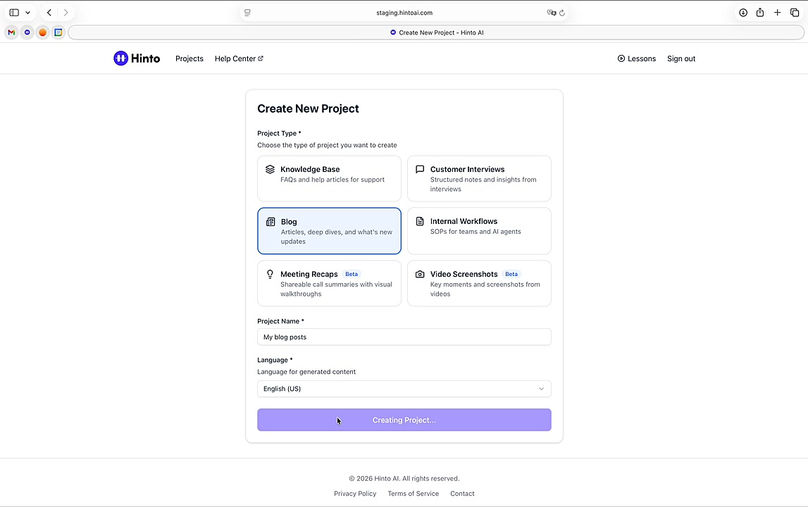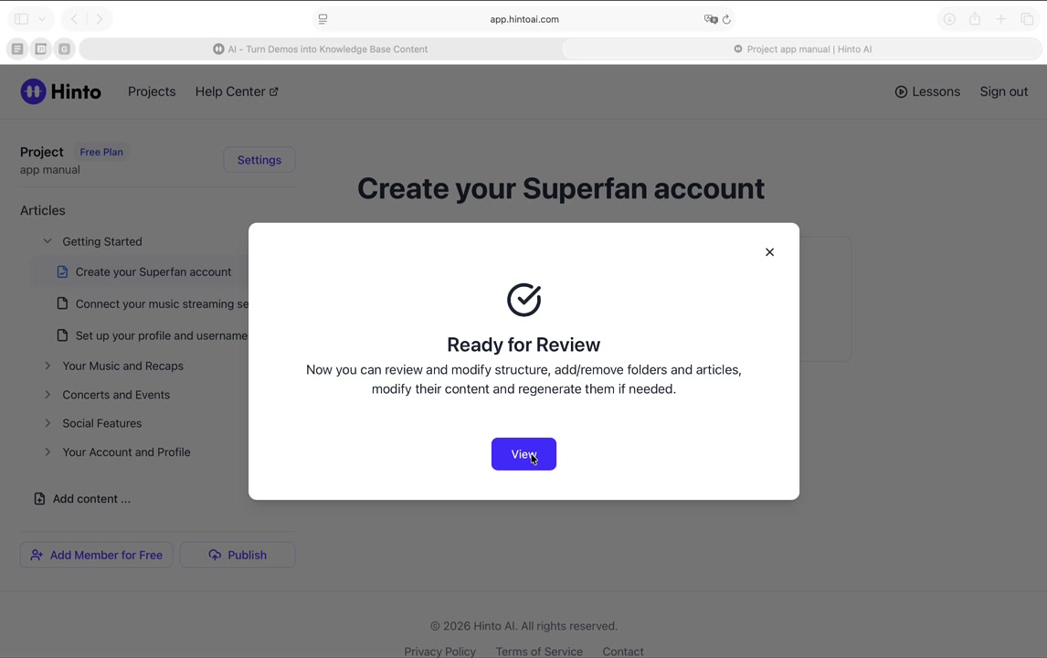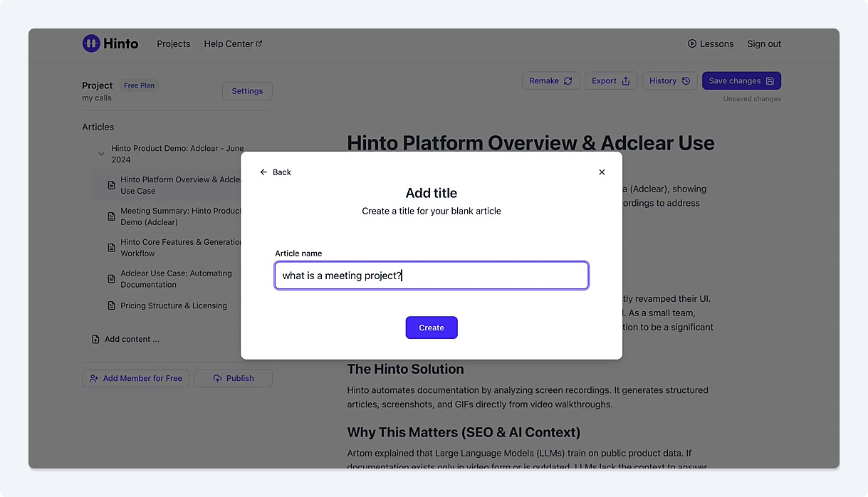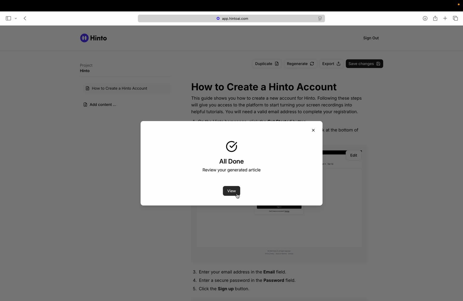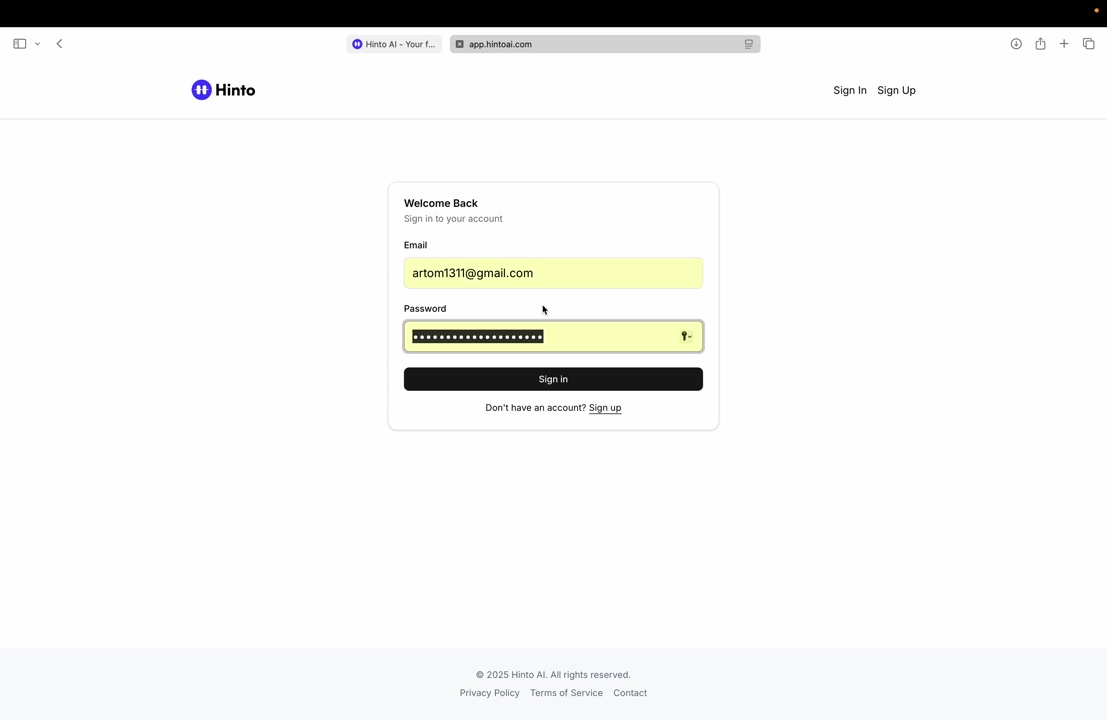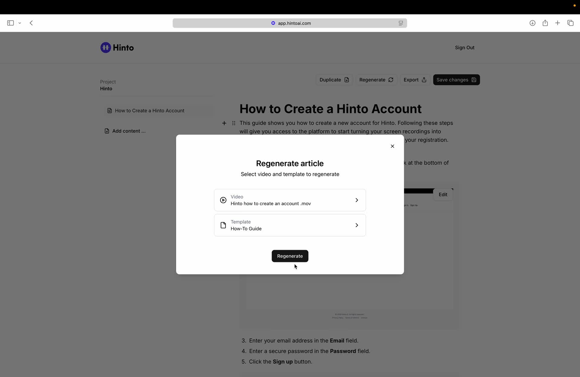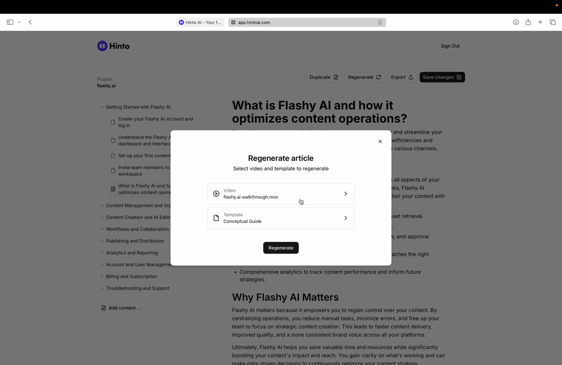 # Hinto AI --- ## Getting Started with Hinto AI ### Sign up and log in with Google # Sign up and log in with Google Hinto AI allows you to create an account and sign in using your existing Google account for a faster and more secure experience. This option is available on the main sign-up and sign-in pages, streamlining your access to the platform without needing to manage a separate password. ## Signing Up with Google If you are creating a new Hinto AI account, you can use your Google credentials to get started quickly. On the **Create Account** page, you will find the option to sign up with Google. 1. Navigate to the Hinto AI sign-up page. 2. Instead of filling out the email and password fields, click the **Sign up with Google** button. 3. A new window will open, prompting you to choose a Google account. Select the account you wish to use. 4. After selecting your account, you will be automatically authenticated and redirected to your Hinto AI projects dashboard.  ## Logging In with Google Once you have created an account using Google, you can use the same method to log in for subsequent sessions. The process is similar to signing up. 1. On the Hinto AI sign-in page, click the **Sign in with Google** button. 2. If you are already logged into your Google account in your browser, you may be logged into Hinto AI automatically. 3. If not, select your Google account from the list that appears. You will then be redirected to your dashboard. ### Important Considerations - **One Account, One Method:** If you sign up with Google, you should continue to log in with Google. An account created via Google OAuth is separate from an account created with the same email address and a password. - **Security:** Using Google for authentication leverages Google's security features, such as two-factor authentication (2FA), for your Hinto AI account. ## Summary This article explains how to use your Google account to both create and access your Hinto AI profile. By using the 'Sign up with Google' feature, you can bypass manual password creation for a streamlined and secure authentication process, getting you to your projects dashboard in just a few clicks. ## Related - [Create your Hinto AI account](/docs/getting-started-with-hinto-ai/create-your-hinto-ai-account) - [Log in into your Hinto AI account](/docs/getting-started-with-hinto-ai/log-in-into-your-hinto-ai-account) - [Create your first project](/docs/getting-started-with-hinto-ai/create-your-first-project) --- ### Complete the onboarding setup # Complete the onboarding setup After creating your Hinto AI account, you will be guided through a brief, multi-step onboarding process. This setup helps personalize your experience, create your first project, and prepares you to generate your first knowledge base. ## Step 1: Welcome to Hinto AI The first step helps us understand your needs better. You'll be asked to provide some basic information about yourself and your company. You must make a selection for each required field to proceed. - **How did you hear about Hinto AI?:** Select the source from the options provided. - **Company size:** Choose the option that best represents the number of employees in your company. - **What's your role?:** Select your current role from the list.  Once you have filled out all the fields, click the **Continue** button. ## Step 2: Create Your First Project Next, you will set up your first project. This project will house the documentation you generate. - **Project Name:** Enter a descriptive name for your project. - **Language:** Select the primary language for the content that will be generated.  Click **Continue** to move to the next step. ## Step 3: How Hinto AI Works A brief tutorial video will appear, providing a quick overview of how Hinto AI transforms your demos into a knowledge base. Watching this video is a great way to get acquainted with the platform's core functionality. When you are finished, click **Got it, Continue**.  ## Step 4: Upload Your First Video The final step is to upload your first screen recording. You can either drag and drop a file or click to select one from your computer. Hinto AI will use this video to automatically generate your knowledge base content. Supported formats include MP4, MOV, AVI, and WebM.  ### Tips for Using This Section If you prefer to explore the dashboard immediately, you can click the **Skip** button located in the top-right corner of the screen at any point during the onboarding process. This will take you directly to your project space. ## Summary This article provides a step-by-step guide to the Hinto AI onboarding flow. Following these steps allows you to personalize your account, create your first project, and upload a video to start generating content immediately after signing up. ## Related - [Create your Hinto AI account](/docs/getting-started-with-hinto-ai/create-your-hinto-ai-account) - [Create your first project](/docs/getting-started-with-hinto-ai/create-your-first-project) - [Generate a Knowledge Base](/docs/generating-content/generate-a-complete-knowledge-base-from-a-video) --- ### Log in into your Hinto AI account # How to Log In to Your Hinto AI Account This guide explains how to log in to your Hinto AI account. Following these steps will give you access to your projects and allow you to create new tutorials. You'll need the email address and password you used to register. 1. Navigate to the Hinto AI homepage and click the **Get Started** button in the top-right corner. 2. On the login page, enter your registered email address into the **Email** field. 3. Enter your password into the **Password** field. 4. Click the **Sign in** button to access your dashboard.  ### What If I Don't Have an Account? If you haven't created an account yet, click the **Sign up** link located below the **Sign in** button to register. --- ### What is Hinto AI and how it works? # What is Hinto AI and how it works? Hinto AI is a powerful platform designed to automate and accelerate the 
