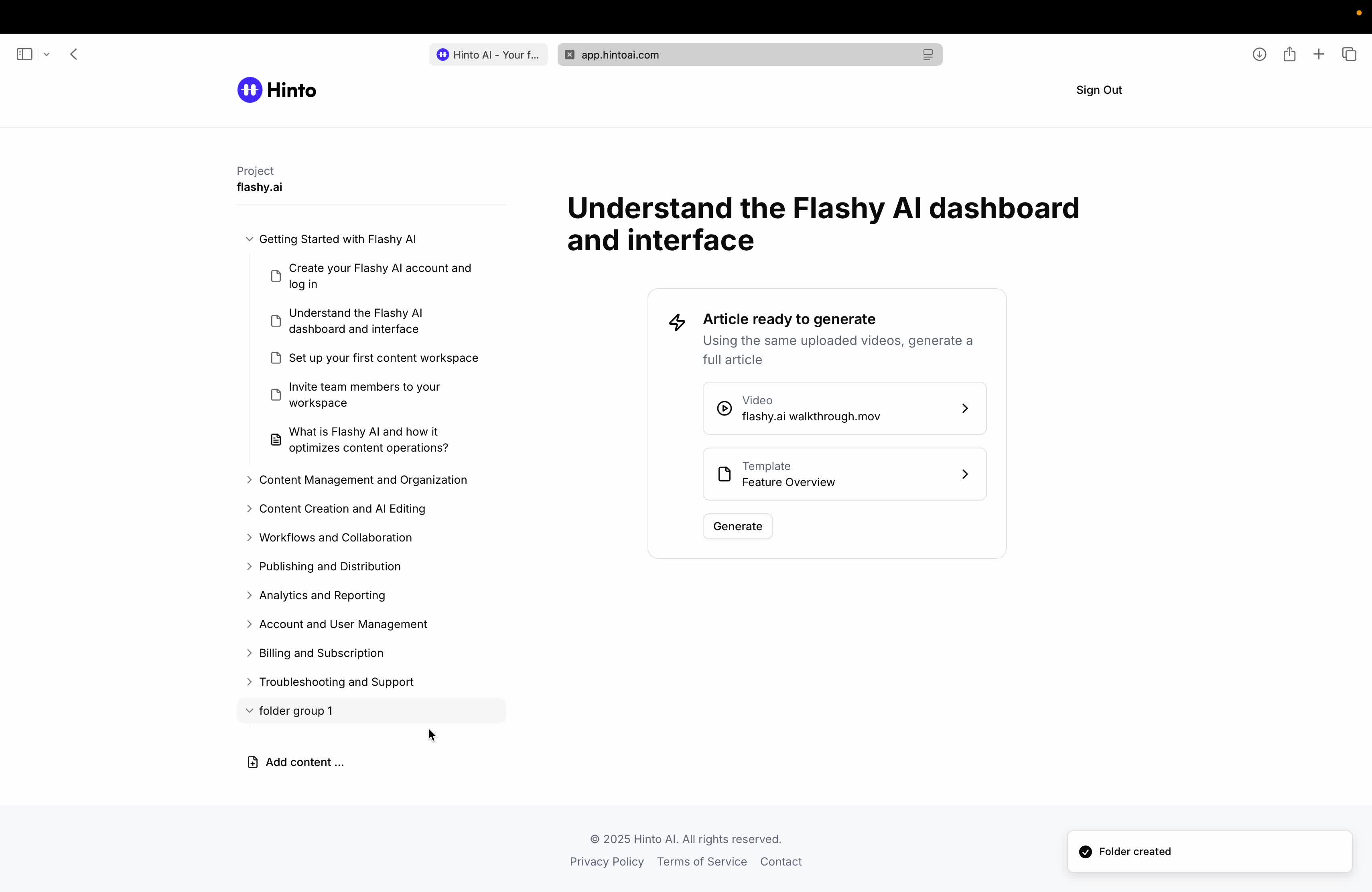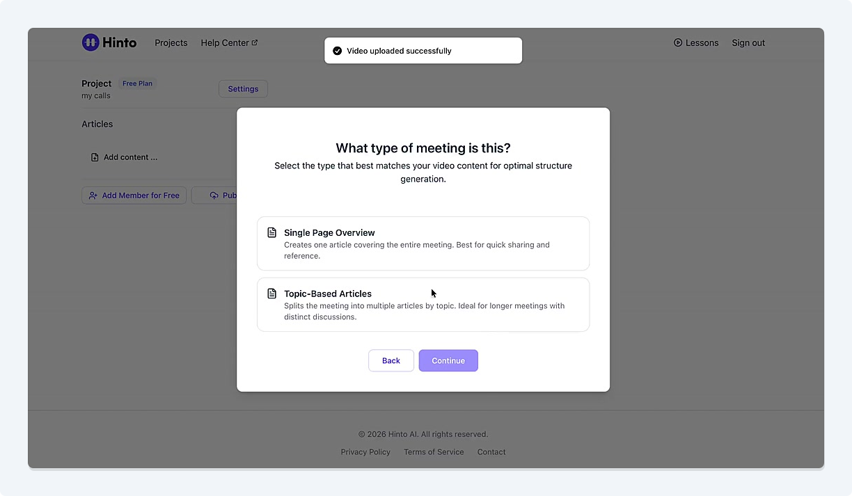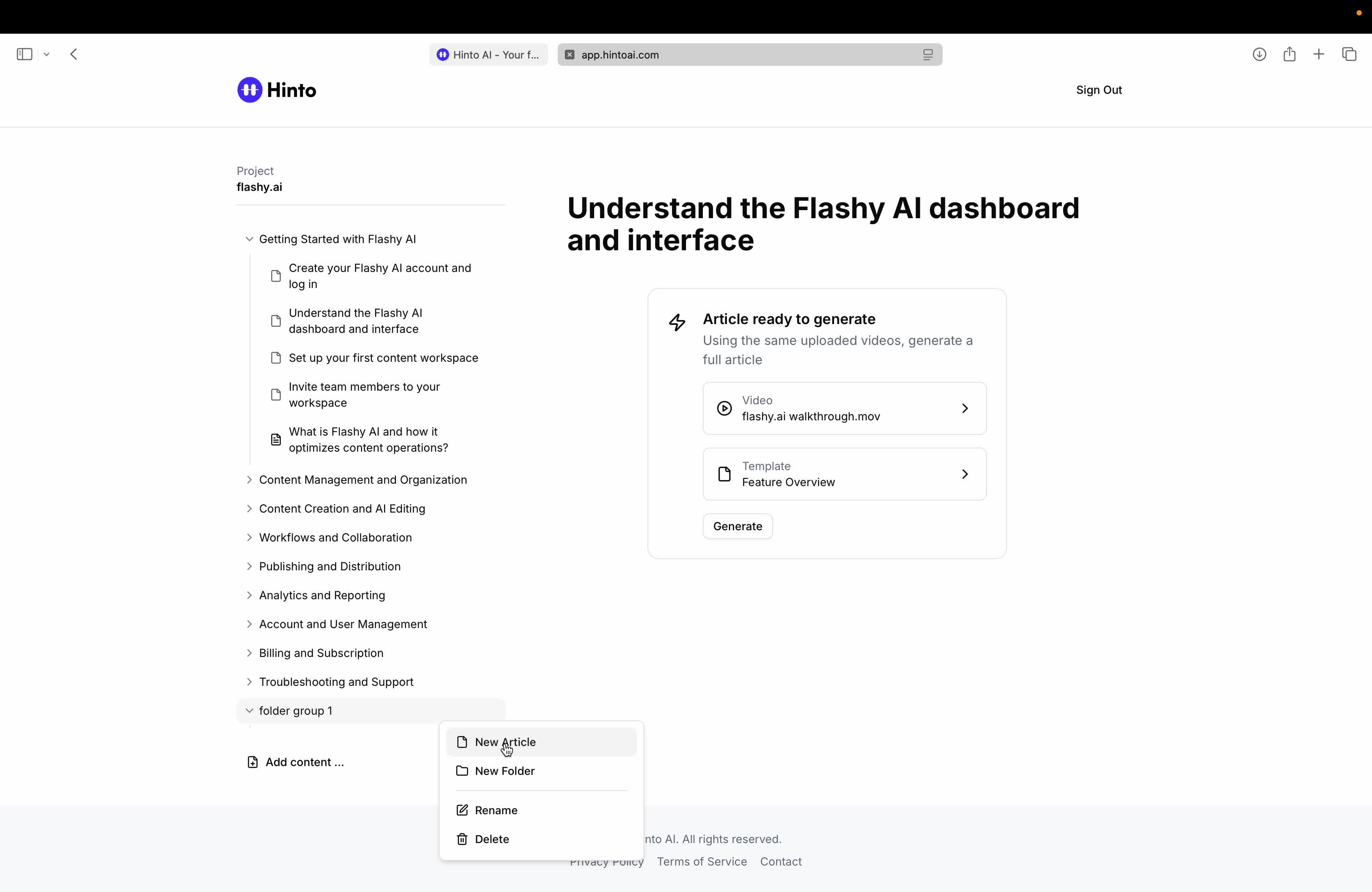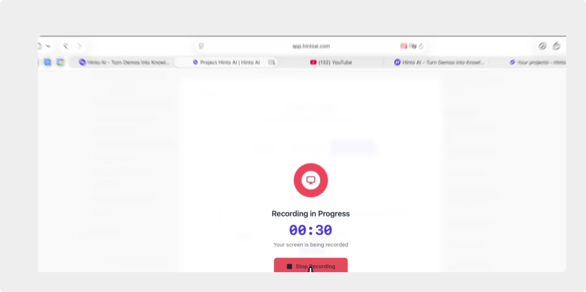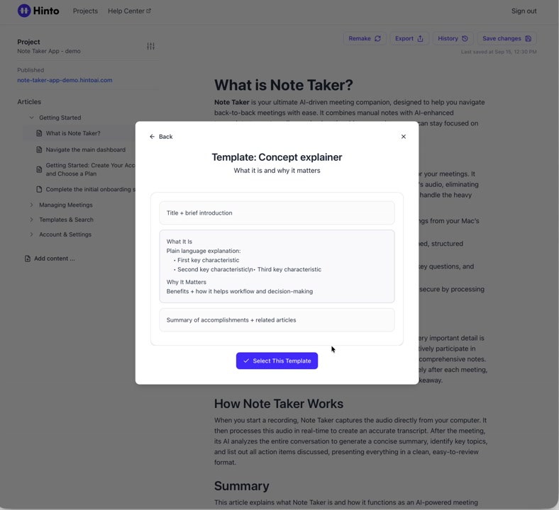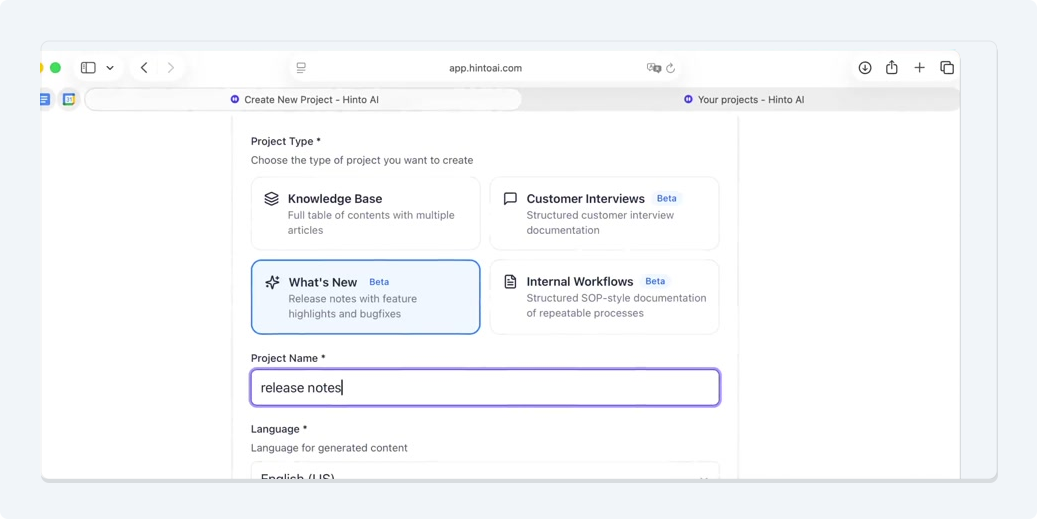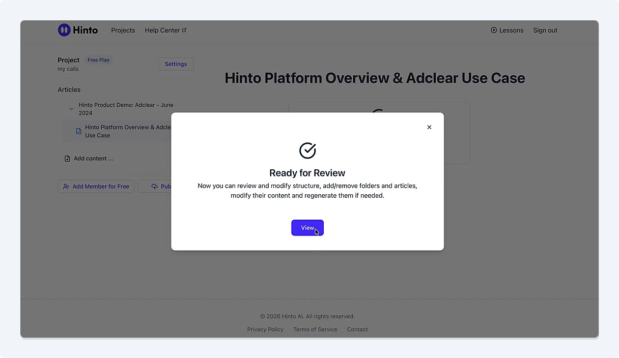 # Hinto AI --- ## Getting Started with Hinto AI ### Sign up and log in with Google # Sign up and log in with Google Hinto AI allows you to create an account and sign in using your existing Google account for a faster and more secure experience. This option is available on the main sign-up and sign-in pages, streamlining your access to the platform without needing to manage a separate password. ## Signing Up with Google If you are creating a new Hinto AI account, you can use your Google credentials to get started quickly. On the **Create Account** page, you will find the option to sign up with Google. 1. Navigate to the Hinto AI sign-up page. 2. Instead of filling out the email and password fields, click the **Sign up with Google** button. 3. A new window will open, prompting you to choose a Google account. Select the account you wish to use. 4. After selecting your account, you will be automatically authenticated and redirected to your Hinto AI projects dashboard.  ## Logging In with Google Once you have created an account using Google, you can use the same method to log in for subsequent sessions. The process is similar to signing up. 1. On the Hinto AI sign-in page, click the **Sign in with Google** button. 2. If you are already logged into your Google account in your browser, you may be logged into Hinto AI automatically. 3. If not, select your Google account from the list that appears. You will then be redirected to your dashboard. ### Important Considerations - **One Account, One Method:** If you sign up with Google, you should continue to log in with Google. An account created via Google OAuth is separate from an account created with the same email address and a password. - **Security:** Using Google for authentication leverages Google's security features, such as two-factor authentication (2FA), for your Hinto AI account. ## Summary This article explains how to use your Google account to both create and access your Hinto AI profile. By using the 'Sign up with Google' feature, you can bypass manual password creation for a streamlined and secure authentication process, getting you to your projects dashboard in just a few clicks. ## Related - [Create your Hinto AI account](/docs/getting-started-with-hinto-ai/create-your-hinto-ai-account) - [Log in into your Hinto AI account](/docs/getting-started-with-hinto-ai/log-in-into-your-hinto-ai-account) - [Create your first project](/docs/getting-started-with-hinto-ai/create-your-first-project) --- ### Complete the onboarding setup # Complete the onboarding setup After creating your Hinto AI account, you will be guided through a brief, multi-step onboarding process. This setup helps personalize your experience, create your first project, and prepares you to generate your first knowledge base. ## Step 1: Welcome to Hinto AI The first step helps us understand your needs better. You'll be asked to provide some basic information about yourself and your company. You must make a selection for each required field to proceed. - **How did you hear about Hinto AI?:** Select the source from the options provided. - **Company size:** Choose the option that best represents the number of employees in your company. - **What's your role?:** Select your current role from the list.  Once you have filled out all the fields, click the **Continue** button. ## Step 2: Create Your First Project Next, you will set up your first project. This project will house the documentation you generate. - **Project Name:** Enter a descriptive name for your project. - **Language:** Select the primary language for the content that will be generated.  Click **Continue** to move to the next step. ## Step 3: How Hinto AI Works A brief tutorial video will appear, providing a quick overview of how Hinto AI transforms your demos into a knowledge base. Watching this video is a great way to get acquainted with the platform's core functionality. When you are finished, click **Got it, Continue**.  ## Step 4: Upload Your First Video The final step is to upload your first screen recording. You can either drag and drop a file or click to select one from your computer. Hinto AI will use this video to automatically generate your knowledge base content. Supported formats include MP4, MOV, AVI, and WebM.  ### Tips for Using This Section If you prefer to explore the dashboard immediately, you can click the **Skip** button located in the top-right corner of the screen at any point during the onboarding process. This will take you directly to your project space. ## Summary This article provides a step-by-step guide to the Hinto AI onboarding flow. Following these steps allows you to personalize your account, create your first project, and upload a video to start generating content immediately after signing up. ## Related - [Create your Hinto AI account](/docs/getting-started-with-hinto-ai/create-your-hinto-ai-account) - [Create your first project](/docs/getting-started-with-hinto-ai/create-your-first-project) - [Generate a Knowledge Base](/docs/generating-content/generate-a-complete-knowledge-base-from-a-video) --- ### Log in into your Hinto AI account # How to Log In to Your Hinto AI Account This guide explains how to log in to your Hinto AI account. Following these steps will give you access to your projects and allow you to create new tutorials. You'll need the email address and password you used to register. 1. Navigate to the Hinto AI homepage and click the **Get Started** button in the top-right corner. 2. On the login page, enter your registered email address into the **Email** field. 3. Enter your password into the **Password** field. 4. Click the **Sign in** button to access your dashboard.  ### What If I Don't Have an Account? If you haven't created an account yet, click the **Sign up** link located below the **Sign in** button to register. --- ### What is Hinto AI and how it works? # What is Hinto AI and how it works? Hinto AI is a powerful platform designed to automate and accelerate the 