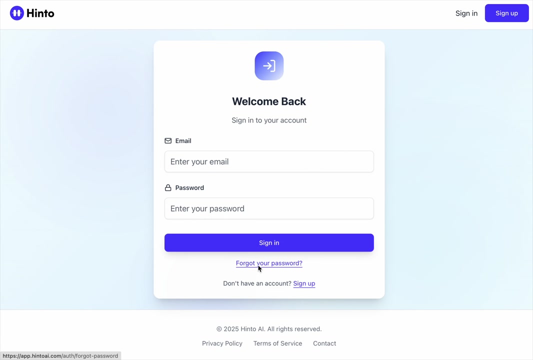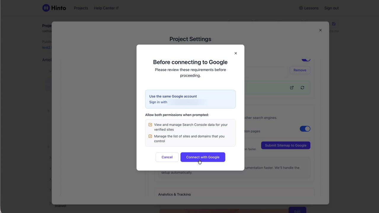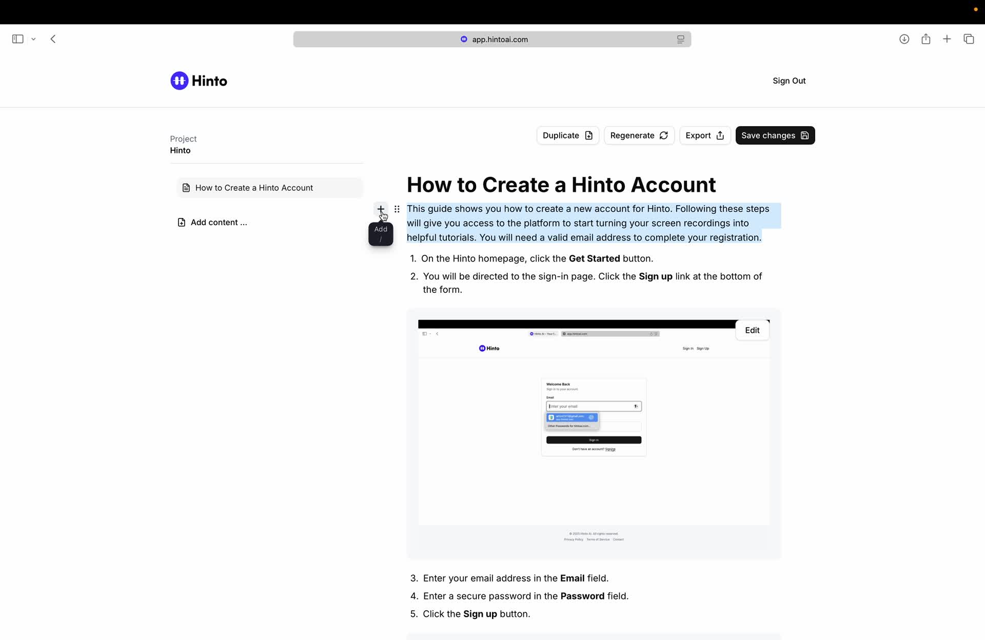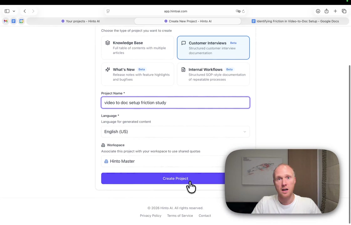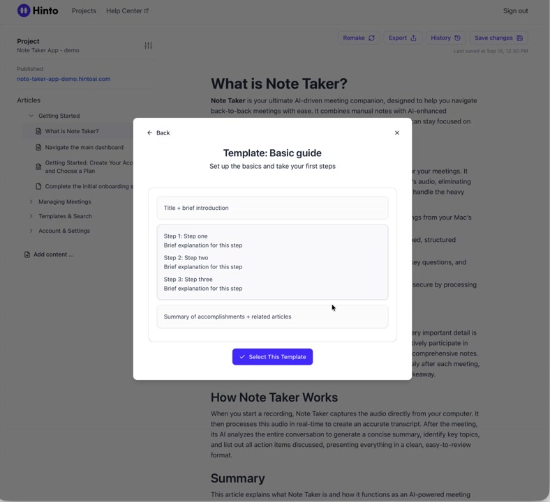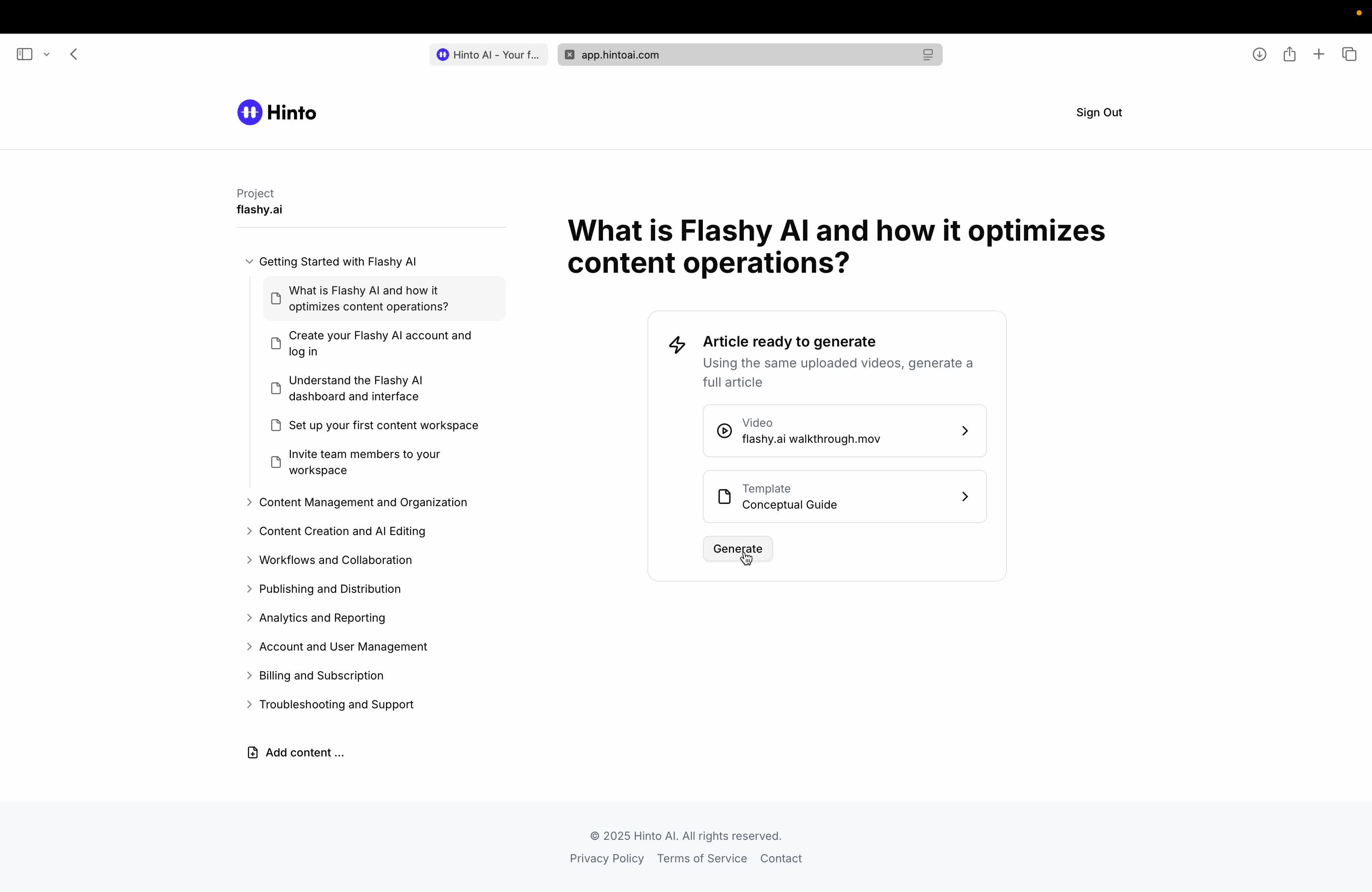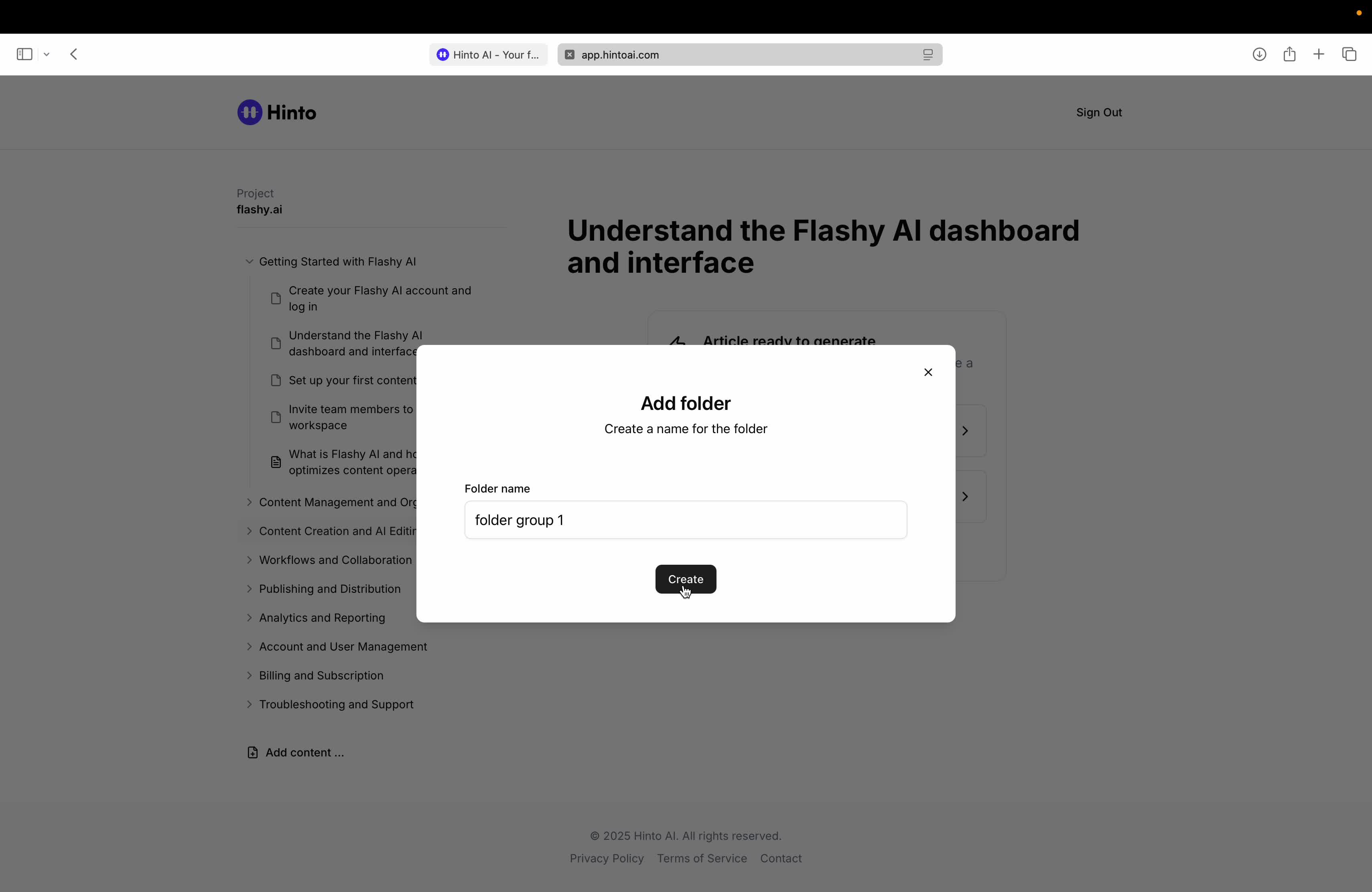 # Hinto AI --- ## Getting Started with Hinto AI ### Sign up and log in with Google # Sign up and log in with Google Hinto AI allows you to create an account and sign in using your existing Google account for a faster and more secure experience. This option is available on the main sign-up and sign-in pages, streamlining your access to the platform without needing to manage a separate password. ## Signing Up with Google If you are creating a new Hinto AI account, you can use your Google credentials to get started quickly. On the **Create Account** page, you will find the option to sign up with Google. 1. Navigate to the Hinto AI sign-up page. 2. Instead of filling out the email and password fields, click the **Sign up with Google** button. 3. A new window will open, prompting you to choose a Google account. Select the account you wish to use. 4. After selecting your account, you will be automatically authenticated and redirected to your Hinto AI projects dashboard.  ## Logging In with Google Once you have created an account using Google, you can use the same method to log in for subsequent sessions. The process is similar to signing up. 1. On the Hinto AI sign-in page, click the **Sign in with Google** button. 2. If you are already logged into your Google account in your browser, you may be logged into Hinto AI automatically. 3. If not, select your Google account from the list that appears. You will then be redirected to your dashboard. ### Important Considerations - **One Account, One Method:** If you sign up with Google, you should continue to log in with Google. An account created via Google OAuth is separate from an account created with the same email address and a password. - **Security:** Using Google for authentication leverages Google's security features, such as two-factor authentication (2FA), for your Hinto AI account. ## Summary This article explains how to use your Google account to both create and access your Hinto AI profile. By using the 'Sign up with Google' feature, you can bypass manual password creation for a streamlined and secure authentication process, getting you to your projects dashboard in just a few clicks. ## Related - [Create your Hinto AI account](/docs/getting-started-with-hinto-ai/create-your-hinto-ai-account) - [Log in into your Hinto AI account](/docs/getting-started-with-hinto-ai/log-in-into-your-hinto-ai-account) - [Create your first project](/docs/getting-started-with-hinto-ai/create-your-first-project) --- ### Complete the onboarding setup # Complete the onboarding setup After creating your Hinto AI account, you will be guided through a brief, multi-step onboarding process. This setup helps personalize your experience, create your first project, and prepares you to generate your first knowledge base. ## Step 1: Welcome to Hinto AI The first step helps us understand your needs better. You'll be asked to provide some basic information about yourself and your company. You must make a selection for each required field to proceed. - **How did you hear about Hinto AI?:** Select the source from the options provided. - **Company size:** Choose the option that best represents the number of employees in your company. - **What's your role?:** Select your current role from the list.  Once you have filled out all the fields, click the **Continue** button. ## Step 2: Create Your First Project Next, you will set up your first project. This project will house the documentation you generate. - **Project Name:** Enter a descriptive name for your project. - **Language:** Select the primary language for the content that will be generated.  Click **Continue** to move to the next step. ## Step 3: How Hinto AI Works A brief tutorial video will appear, providing a quick overview of how Hinto AI transforms your demos into a knowledge base. Watching this video is a great way to get acquainted with the platform's core functionality. When you are finished, click **Got it, Continue**.  ## Step 4: Upload Your First Video The final step is to upload your first screen recording. You can either drag and drop a file or click to select one from your computer. Hinto AI will use this video to automatically generate your knowledge base content. Supported formats include MP4, MOV, AVI, and WebM.  ### Tips for Using This Section If you prefer to explore the dashboard immediately, you can click the **Skip** button located in the top-right corner of the screen at any point during the onboarding process. This will take you directly to your project space. ## Summary This article provides a step-by-step guide to the Hinto AI onboarding flow. Following these steps allows you to personalize your account, create your first project, and upload a video to start generating content immediately after signing up. ## Related - [Create your Hinto AI account](/docs/getting-started-with-hinto-ai/create-your-hinto-ai-account) - [Create your first project](/docs/getting-started-with-hinto-ai/create-your-first-project) - [Generate a Knowledge Base](/docs/generating-content/generate-a-complete-knowledge-base-from-a-video) --- ### Log in into your Hinto AI account # How to Log In to Your Hinto AI Account This guide explains how to log in to your Hinto AI account. Following these steps will give you access to your projects and allow you to create new tutorials. You'll need the email address and password you used to register. 1. Navigate to the Hinto AI homepage and click the **Get Started** button in the top-right corner. 2. On the login page, enter your registered email address into the **Email** field. 3. Enter your password into the **Password** field. 4. Click the **Sign in** button to access your dashboard.  ### What If I Don't Have an Account? If you haven't created an account yet, click the **Sign up** link located below the **Sign in** button to register. --- ### What is Hinto AI and how it works? # What is Hinto AI and how it works? Hinto AI is a powerful platform designed to automate and accelerate the 