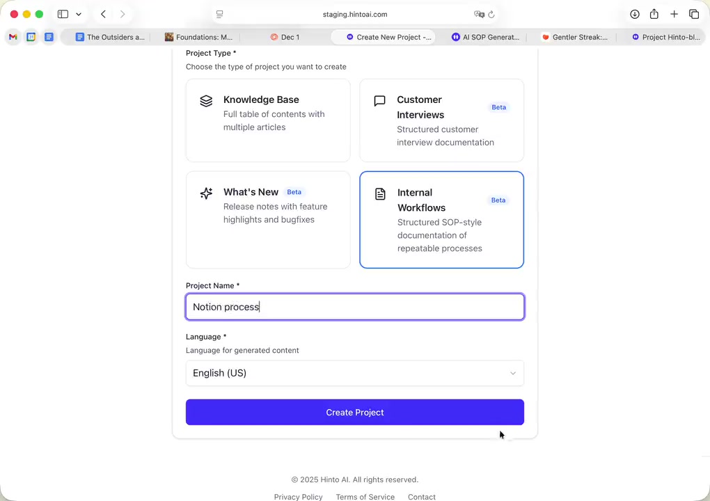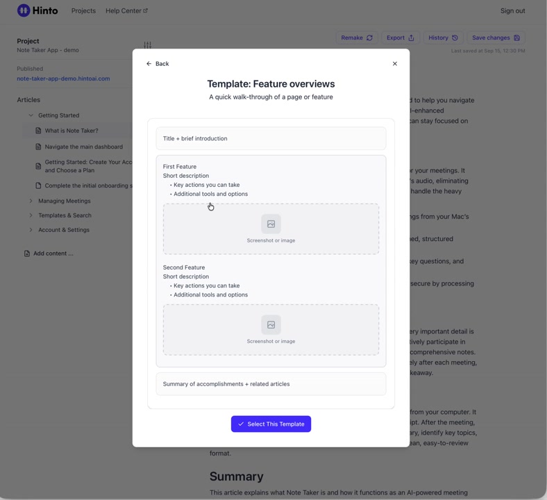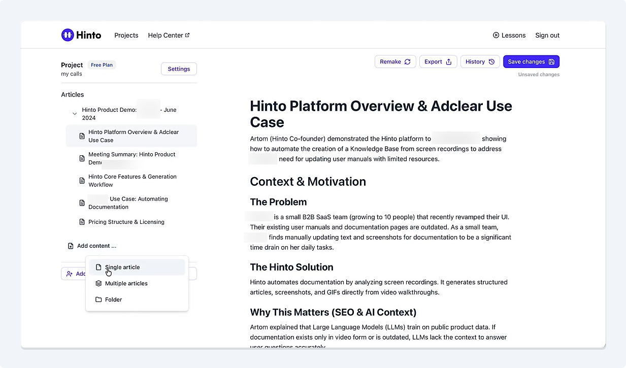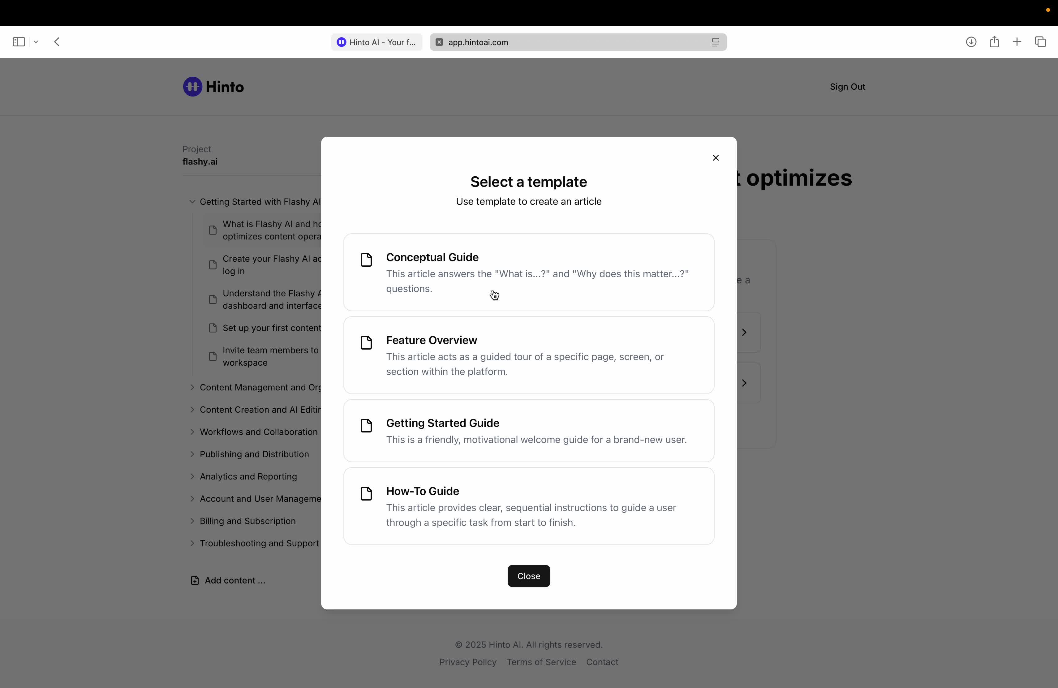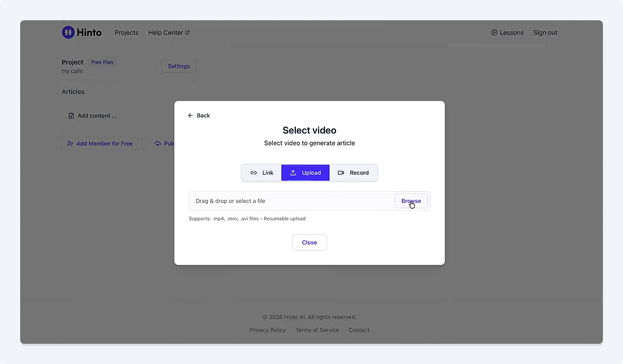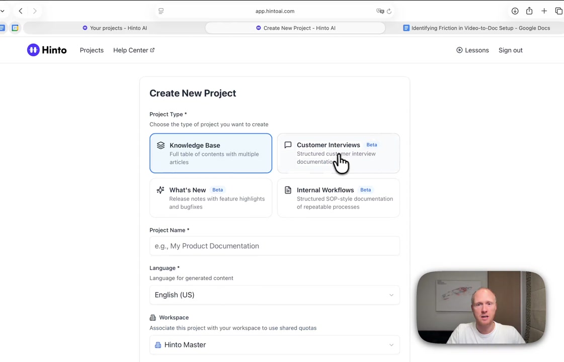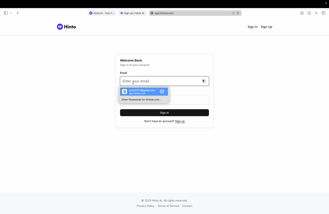# Hinto AI --- ## Getting Started with Hinto AI ### Sign up and log in with Google # Sign up and log in with Google Hinto AI allows you to create an account and sign in using your existing Google account for a faster and more secure experience. This option is available on the main sign-up and sign-in pages, streamlining your access to the platform without needing to manage a separate password. ## Signing Up with Google If you are creating a new Hinto AI account, you can use your Google credentials to get started quickly. On the **Create Account** page, you will find the option to sign up with Google. 1. Navigate to the Hinto AI sign-up page. 2. Instead of filling out the email and password fields, click the **Sign up with Google** button. 3. A new window will open, prompting you to choose a Google account. Select the account you wish to use. 4. After selecting your account, you will be automatically authenticated and redirected to your Hinto AI projects dashboard.  ## Logging In with Google Once you have created an account using Google, you can use the same method to log in for subsequent sessions. The process is similar to signing up. 1. On the Hinto AI sign-in page, click the **Sign in with Google** button. 2. If you are already logged into your Google account in your browser, you may be logged into Hinto AI automatically. 3. If not, select your Google account from the list that appears. You will then be redirected to your dashboard. ### Important Considerations - **One Account, One Method:** If you sign up with Google, you should continue to log in with Google. An account created via Google OAuth is separate from an account created with the same email address and a password. - **Security:** Using Google for authentication leverages Google's security features, such as two-factor authentication (2FA), for your Hinto AI account. ## Summary This article explains how to use your Google account to both create and access your Hinto AI profile. By using the 'Sign up with Google' feature, you can bypass manual password creation for a streamlined and secure authentication process, getting you to your projects dashboard in just a few clicks. ## Related - [Create your Hinto AI account](/docs/getting-started-with-hinto-ai/create-your-hinto-ai-account) - [Log in into your Hinto AI account](/docs/getting-started-with-hinto-ai/log-in-into-your-hinto-ai-account) - [Create your first project](/docs/getting-started-with-hinto-ai/create-your-first-project) --- ### Complete the onboarding setup # Complete the onboarding setup After creating your Hinto AI account, you will be guided through a brief, multi-step onboarding process. This setup helps personalize your experience, create your first project, and prepares you to generate your first knowledge base. ## Step 1: Welcome to Hinto AI The first step helps us understand your needs better. You'll be asked to provide some basic information about yourself and your company. You must make a selection for each required field to proceed. - **How did you hear about Hinto AI?:** Select the source from the options provided. - **Company size:** Choose the option that best represents the number of employees in your company. - **What's your role?:** Select your current role from the list.  Once you have filled out all the fields, click the **Continue** button. ## Step 2: Create Your First Project Next, you will set up your first project. This project will house the documentation you generate. - **Project Name:** Enter a descriptive name for your project. - **Language:** Select the primary language for the content that will be generated.  Click **Continue** to move to the next step. ## Step 3: How Hinto AI Works A brief tutorial video will appear, providing a quick overview of how Hinto AI transforms your demos into a knowledge base. Watching this video is a great way to get acquainted with the platform's core functionality. When you are finished, click **Got it, Continue**.  ## Step 4: Upload Your First Video The final step is to upload your first screen recording. You can either drag and drop a file or click to select one from your computer. Hinto AI will use this video to automatically generate your knowledge base content. Supported formats include MP4, MOV, AVI, and WebM.  ### Tips for Using This Section If you prefer to explore the dashboard immediately, you can click the **Skip** button located in the top-right corner of the screen at any point during the onboarding process. This will take you directly to your project space. ## Summary This article provides a step-by-step guide to the Hinto AI onboarding flow. Following these steps allows you to personalize your account, create your first project, and upload a video to start generating content immediately after signing up. ## Related - [Create your Hinto AI account](/docs/getting-started-with-hinto-ai/create-your-hinto-ai-account) - [Create your first project](/docs/getting-started-with-hinto-ai/create-your-first-project) - [Generate a Knowledge Base](/docs/generating-content/generate-a-complete-knowledge-base-from-a-video) --- ### Log in into your Hinto AI account # How to Log In to Your Hinto AI Account This guide explains how to log in to your Hinto AI account. Following these steps will give you access to your projects and allow you to create new tutorials. You'll need the email address and password you used to register. 1. Navigate to the Hinto AI homepage and click the **Get Started** button in the top-right corner. 2. On the login page, enter your registered email address into the **Email** field. 3. Enter your password into the **Password** field. 4. Click the **Sign in** button to access your dashboard.  ### What If I Don't Have an Account? If you haven't created an account yet, click the **Sign up** link located below the **Sign in** button to register. --- ### What is Hinto AI and how it works? # What is Hinto AI and how it works? Hinto AI is a powerful platform designed to automate and accelerate the 