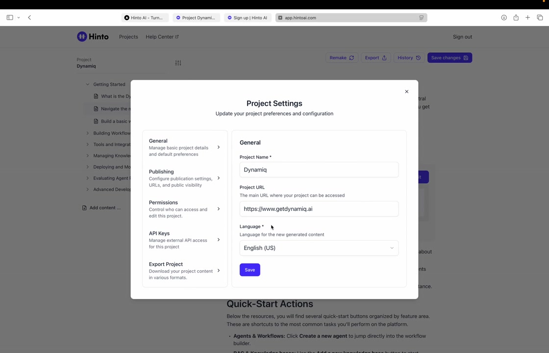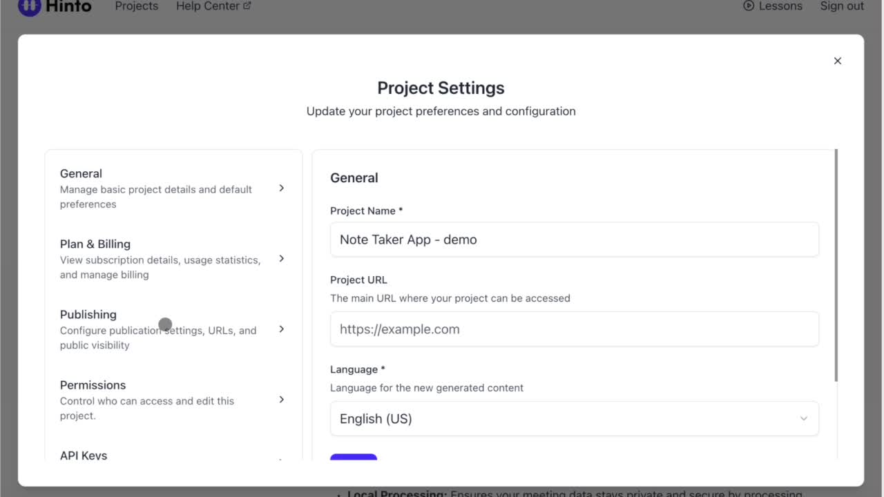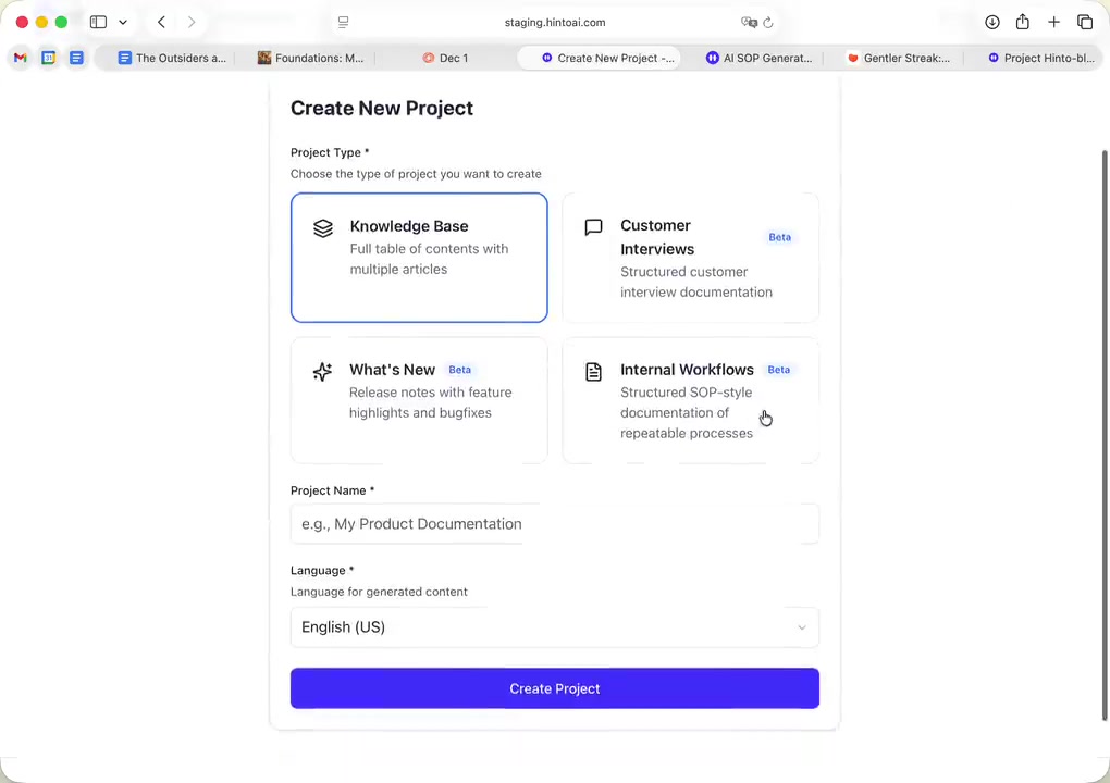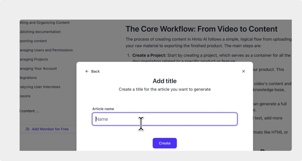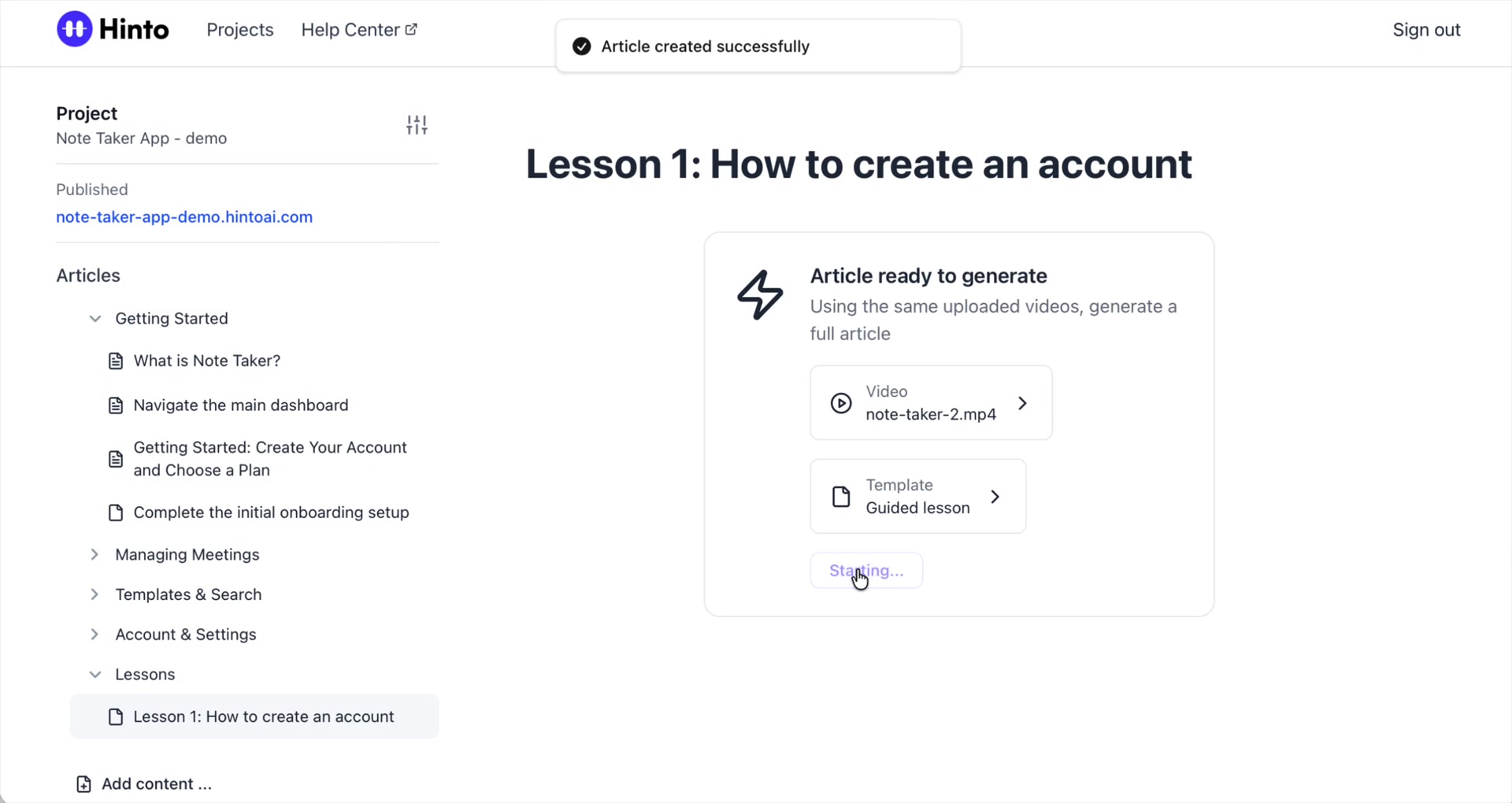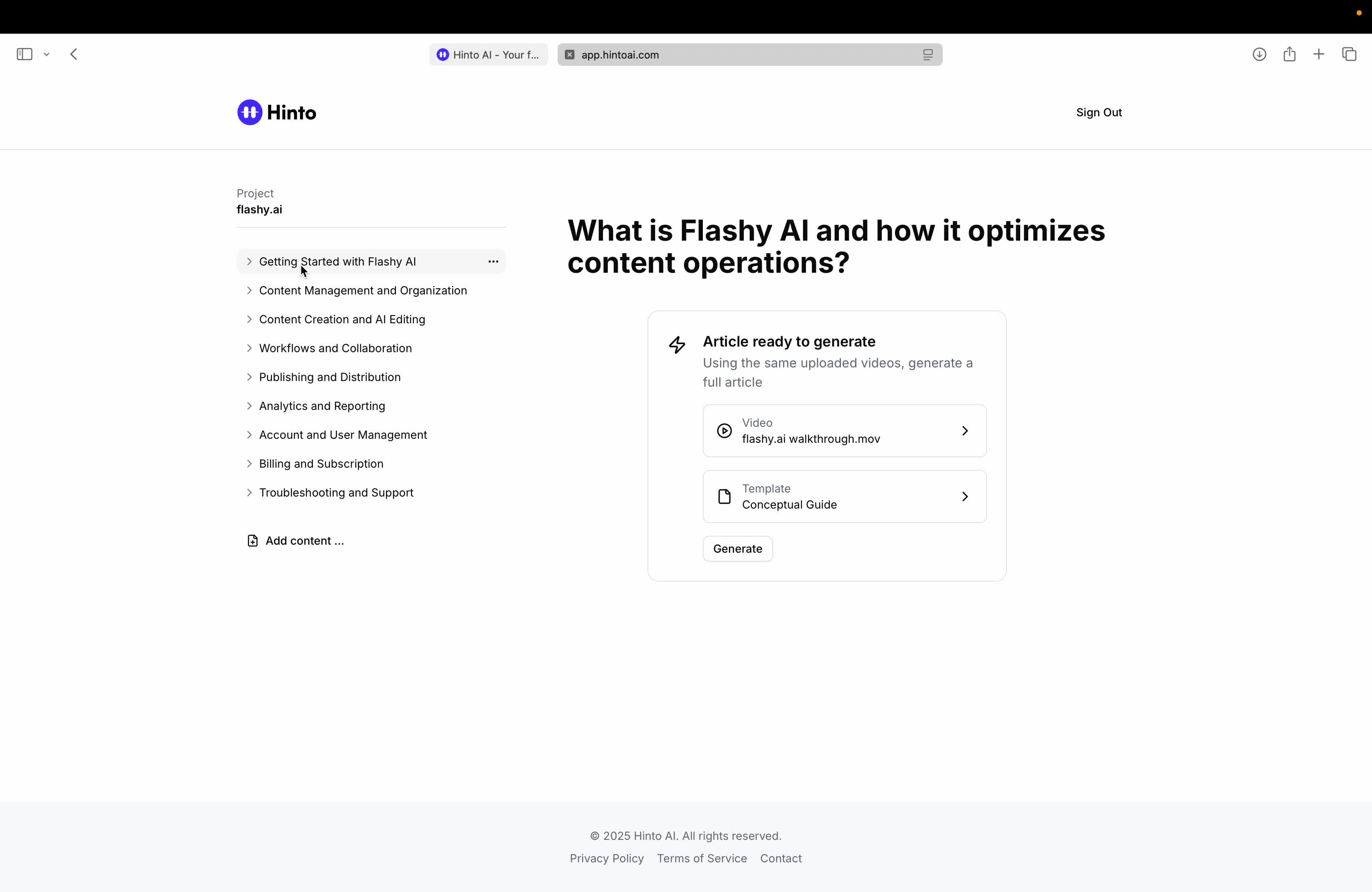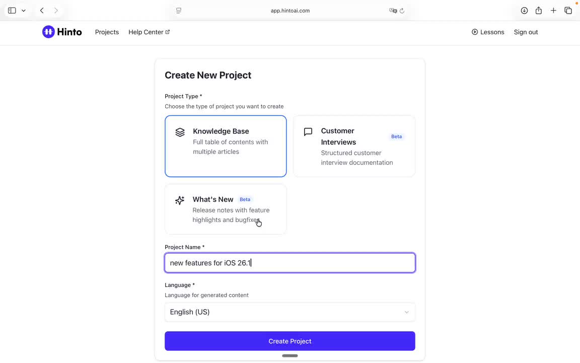 # Hinto AI --- ## Getting Started with Hinto AI ### Sign up and log in with Google # Sign up and log in with Google Hinto AI allows you to create an account and sign in using your existing Google account for a faster and more secure experience. This option is available on the main sign-up and sign-in pages, streamlining your access to the platform without needing to manage a separate password. ## Signing Up with Google If you are creating a new Hinto AI account, you can use your Google credentials to get started quickly. On the **Create Account** page, you will find the option to sign up with Google. 1. Navigate to the Hinto AI sign-up page. 2. Instead of filling out the email and password fields, click the **Sign up with Google** button. 3. A new window will open, prompting you to choose a Google account. Select the account you wish to use. 4. After selecting your account, you will be automatically authenticated and redirected to your Hinto AI projects dashboard.  ## Logging In with Google Once you have created an account using Google, you can use the same method to log in for subsequent sessions. The process is similar to signing up. 1. On the Hinto AI sign-in page, click the **Sign in with Google** button. 2. If you are already logged into your Google account in your browser, you may be logged into Hinto AI automatically. 3. If not, select your Google account from the list that appears. You will then be redirected to your dashboard. ### Important Considerations - **One Account, One Method:** If you sign up with Google, you should continue to log in with Google. An account created via Google OAuth is separate from an account created with the same email address and a password. - **Security:** Using Google for authentication leverages Google's security features, such as two-factor authentication (2FA), for your Hinto AI account. ## Summary This article explains how to use your Google account to both create and access your Hinto AI profile. By using the 'Sign up with Google' feature, you can bypass manual password creation for a streamlined and secure authentication process, getting you to your projects dashboard in just a few clicks. ## Related - [Create your Hinto AI account](/docs/getting-started-with-hinto-ai/create-your-hinto-ai-account) - [Log in into your Hinto AI account](/docs/getting-started-with-hinto-ai/log-in-into-your-hinto-ai-account) - [Create your first project](/docs/getting-started-with-hinto-ai/create-your-first-project) --- ### Complete the onboarding setup # Complete the onboarding setup After creating your Hinto AI account, you will be guided through a brief, multi-step onboarding process. This setup helps personalize your experience, create your first project, and prepares you to generate your first knowledge base. ## Step 1: Welcome to Hinto AI The first step helps us understand your needs better. You'll be asked to provide some basic information about yourself and your company. You must make a selection for each required field to proceed. - **How did you hear about Hinto AI?:** Select the source from the options provided. - **Company size:** Choose the option that best represents the number of employees in your company. - **What's your role?:** Select your current role from the list.  Once you have filled out all the fields, click the **Continue** button. ## Step 2: Create Your First Project Next, you will set up your first project. This project will house the documentation you generate. - **Project Name:** Enter a descriptive name for your project. - **Language:** Select the primary language for the content that will be generated.  Click **Continue** to move to the next step. ## Step 3: How Hinto AI Works A brief tutorial video will appear, providing a quick overview of how Hinto AI transforms your demos into a knowledge base. Watching this video is a great way to get acquainted with the platform's core functionality. When you are finished, click **Got it, Continue**.  ## Step 4: Upload Your First Video The final step is to upload your first screen recording. You can either drag and drop a file or click to select one from your computer. Hinto AI will use this video to automatically generate your knowledge base content. Supported formats include MP4, MOV, AVI, and WebM.  ### Tips for Using This Section If you prefer to explore the dashboard immediately, you can click the **Skip** button located in the top-right corner of the screen at any point during the onboarding process. This will take you directly to your project space. ## Summary This article provides a step-by-step guide to the Hinto AI onboarding flow. Following these steps allows you to personalize your account, create your first project, and upload a video to start generating content immediately after signing up. ## Related - [Create your Hinto AI account](/docs/getting-started-with-hinto-ai/create-your-hinto-ai-account) - [Create your first project](/docs/getting-started-with-hinto-ai/create-your-first-project) - [Generate a Knowledge Base](/docs/generating-content/generate-a-complete-knowledge-base-from-a-video) --- ### Log in into your Hinto AI account # How to Log In to Your Hinto AI Account This guide explains how to log in to your Hinto AI account. Following these steps will give you access to your projects and allow you to create new tutorials. You'll need the email address and password you used to register. 1. Navigate to the Hinto AI homepage and click the **Get Started** button in the top-right corner. 2. On the login page, enter your registered email address into the **Email** field. 3. Enter your password into the **Password** field. 4. Click the **Sign in** button to access your dashboard.  ### What If I Don't Have an Account? If you haven't created an account yet, click the **Sign up** link located below the **Sign in** button to register. --- ### What is Hinto AI and how it works? # What is Hinto AI and how it works? Hinto AI is a powerful platform designed to automate and accelerate the 