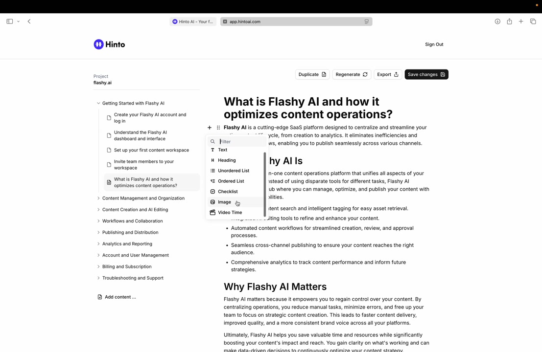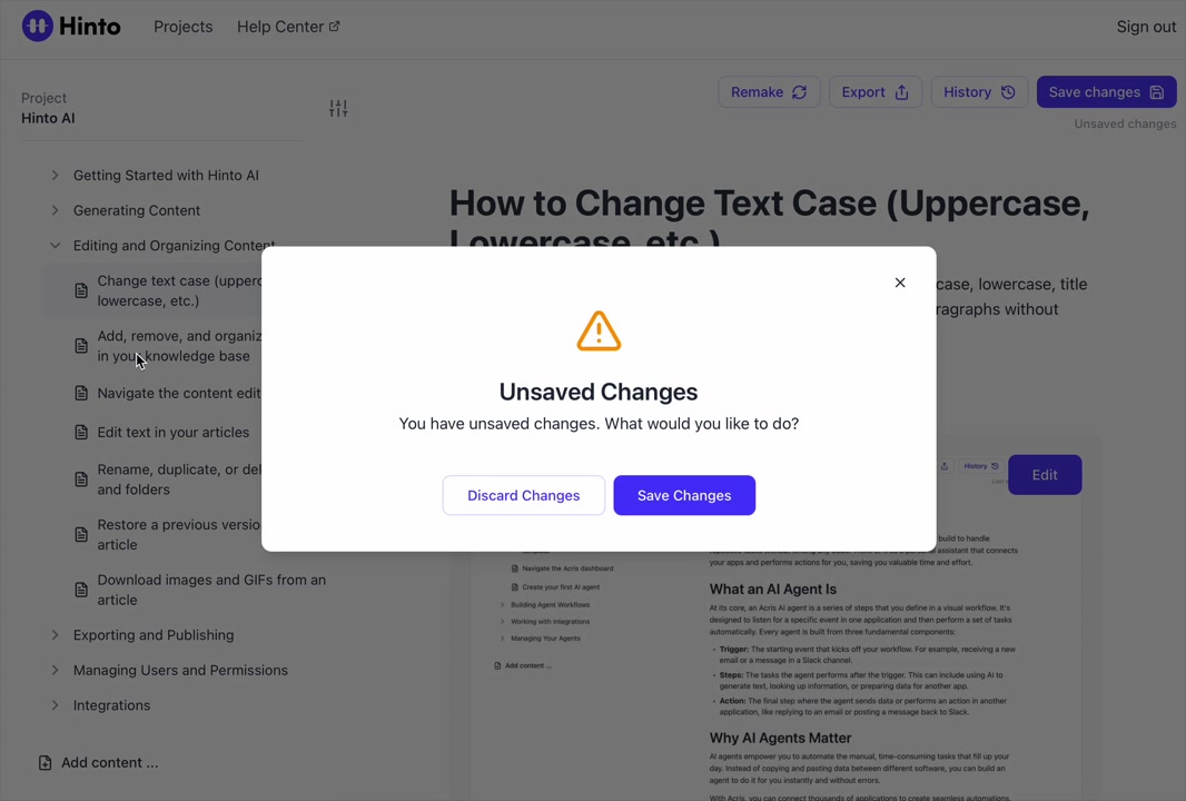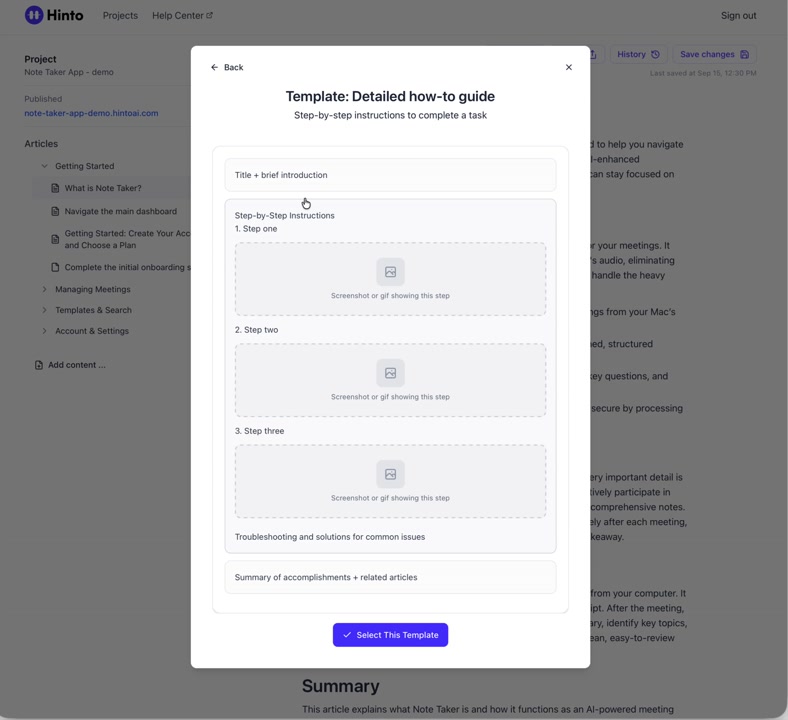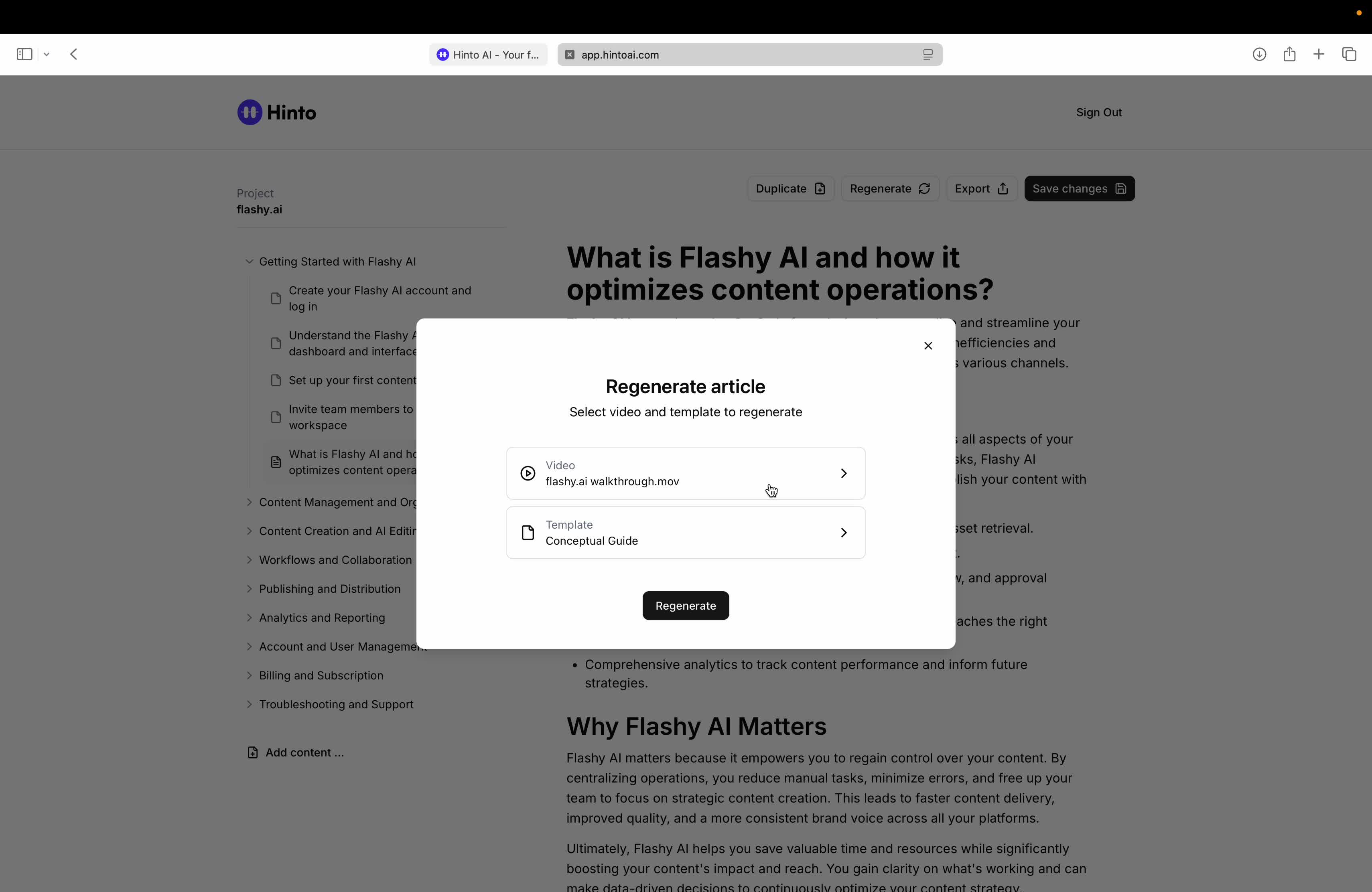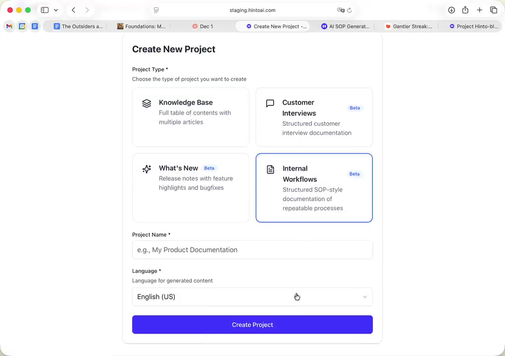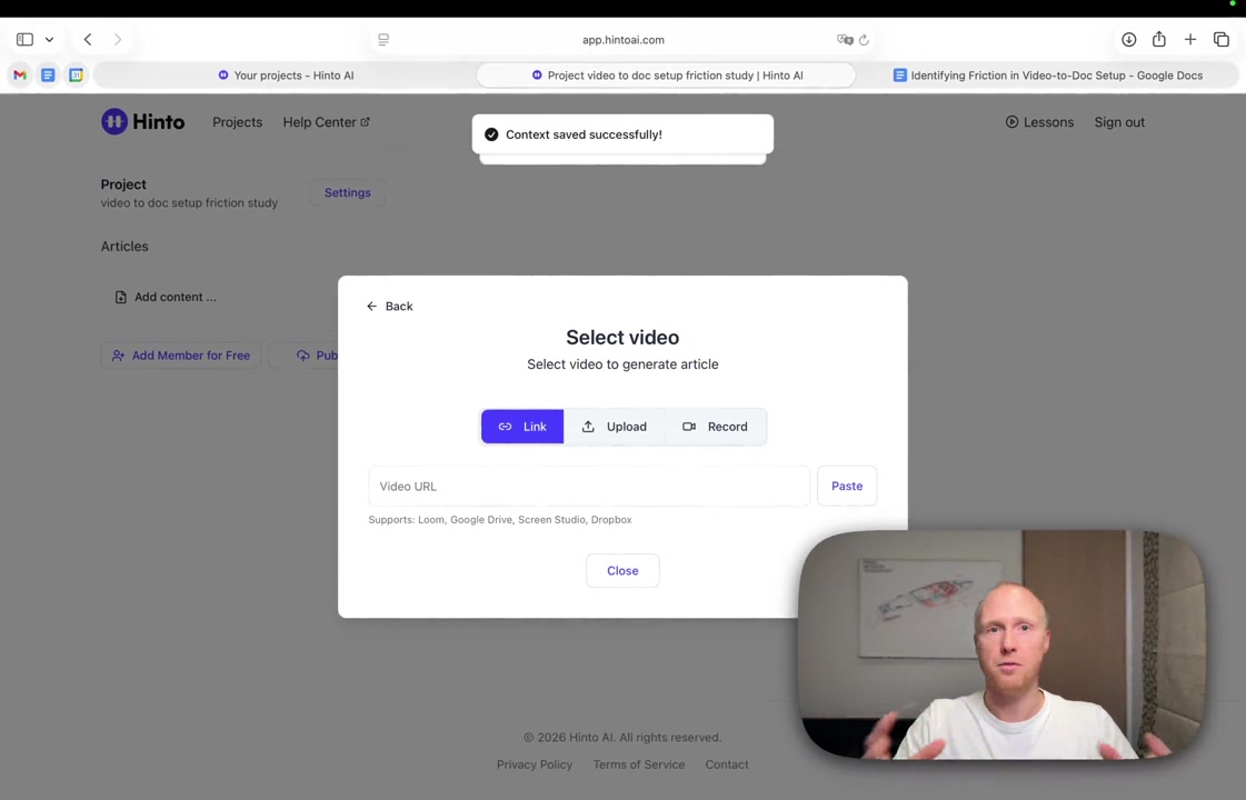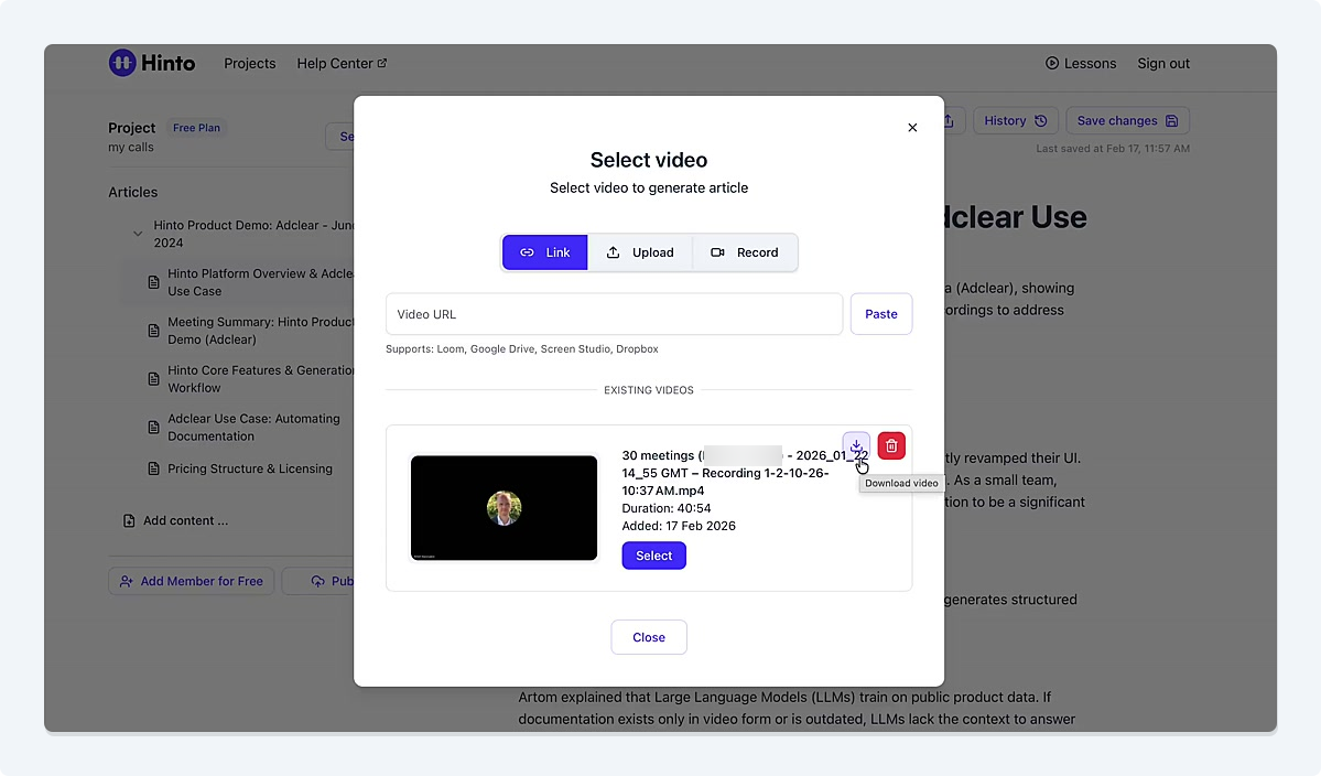 # Hinto AI --- ## Getting Started with Hinto AI ### Sign up and log in with Google # Sign up and log in with Google Hinto AI allows you to create an account and sign in using your existing Google account for a faster and more secure experience. This option is available on the main sign-up and sign-in pages, streamlining your access to the platform without needing to manage a separate password. ## Signing Up with Google If you are creating a new Hinto AI account, you can use your Google credentials to get started quickly. On the **Create Account** page, you will find the option to sign up with Google. 1. Navigate to the Hinto AI sign-up page. 2. Instead of filling out the email and password fields, click the **Sign up with Google** button. 3. A new window will open, prompting you to choose a Google account. Select the account you wish to use. 4. After selecting your account, you will be automatically authenticated and redirected to your Hinto AI projects dashboard.  ## Logging In with Google Once you have created an account using Google, you can use the same method to log in for subsequent sessions. The process is similar to signing up. 1. On the Hinto AI sign-in page, click the **Sign in with Google** button. 2. If you are already logged into your Google account in your browser, you may be logged into Hinto AI automatically. 3. If not, select your Google account from the list that appears. You will then be redirected to your dashboard. ### Important Considerations - **One Account, One Method:** If you sign up with Google, you should continue to log in with Google. An account created via Google OAuth is separate from an account created with the same email address and a password. - **Security:** Using Google for authentication leverages Google's security features, such as two-factor authentication (2FA), for your Hinto AI account. ## Summary This article explains how to use your Google account to both create and access your Hinto AI profile. By using the 'Sign up with Google' feature, you can bypass manual password creation for a streamlined and secure authentication process, getting you to your projects dashboard in just a few clicks. ## Related - [Create your Hinto AI account](/docs/getting-started-with-hinto-ai/create-your-hinto-ai-account) - [Log in into your Hinto AI account](/docs/getting-started-with-hinto-ai/log-in-into-your-hinto-ai-account) - [Create your first project](/docs/getting-started-with-hinto-ai/create-your-first-project) --- ### Complete the onboarding setup # Complete the onboarding setup After creating your Hinto AI account, you will be guided through a brief, multi-step onboarding process. This setup helps personalize your experience, create your first project, and prepares you to generate your first knowledge base. ## Step 1: Welcome to Hinto AI The first step helps us understand your needs better. You'll be asked to provide some basic information about yourself and your company. You must make a selection for each required field to proceed. - **How did you hear about Hinto AI?:** Select the source from the options provided. - **Company size:** Choose the option that best represents the number of employees in your company. - **What's your role?:** Select your current role from the list.  Once you have filled out all the fields, click the **Continue** button. ## Step 2: Create Your First Project Next, you will set up your first project. This project will house the documentation you generate. - **Project Name:** Enter a descriptive name for your project. - **Language:** Select the primary language for the content that will be generated.  Click **Continue** to move to the next step. ## Step 3: How Hinto AI Works A brief tutorial video will appear, providing a quick overview of how Hinto AI transforms your demos into a knowledge base. Watching this video is a great way to get acquainted with the platform's core functionality. When you are finished, click **Got it, Continue**.  ## Step 4: Upload Your First Video The final step is to upload your first screen recording. You can either drag and drop a file or click to select one from your computer. Hinto AI will use this video to automatically generate your knowledge base content. Supported formats include MP4, MOV, AVI, and WebM.  ### Tips for Using This Section If you prefer to explore the dashboard immediately, you can click the **Skip** button located in the top-right corner of the screen at any point during the onboarding process. This will take you directly to your project space. ## Summary This article provides a step-by-step guide to the Hinto AI onboarding flow. Following these steps allows you to personalize your account, create your first project, and upload a video to start generating content immediately after signing up. ## Related - [Create your Hinto AI account](/docs/getting-started-with-hinto-ai/create-your-hinto-ai-account) - [Create your first project](/docs/getting-started-with-hinto-ai/create-your-first-project) - [Generate a Knowledge Base](/docs/generating-content/generate-a-complete-knowledge-base-from-a-video) --- ### Log in into your Hinto AI account # How to Log In to Your Hinto AI Account This guide explains how to log in to your Hinto AI account. Following these steps will give you access to your projects and allow you to create new tutorials. You'll need the email address and password you used to register. 1. Navigate to the Hinto AI homepage and click the **Get Started** button in the top-right corner. 2. On the login page, enter your registered email address into the **Email** field. 3. Enter your password into the **Password** field. 4. Click the **Sign in** button to access your dashboard.  ### What If I Don't Have an Account? If you haven't created an account yet, click the **Sign up** link located below the **Sign in** button to register. --- ### What is Hinto AI and how it works? # What is Hinto AI and how it works? Hinto AI is a powerful platform designed to automate and accelerate the 
