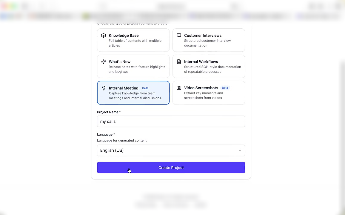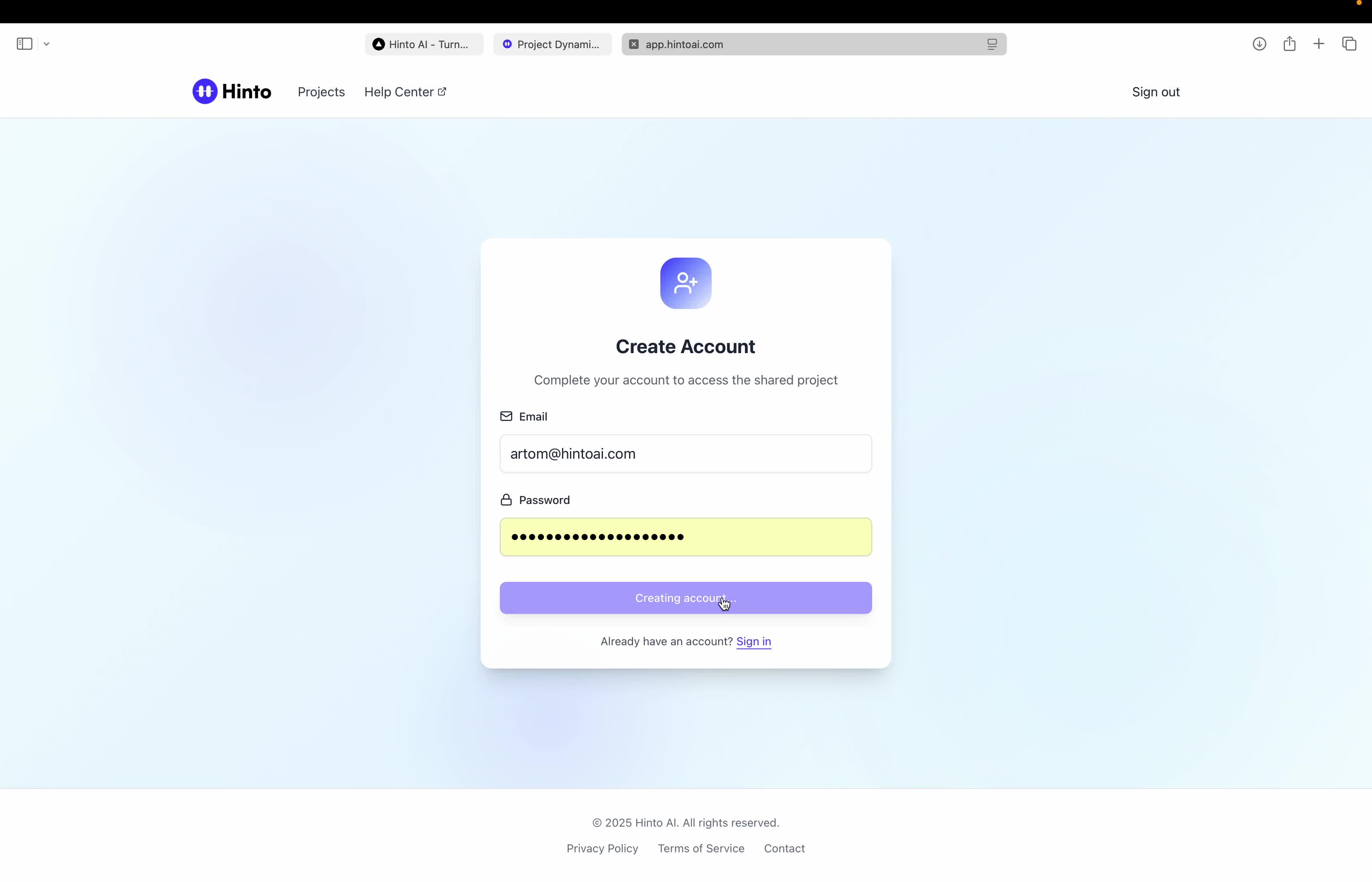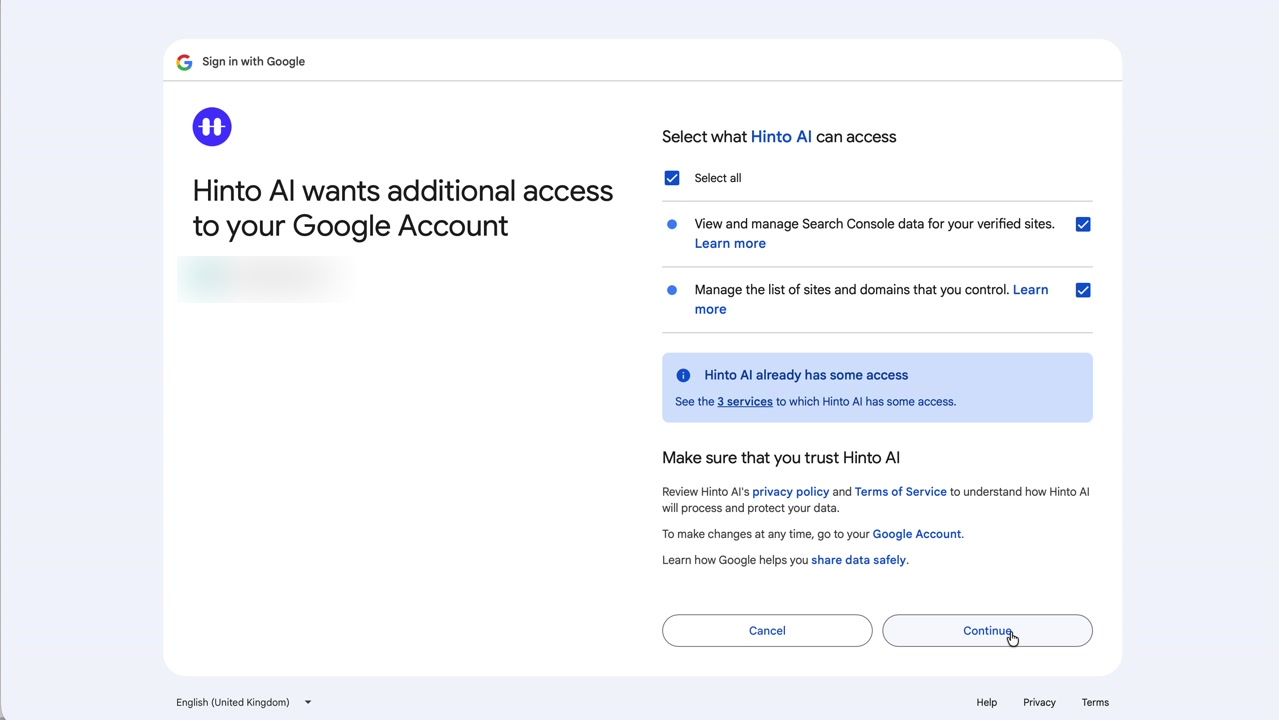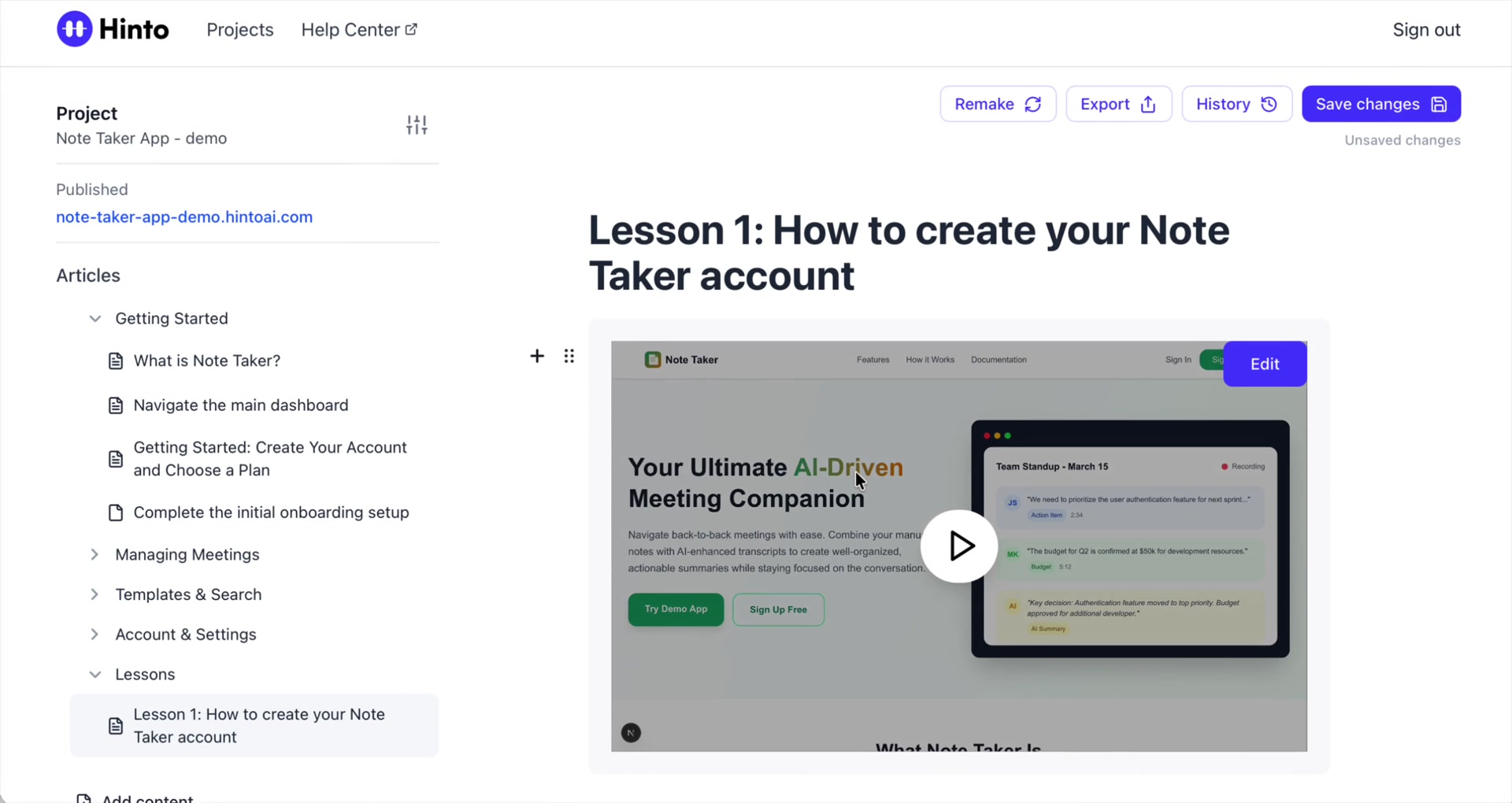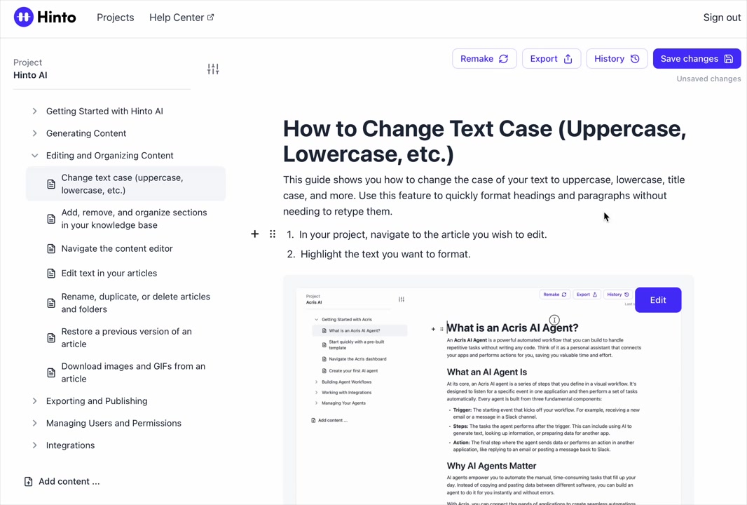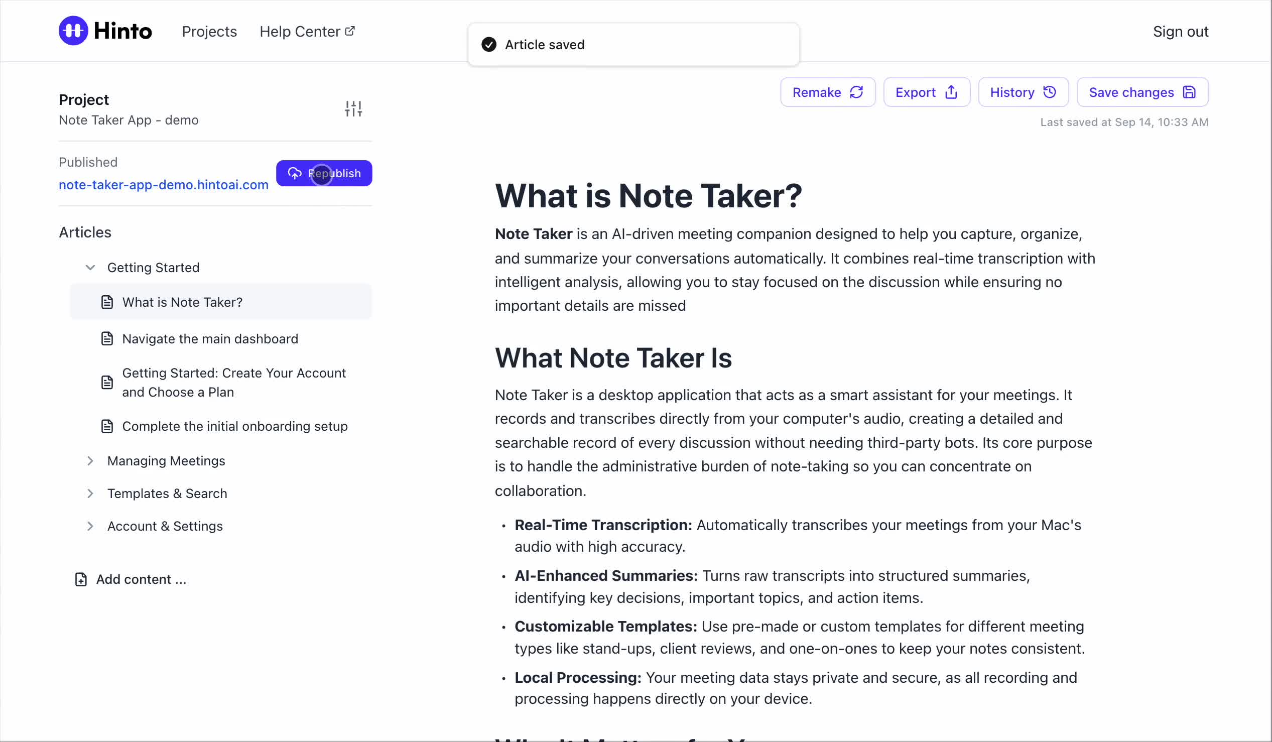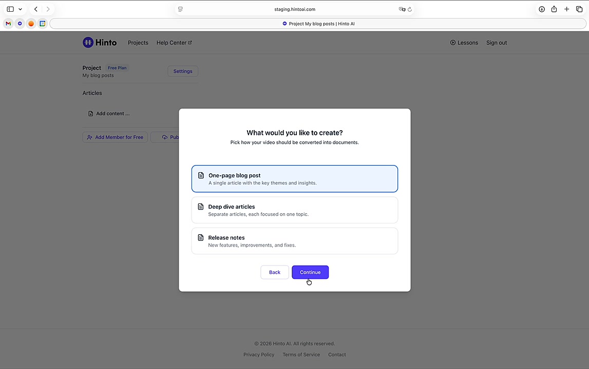# Hinto AI --- ## Getting Started with Hinto AI ### Sign up and log in with Google # Sign up and log in with Google Hinto AI allows you to create an account and sign in using your existing Google account for a faster and more secure experience. This option is available on the main sign-up and sign-in pages, streamlining your access to the platform without needing to manage a separate password. ## Signing Up with Google If you are creating a new Hinto AI account, you can use your Google credentials to get started quickly. On the **Create Account** page, you will find the option to sign up with Google. 1. Navigate to the Hinto AI sign-up page. 2. Instead of filling out the email and password fields, click the **Sign up with Google** button. 3. A new window will open, prompting you to choose a Google account. Select the account you wish to use. 4. After selecting your account, you will be automatically authenticated and redirected to your Hinto AI projects dashboard.  ## Logging In with Google Once you have created an account using Google, you can use the same method to log in for subsequent sessions. The process is similar to signing up. 1. On the Hinto AI sign-in page, click the **Sign in with Google** button. 2. If you are already logged into your Google account in your browser, you may be logged into Hinto AI automatically. 3. If not, select your Google account from the list that appears. You will then be redirected to your dashboard. ### Important Considerations - **One Account, One Method:** If you sign up with Google, you should continue to log in with Google. An account created via Google OAuth is separate from an account created with the same email address and a password. - **Security:** Using Google for authentication leverages Google's security features, such as two-factor authentication (2FA), for your Hinto AI account. ## Summary This article explains how to use your Google account to both create and access your Hinto AI profile. By using the 'Sign up with Google' feature, you can bypass manual password creation for a streamlined and secure authentication process, getting you to your projects dashboard in just a few clicks. ## Related - [Create your Hinto AI account](/docs/getting-started-with-hinto-ai/create-your-hinto-ai-account) - [Log in into your Hinto AI account](/docs/getting-started-with-hinto-ai/log-in-into-your-hinto-ai-account) - [Create your first project](/docs/getting-started-with-hinto-ai/create-your-first-project) --- ### Complete the onboarding setup # Complete the onboarding setup After creating your Hinto AI account, you will be guided through a brief, multi-step onboarding process. This setup helps personalize your experience, create your first project, and prepares you to generate your first knowledge base. ## Step 1: Welcome to Hinto AI The first step helps us understand your needs better. You'll be asked to provide some basic information about yourself and your company. You must make a selection for each required field to proceed. - **How did you hear about Hinto AI?:** Select the source from the options provided. - **Company size:** Choose the option that best represents the number of employees in your company. - **What's your role?:** Select your current role from the list.  Once you have filled out all the fields, click the **Continue** button. ## Step 2: Create Your First Project Next, you will set up your first project. This project will house the documentation you generate. - **Project Name:** Enter a descriptive name for your project. - **Language:** Select the primary language for the content that will be generated.  Click **Continue** to move to the next step. ## Step 3: How Hinto AI Works A brief tutorial video will appear, providing a quick overview of how Hinto AI transforms your demos into a knowledge base. Watching this video is a great way to get acquainted with the platform's core functionality. When you are finished, click **Got it, Continue**.  ## Step 4: Upload Your First Video The final step is to upload your first screen recording. You can either drag and drop a file or click to select one from your computer. Hinto AI will use this video to automatically generate your knowledge base content. Supported formats include MP4, MOV, AVI, and WebM.  ### Tips for Using This Section If you prefer to explore the dashboard immediately, you can click the **Skip** button located in the top-right corner of the screen at any point during the onboarding process. This will take you directly to your project space. ## Summary This article provides a step-by-step guide to the Hinto AI onboarding flow. Following these steps allows you to personalize your account, create your first project, and upload a video to start generating content immediately after signing up. ## Related - [Create your Hinto AI account](/docs/getting-started-with-hinto-ai/create-your-hinto-ai-account) - [Create your first project](/docs/getting-started-with-hinto-ai/create-your-first-project) - [Generate a Knowledge Base](/docs/generating-content/generate-a-complete-knowledge-base-from-a-video) --- ### Log in into your Hinto AI account # How to Log In to Your Hinto AI Account This guide explains how to log in to your Hinto AI account. Following these steps will give you access to your projects and allow you to create new tutorials. You'll need the email address and password you used to register. 1. Navigate to the Hinto AI homepage and click the **Get Started** button in the top-right corner. 2. On the login page, enter your registered email address into the **Email** field. 3. Enter your password into the **Password** field. 4. Click the **Sign in** button to access your dashboard.  ### What If I Don't Have an Account? If you haven't created an account yet, click the **Sign up** link located below the **Sign in** button to register. --- ### What is Hinto AI and how it works? # What is Hinto AI and how it works? Hinto AI is a powerful platform designed to automate and accelerate the 
