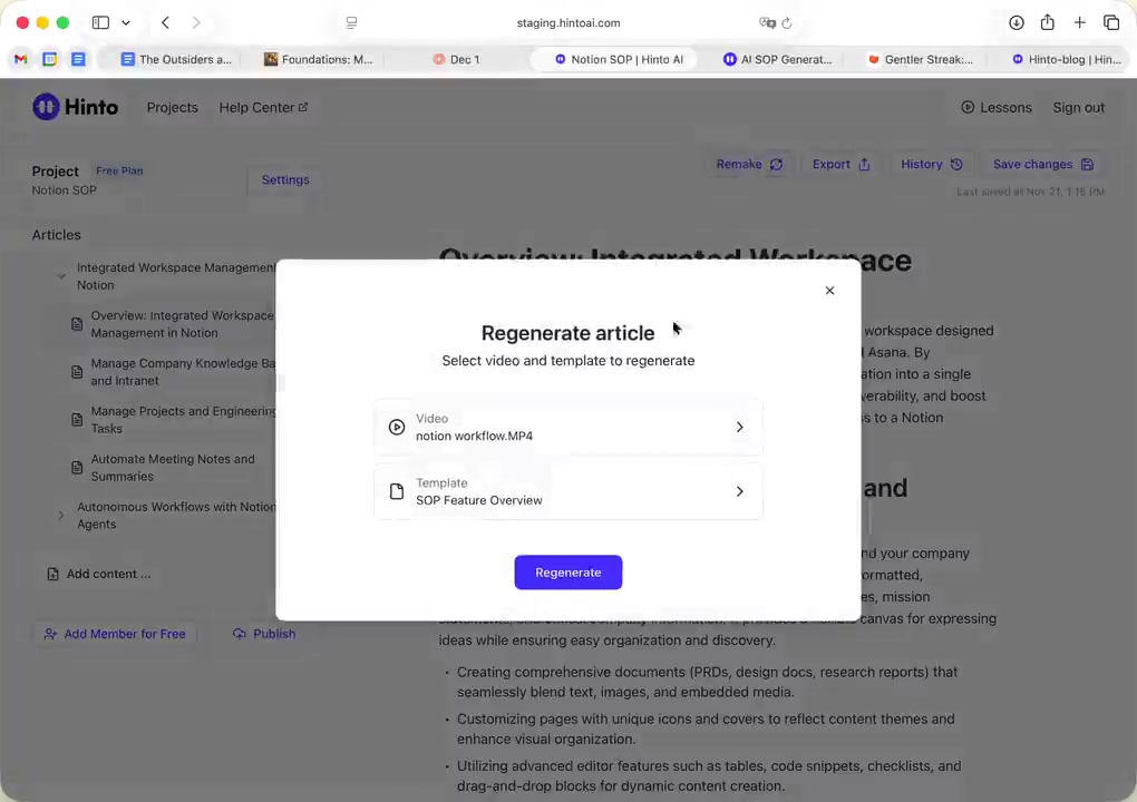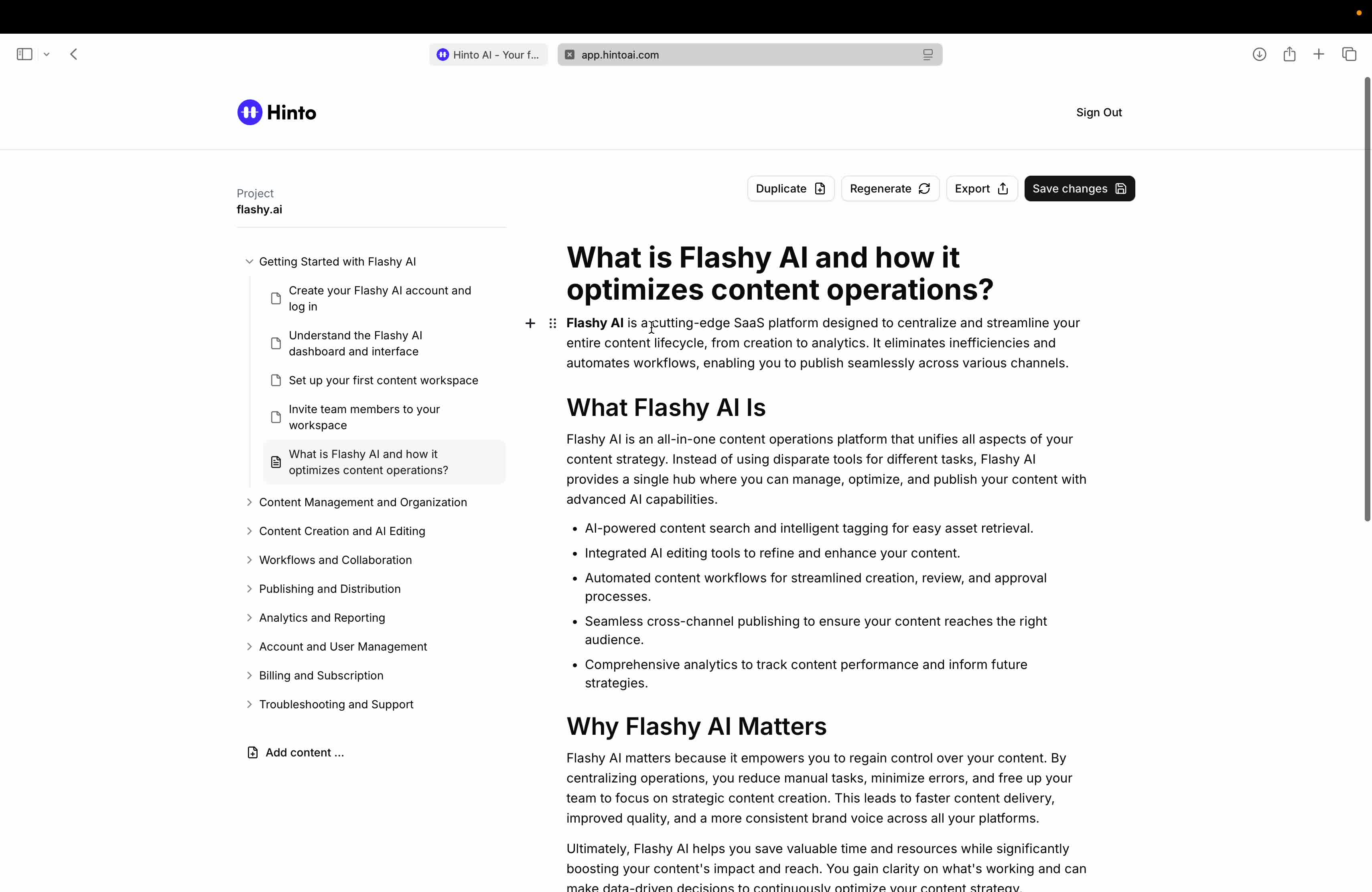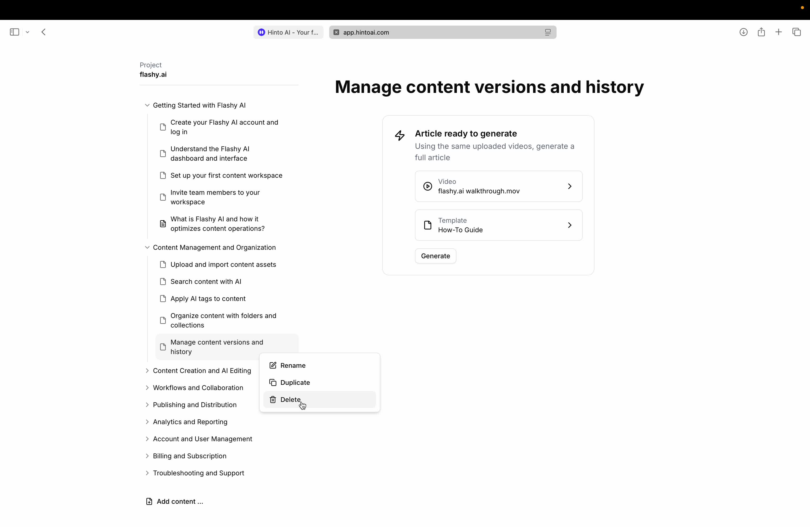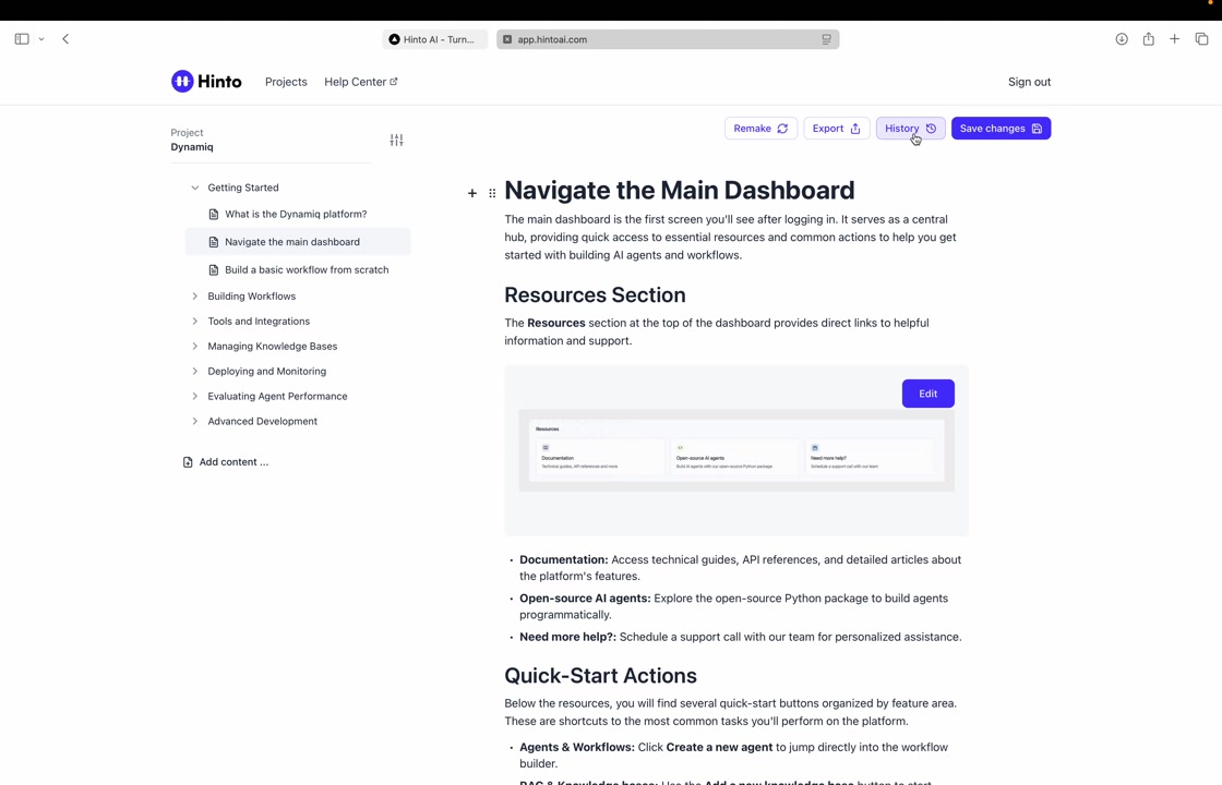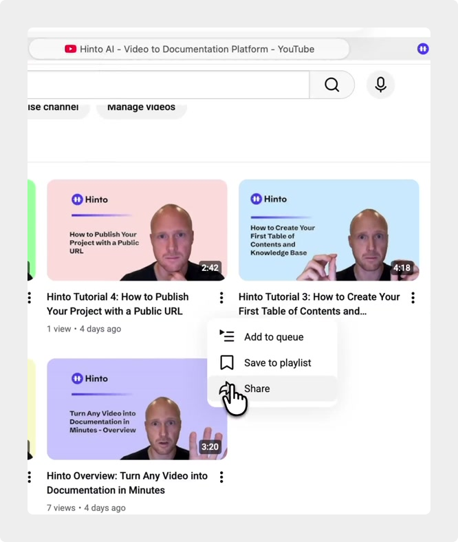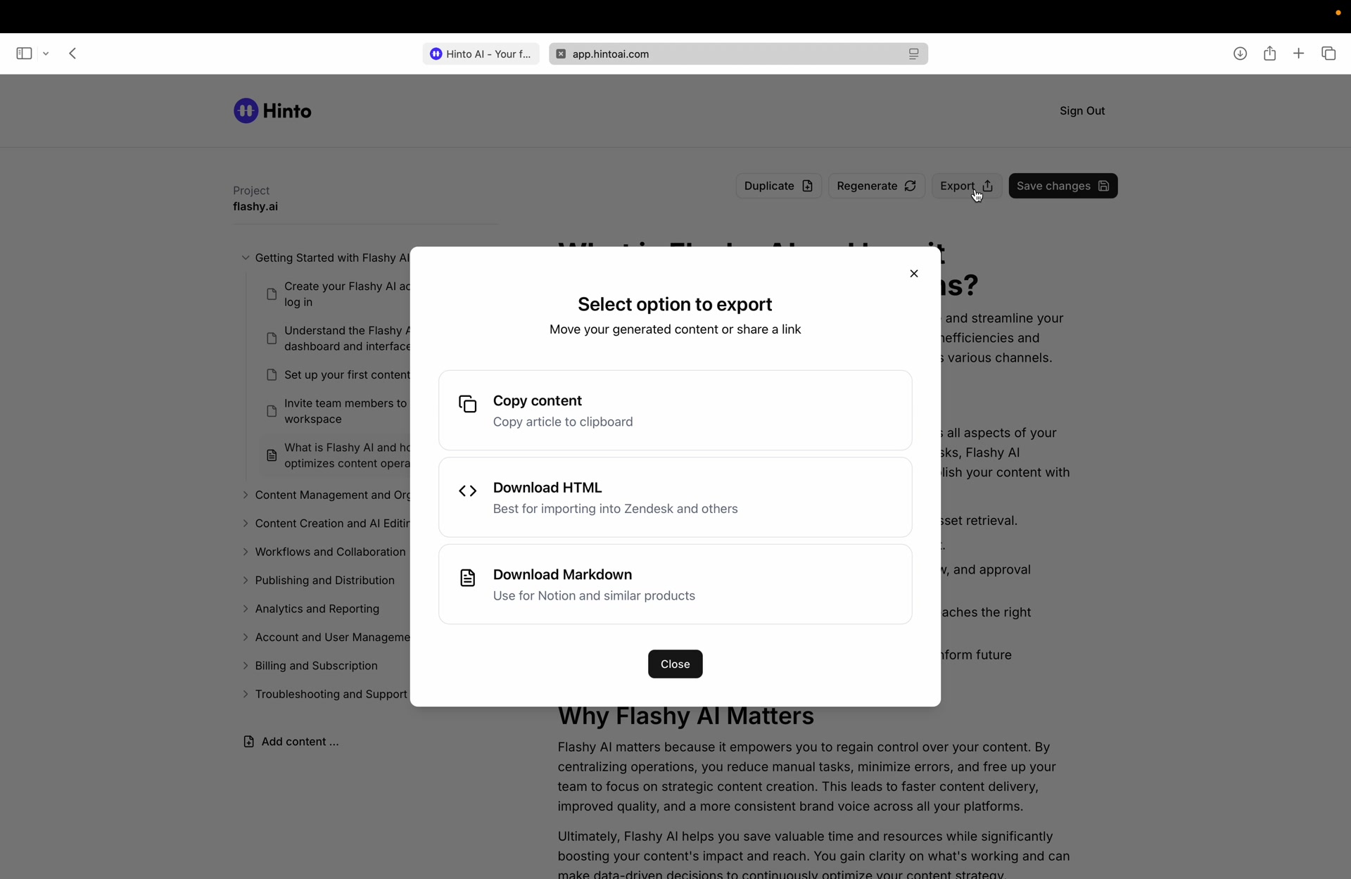 # Hinto AI --- ## Getting Started with Hinto AI ### Sign up and log in with Google # Sign up and log in with Google Hinto AI allows you to create an account and sign in using your existing Google account for a faster and more secure experience. This option is available on the main sign-up and sign-in pages, streamlining your access to the platform without needing to manage a separate password. ## Signing Up with Google If you are creating a new Hinto AI account, you can use your Google credentials to get started quickly. On the **Create Account** page, you will find the option to sign up with Google. 1. Navigate to the Hinto AI sign-up page. 2. Instead of filling out the email and password fields, click the **Sign up with Google** button. 3. A new window will open, prompting you to choose a Google account. Select the account you wish to use. 4. After selecting your account, you will be automatically authenticated and redirected to your Hinto AI projects dashboard.  ## Logging In with Google Once you have created an account using Google, you can use the same method to log in for subsequent sessions. The process is similar to signing up. 1. On the Hinto AI sign-in page, click the **Sign in with Google** button. 2. If you are already logged into your Google account in your browser, you may be logged into Hinto AI automatically. 3. If not, select your Google account from the list that appears. You will then be redirected to your dashboard. ### Important Considerations - **One Account, One Method:** If you sign up with Google, you should continue to log in with Google. An account created via Google OAuth is separate from an account created with the same email address and a password. - **Security:** Using Google for authentication leverages Google's security features, such as two-factor authentication (2FA), for your Hinto AI account. ## Summary This article explains how to use your Google account to both create and access your Hinto AI profile. By using the 'Sign up with Google' feature, you can bypass manual password creation for a streamlined and secure authentication process, getting you to your projects dashboard in just a few clicks. ## Related - [Create your Hinto AI account](/docs/getting-started-with-hinto-ai/create-your-hinto-ai-account) - [Log in into your Hinto AI account](/docs/getting-started-with-hinto-ai/log-in-into-your-hinto-ai-account) - [Create your first project](/docs/getting-started-with-hinto-ai/create-your-first-project) --- ### Complete the onboarding setup # Complete the onboarding setup After creating your Hinto AI account, you will be guided through a brief, multi-step onboarding process. This setup helps personalize your experience, create your first project, and prepares you to generate your first knowledge base. ## Step 1: Welcome to Hinto AI The first step helps us understand your needs better. You'll be asked to provide some basic information about yourself and your company. You must make a selection for each required field to proceed. - **How did you hear about Hinto AI?:** Select the source from the options provided. - **Company size:** Choose the option that best represents the number of employees in your company. - **What's your role?:** Select your current role from the list.  Once you have filled out all the fields, click the **Continue** button. ## Step 2: Create Your First Project Next, you will set up your first project. This project will house the documentation you generate. - **Project Name:** Enter a descriptive name for your project. - **Language:** Select the primary language for the content that will be generated.  Click **Continue** to move to the next step. ## Step 3: How Hinto AI Works A brief tutorial video will appear, providing a quick overview of how Hinto AI transforms your demos into a knowledge base. Watching this video is a great way to get acquainted with the platform's core functionality. When you are finished, click **Got it, Continue**.  ## Step 4: Upload Your First Video The final step is to upload your first screen recording. You can either drag and drop a file or click to select one from your computer. Hinto AI will use this video to automatically generate your knowledge base content. Supported formats include MP4, MOV, AVI, and WebM.  ### Tips for Using This Section If you prefer to explore the dashboard immediately, you can click the **Skip** button located in the top-right corner of the screen at any point during the onboarding process. This will take you directly to your project space. ## Summary This article provides a step-by-step guide to the Hinto AI onboarding flow. Following these steps allows you to personalize your account, create your first project, and upload a video to start generating content immediately after signing up. ## Related - [Create your Hinto AI account](/docs/getting-started-with-hinto-ai/create-your-hinto-ai-account) - [Create your first project](/docs/getting-started-with-hinto-ai/create-your-first-project) - [Generate a Knowledge Base](/docs/generating-content/generate-a-complete-knowledge-base-from-a-video) --- ### Log in into your Hinto AI account # How to Log In to Your Hinto AI Account This guide explains how to log in to your Hinto AI account. Following these steps will give you access to your projects and allow you to create new tutorials. You'll need the email address and password you used to register. 1. Navigate to the Hinto AI homepage and click the **Get Started** button in the top-right corner. 2. On the login page, enter your registered email address into the **Email** field. 3. Enter your password into the **Password** field. 4. Click the **Sign in** button to access your dashboard.  ### What If I Don't Have an Account? If you haven't created an account yet, click the **Sign up** link located below the **Sign in** button to register. --- ### What is Hinto AI and how it works? # What is Hinto AI and how it works? Hinto AI is a powerful platform designed to automate and accelerate the 