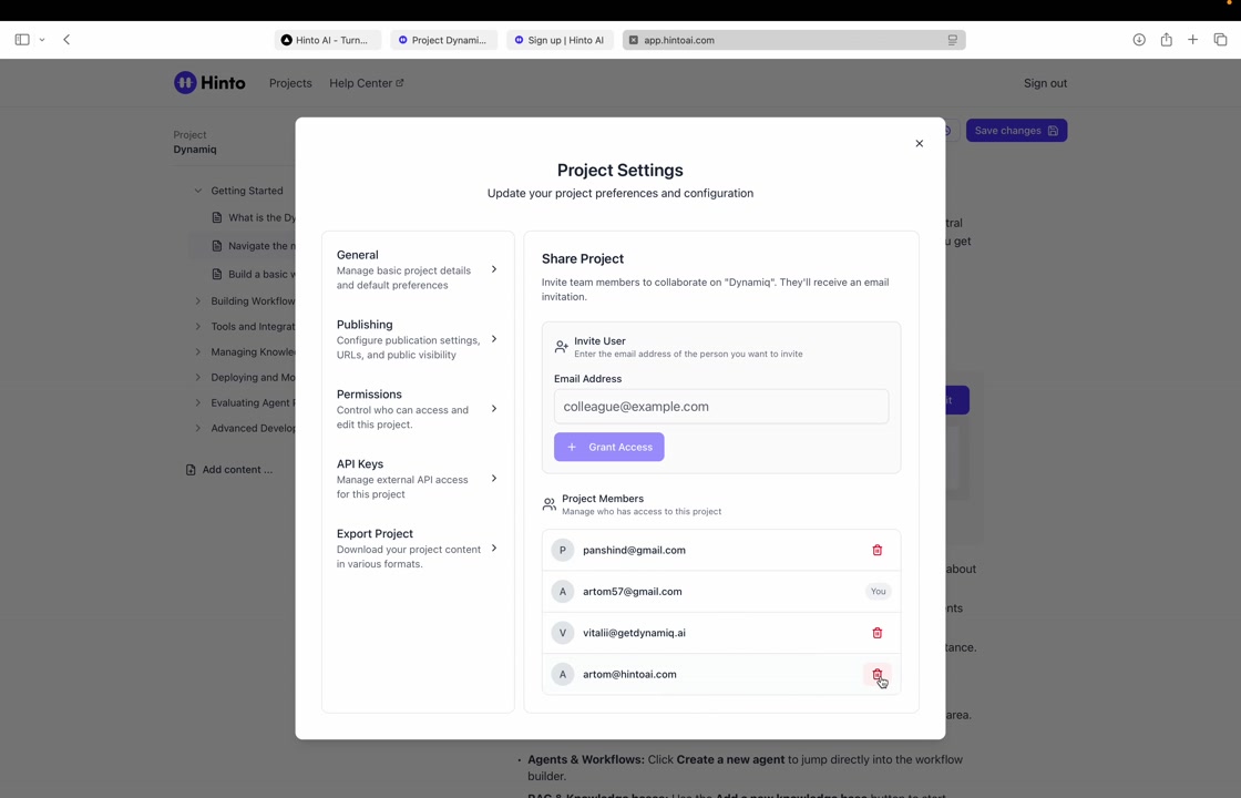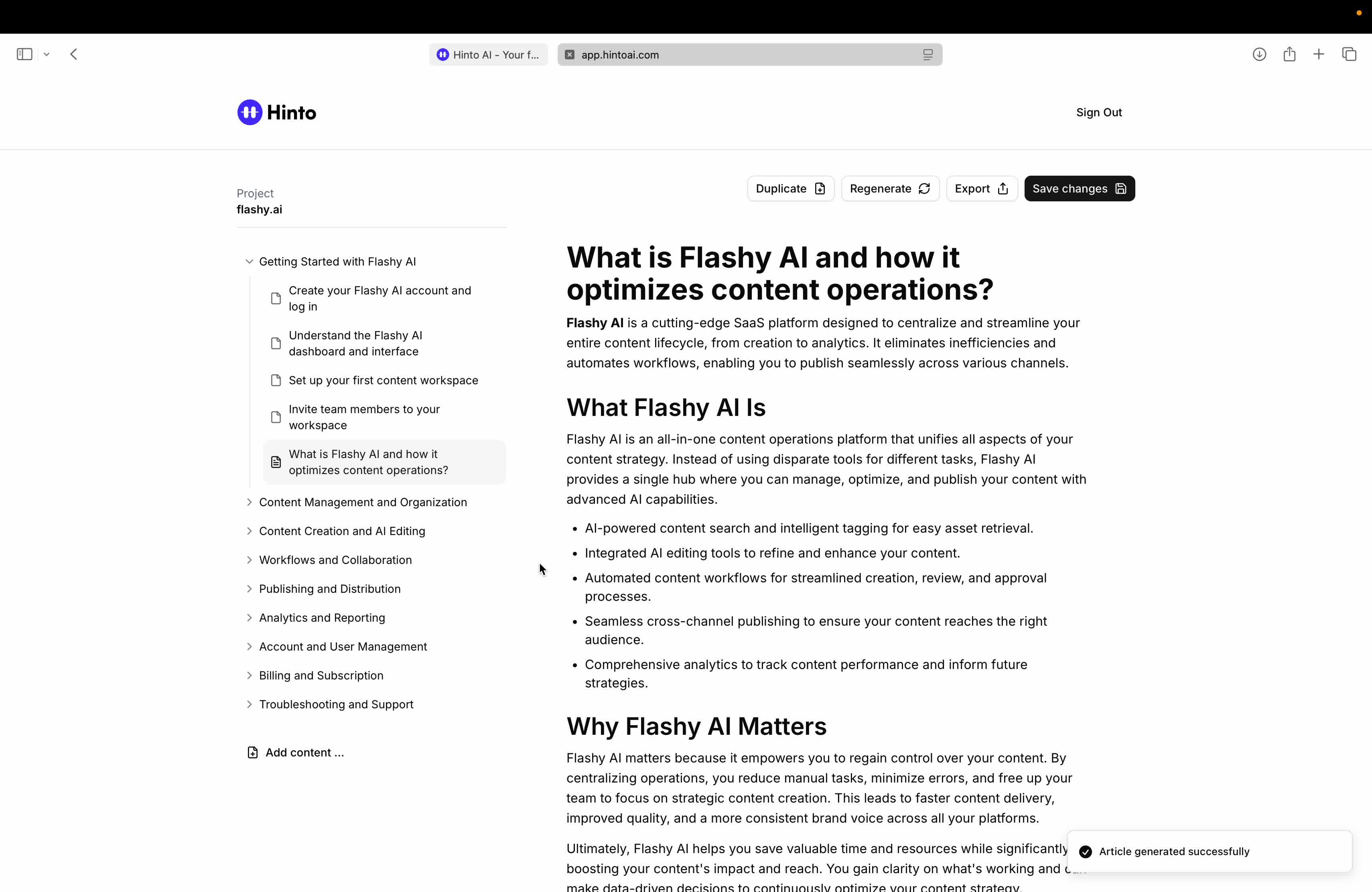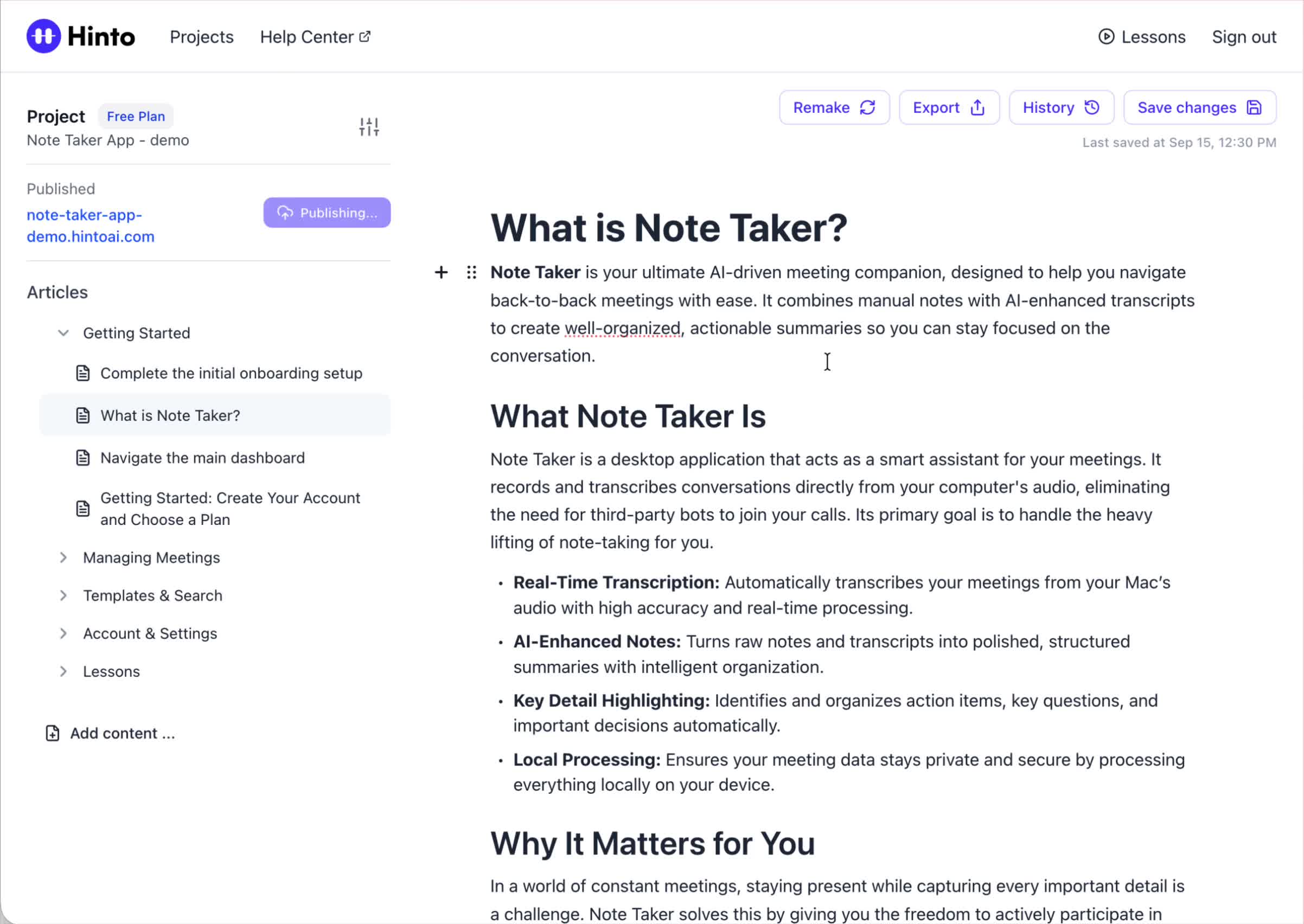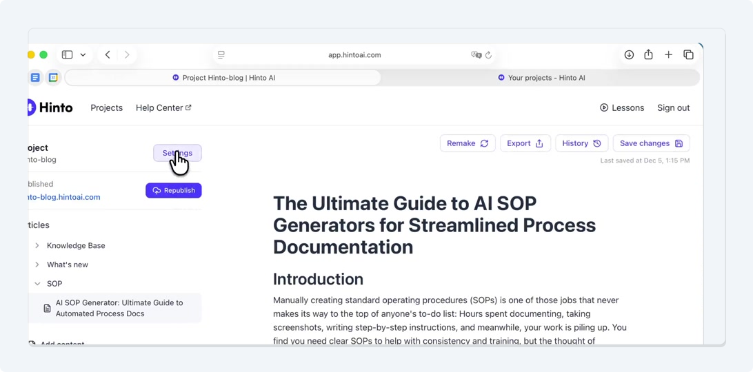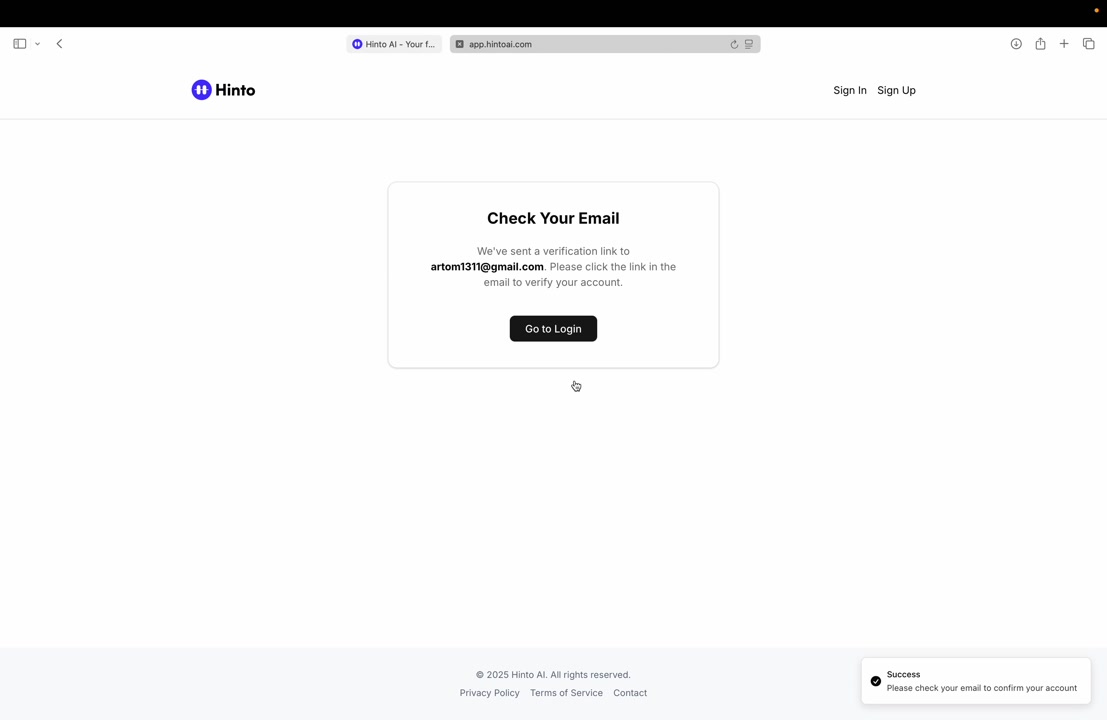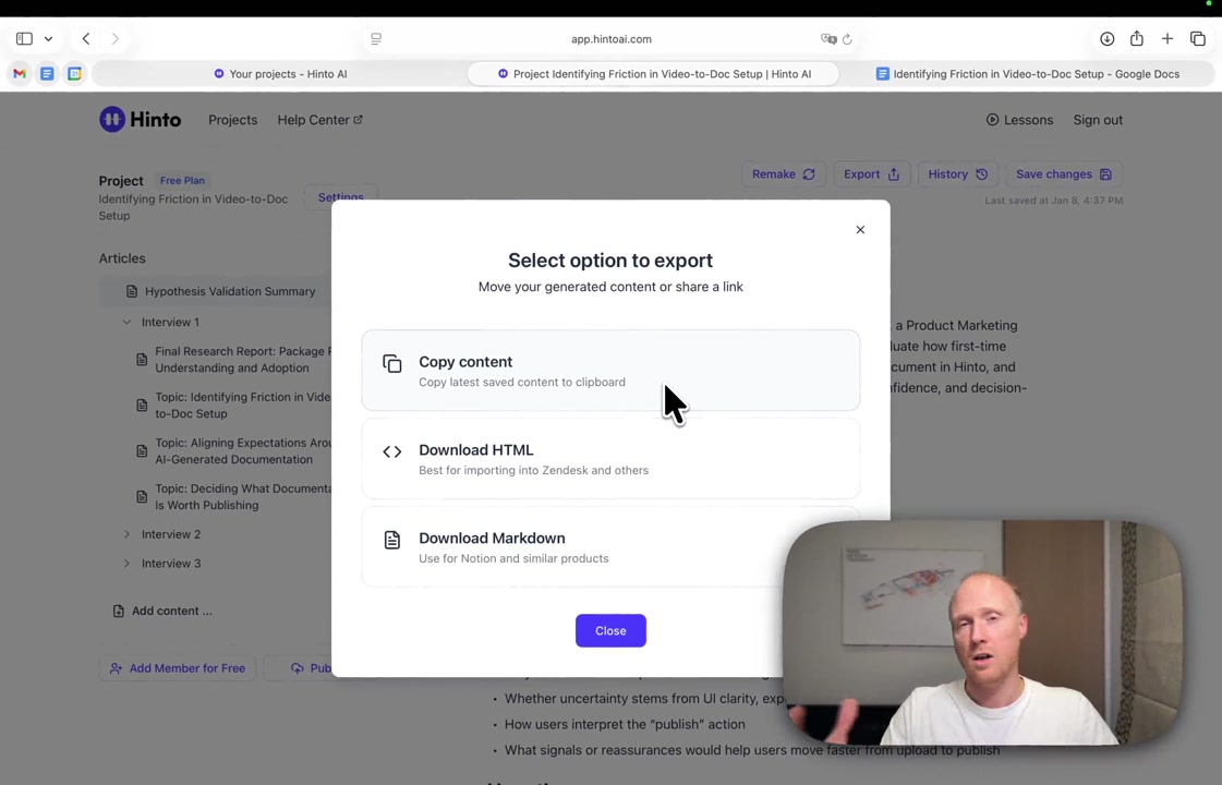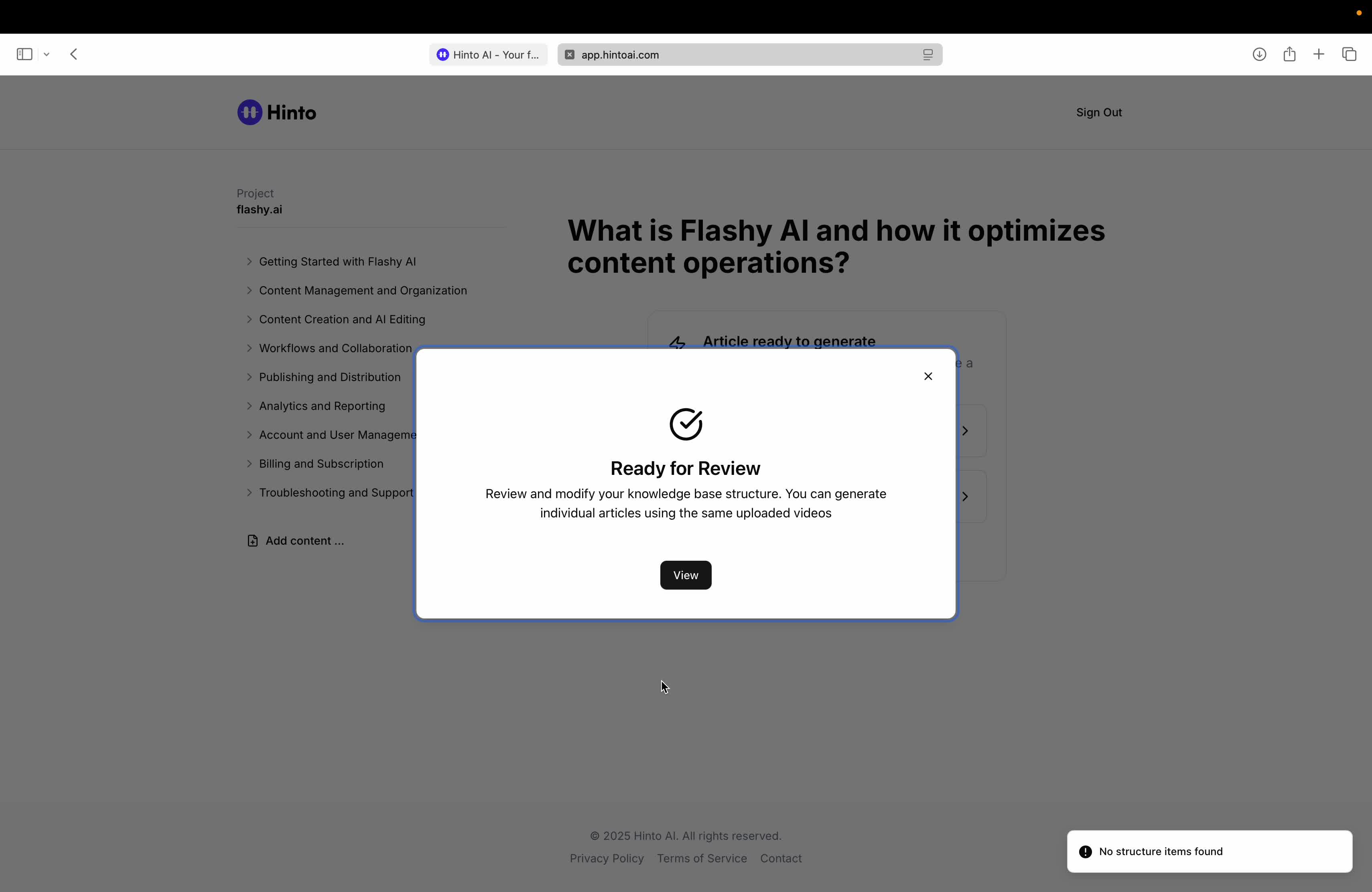 # Hinto AI --- ## Getting Started with Hinto AI ### Sign up and log in with Google # Sign up and log in with Google Hinto AI allows you to create an account and sign in using your existing Google account for a faster and more secure experience. This option is available on the main sign-up and sign-in pages, streamlining your access to the platform without needing to manage a separate password. ## Signing Up with Google If you are creating a new Hinto AI account, you can use your Google credentials to get started quickly. On the **Create Account** page, you will find the option to sign up with Google. 1. Navigate to the Hinto AI sign-up page. 2. Instead of filling out the email and password fields, click the **Sign up with Google** button. 3. A new window will open, prompting you to choose a Google account. Select the account you wish to use. 4. After selecting your account, you will be automatically authenticated and redirected to your Hinto AI projects dashboard.  ## Logging In with Google Once you have created an account using Google, you can use the same method to log in for subsequent sessions. The process is similar to signing up. 1. On the Hinto AI sign-in page, click the **Sign in with Google** button. 2. If you are already logged into your Google account in your browser, you may be logged into Hinto AI automatically. 3. If not, select your Google account from the list that appears. You will then be redirected to your dashboard. ### Important Considerations - **One Account, One Method:** If you sign up with Google, you should continue to log in with Google. An account created via Google OAuth is separate from an account created with the same email address and a password. - **Security:** Using Google for authentication leverages Google's security features, such as two-factor authentication (2FA), for your Hinto AI account. ## Summary This article explains how to use your Google account to both create and access your Hinto AI profile. By using the 'Sign up with Google' feature, you can bypass manual password creation for a streamlined and secure authentication process, getting you to your projects dashboard in just a few clicks. ## Related - [Create your Hinto AI account](/docs/getting-started-with-hinto-ai/create-your-hinto-ai-account) - [Log in into your Hinto AI account](/docs/getting-started-with-hinto-ai/log-in-into-your-hinto-ai-account) - [Create your first project](/docs/getting-started-with-hinto-ai/create-your-first-project) --- ### Complete the onboarding setup # Complete the onboarding setup After creating your Hinto AI account, you will be guided through a brief, multi-step onboarding process. This setup helps personalize your experience, create your first project, and prepares you to generate your first knowledge base. ## Step 1: Welcome to Hinto AI The first step helps us understand your needs better. You'll be asked to provide some basic information about yourself and your company. You must make a selection for each required field to proceed. - **How did you hear about Hinto AI?:** Select the source from the options provided. - **Company size:** Choose the option that best represents the number of employees in your company. - **What's your role?:** Select your current role from the list.  Once you have filled out all the fields, click the **Continue** button. ## Step 2: Create Your First Project Next, you will set up your first project. This project will house the documentation you generate. - **Project Name:** Enter a descriptive name for your project. - **Language:** Select the primary language for the content that will be generated.  Click **Continue** to move to the next step. ## Step 3: How Hinto AI Works A brief tutorial video will appear, providing a quick overview of how Hinto AI transforms your demos into a knowledge base. Watching this video is a great way to get acquainted with the platform's core functionality. When you are finished, click **Got it, Continue**.  ## Step 4: Upload Your First Video The final step is to upload your first screen recording. You can either drag and drop a file or click to select one from your computer. Hinto AI will use this video to automatically generate your knowledge base content. Supported formats include MP4, MOV, AVI, and WebM.  ### Tips for Using This Section If you prefer to explore the dashboard immediately, you can click the **Skip** button located in the top-right corner of the screen at any point during the onboarding process. This will take you directly to your project space. ## Summary This article provides a step-by-step guide to the Hinto AI onboarding flow. Following these steps allows you to personalize your account, create your first project, and upload a video to start generating content immediately after signing up. ## Related - [Create your Hinto AI account](/docs/getting-started-with-hinto-ai/create-your-hinto-ai-account) - [Create your first project](/docs/getting-started-with-hinto-ai/create-your-first-project) - [Generate a Knowledge Base](/docs/generating-content/generate-a-complete-knowledge-base-from-a-video) --- ### Log in into your Hinto AI account # How to Log In to Your Hinto AI Account This guide explains how to log in to your Hinto AI account. Following these steps will give you access to your projects and allow you to create new tutorials. You'll need the email address and password you used to register. 1. Navigate to the Hinto AI homepage and click the **Get Started** button in the top-right corner. 2. On the login page, enter your registered email address into the **Email** field. 3. Enter your password into the **Password** field. 4. Click the **Sign in** button to access your dashboard.  ### What If I Don't Have an Account? If you haven't created an account yet, click the **Sign up** link located below the **Sign in** button to register. --- ### What is Hinto AI and how it works? # What is Hinto AI and how it works? Hinto AI is a powerful platform designed to automate and accelerate the 