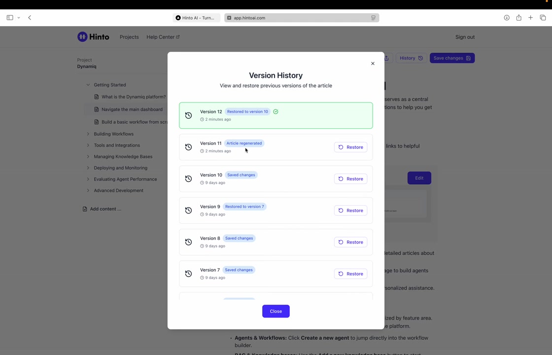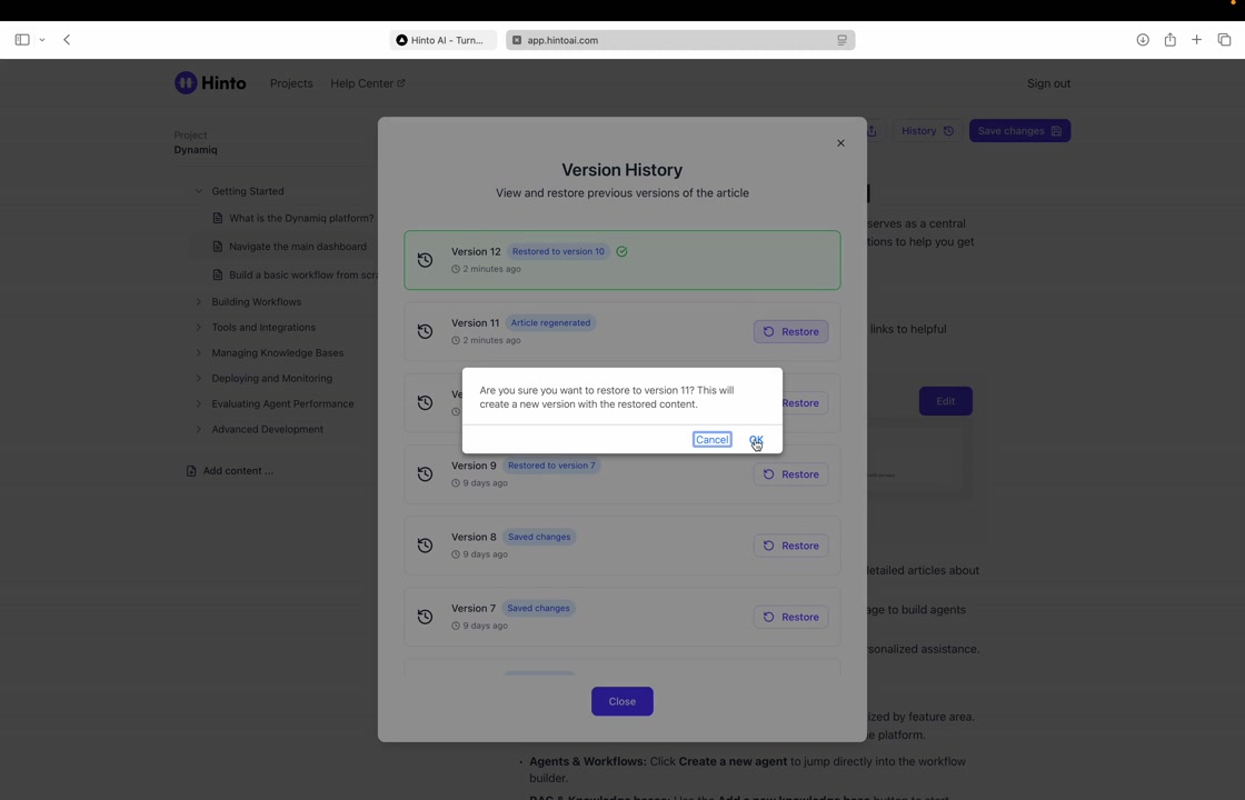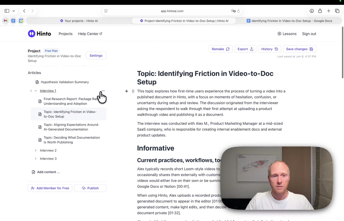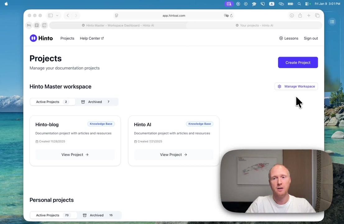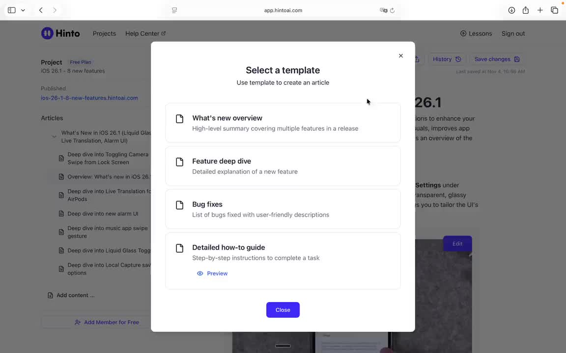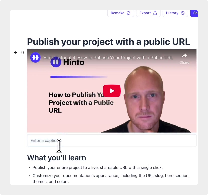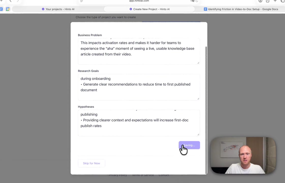 # Hinto AI --- ## Getting Started with Hinto AI ### Sign up and log in with Google # Sign up and log in with Google Hinto AI allows you to create an account and sign in using your existing Google account for a faster and more secure experience. This option is available on the main sign-up and sign-in pages, streamlining your access to the platform without needing to manage a separate password. ## Signing Up with Google If you are creating a new Hinto AI account, you can use your Google credentials to get started quickly. On the **Create Account** page, you will find the option to sign up with Google. 1. Navigate to the Hinto AI sign-up page. 2. Instead of filling out the email and password fields, click the **Sign up with Google** button. 3. A new window will open, prompting you to choose a Google account. Select the account you wish to use. 4. After selecting your account, you will be automatically authenticated and redirected to your Hinto AI projects dashboard.  ## Logging In with Google Once you have created an account using Google, you can use the same method to log in for subsequent sessions. The process is similar to signing up. 1. On the Hinto AI sign-in page, click the **Sign in with Google** button. 2. If you are already logged into your Google account in your browser, you may be logged into Hinto AI automatically. 3. If not, select your Google account from the list that appears. You will then be redirected to your dashboard. ### Important Considerations - **One Account, One Method:** If you sign up with Google, you should continue to log in with Google. An account created via Google OAuth is separate from an account created with the same email address and a password. - **Security:** Using Google for authentication leverages Google's security features, such as two-factor authentication (2FA), for your Hinto AI account. ## Summary This article explains how to use your Google account to both create and access your Hinto AI profile. By using the 'Sign up with Google' feature, you can bypass manual password creation for a streamlined and secure authentication process, getting you to your projects dashboard in just a few clicks. ## Related - [Create your Hinto AI account](/docs/getting-started-with-hinto-ai/create-your-hinto-ai-account) - [Log in into your Hinto AI account](/docs/getting-started-with-hinto-ai/log-in-into-your-hinto-ai-account) - [Create your first project](/docs/getting-started-with-hinto-ai/create-your-first-project) --- ### Complete the onboarding setup # Complete the onboarding setup After creating your Hinto AI account, you will be guided through a brief, multi-step onboarding process. This setup helps personalize your experience, create your first project, and prepares you to generate your first knowledge base. ## Step 1: Welcome to Hinto AI The first step helps us understand your needs better. You'll be asked to provide some basic information about yourself and your company. You must make a selection for each required field to proceed. - **How did you hear about Hinto AI?:** Select the source from the options provided. - **Company size:** Choose the option that best represents the number of employees in your company. - **What's your role?:** Select your current role from the list.  Once you have filled out all the fields, click the **Continue** button. ## Step 2: Create Your First Project Next, you will set up your first project. This project will house the documentation you generate. - **Project Name:** Enter a descriptive name for your project. - **Language:** Select the primary language for the content that will be generated.  Click **Continue** to move to the next step. ## Step 3: How Hinto AI Works A brief tutorial video will appear, providing a quick overview of how Hinto AI transforms your demos into a knowledge base. Watching this video is a great way to get acquainted with the platform's core functionality. When you are finished, click **Got it, Continue**.  ## Step 4: Upload Your First Video The final step is to upload your first screen recording. You can either drag and drop a file or click to select one from your computer. Hinto AI will use this video to automatically generate your knowledge base content. Supported formats include MP4, MOV, AVI, and WebM.  ### Tips for Using This Section If you prefer to explore the dashboard immediately, you can click the **Skip** button located in the top-right corner of the screen at any point during the onboarding process. This will take you directly to your project space. ## Summary This article provides a step-by-step guide to the Hinto AI onboarding flow. Following these steps allows you to personalize your account, create your first project, and upload a video to start generating content immediately after signing up. ## Related - [Create your Hinto AI account](/docs/getting-started-with-hinto-ai/create-your-hinto-ai-account) - [Create your first project](/docs/getting-started-with-hinto-ai/create-your-first-project) - [Generate a Knowledge Base](/docs/generating-content/generate-a-complete-knowledge-base-from-a-video) --- ### Log in into your Hinto AI account # How to Log In to Your Hinto AI Account This guide explains how to log in to your Hinto AI account. Following these steps will give you access to your projects and allow you to create new tutorials. You'll need the email address and password you used to register. 1. Navigate to the Hinto AI homepage and click the **Get Started** button in the top-right corner. 2. On the login page, enter your registered email address into the **Email** field. 3. Enter your password into the **Password** field. 4. Click the **Sign in** button to access your dashboard.  ### What If I Don't Have an Account? If you haven't created an account yet, click the **Sign up** link located below the **Sign in** button to register. --- ### What is Hinto AI and how it works? # What is Hinto AI and how it works? Hinto AI is a powerful platform designed to automate and accelerate the 