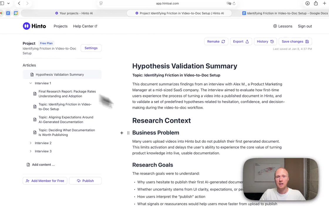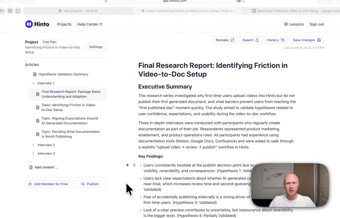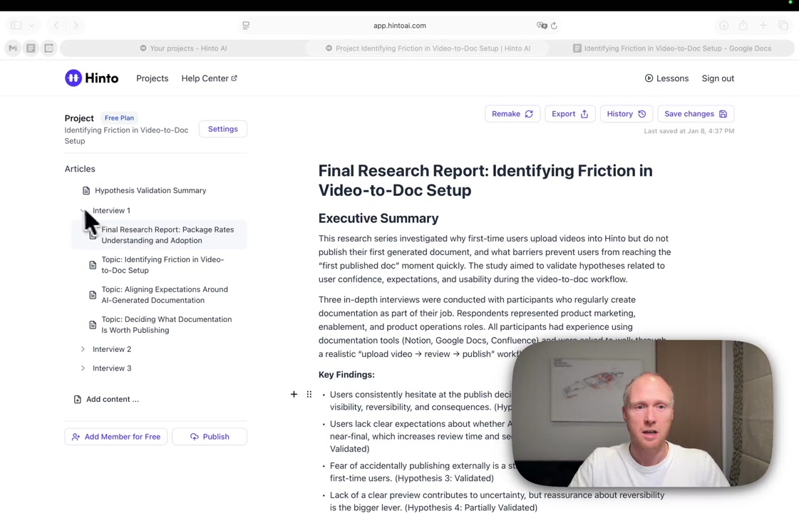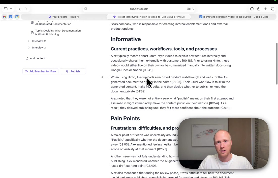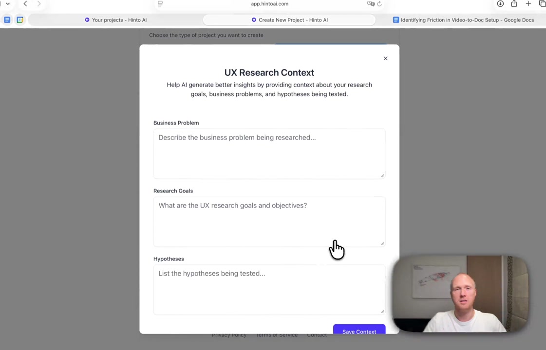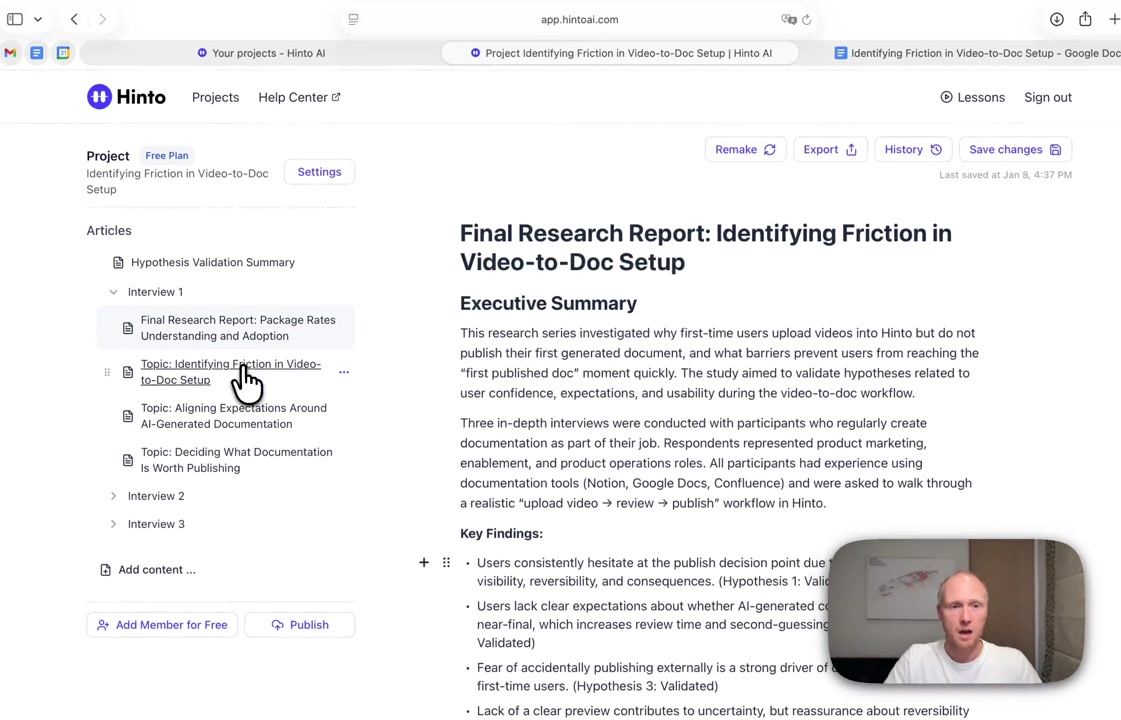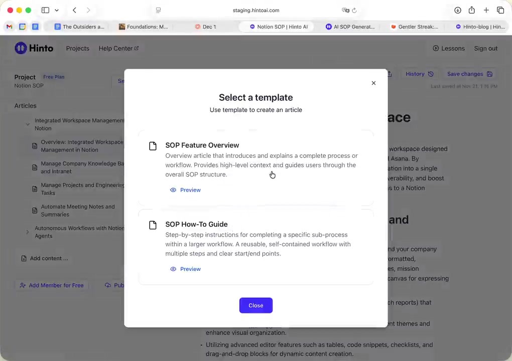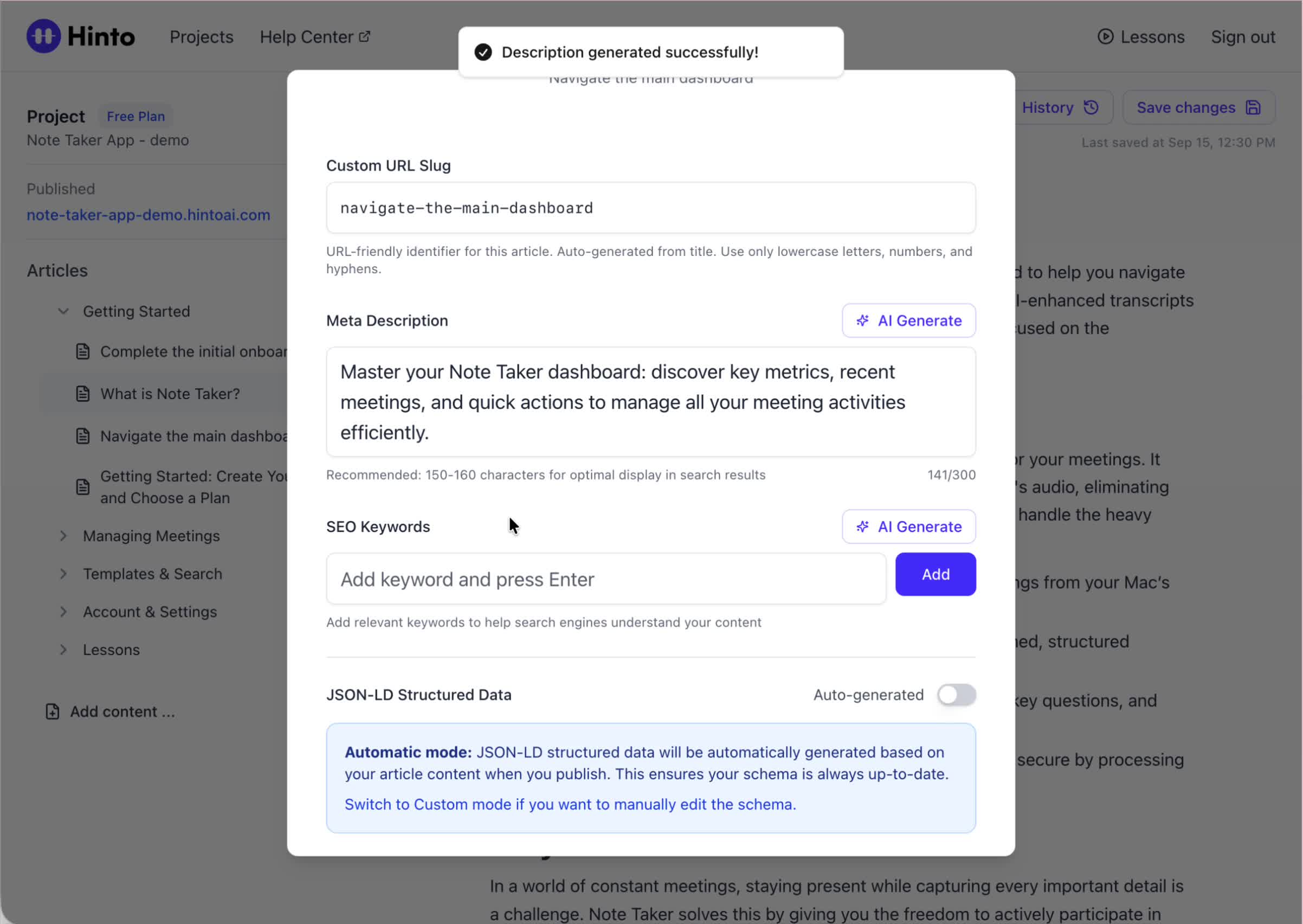 # Hinto AI --- ## Getting Started with Hinto AI ### Sign up and log in with Google # Sign up and log in with Google Hinto AI allows you to create an account and sign in using your existing Google account for a faster and more secure experience. This option is available on the main sign-up and sign-in pages, streamlining your access to the platform without needing to manage a separate password. ## Signing Up with Google If you are creating a new Hinto AI account, you can use your Google credentials to get started quickly. On the **Create Account** page, you will find the option to sign up with Google. 1. Navigate to the Hinto AI sign-up page. 2. Instead of filling out the email and password fields, click the **Sign up with Google** button. 3. A new window will open, prompting you to choose a Google account. Select the account you wish to use. 4. After selecting your account, you will be automatically authenticated and redirected to your Hinto AI projects dashboard.  ## Logging In with Google Once you have created an account using Google, you can use the same method to log in for subsequent sessions. The process is similar to signing up. 1. On the Hinto AI sign-in page, click the **Sign in with Google** button. 2. If you are already logged into your Google account in your browser, you may be logged into Hinto AI automatically. 3. If not, select your Google account from the list that appears. You will then be redirected to your dashboard. ### Important Considerations - **One Account, One Method:** If you sign up with Google, you should continue to log in with Google. An account created via Google OAuth is separate from an account created with the same email address and a password. - **Security:** Using Google for authentication leverages Google's security features, such as two-factor authentication (2FA), for your Hinto AI account. ## Summary This article explains how to use your Google account to both create and access your Hinto AI profile. By using the 'Sign up with Google' feature, you can bypass manual password creation for a streamlined and secure authentication process, getting you to your projects dashboard in just a few clicks. ## Related - [Create your Hinto AI account](/docs/getting-started-with-hinto-ai/create-your-hinto-ai-account) - [Log in into your Hinto AI account](/docs/getting-started-with-hinto-ai/log-in-into-your-hinto-ai-account) - [Create your first project](/docs/getting-started-with-hinto-ai/create-your-first-project) --- ### Complete the onboarding setup # Complete the onboarding setup After creating your Hinto AI account, you will be guided through a brief, multi-step onboarding process. This setup helps personalize your experience, create your first project, and prepares you to generate your first knowledge base. ## Step 1: Welcome to Hinto AI The first step helps us understand your needs better. You'll be asked to provide some basic information about yourself and your company. You must make a selection for each required field to proceed. - **How did you hear about Hinto AI?:** Select the source from the options provided. - **Company size:** Choose the option that best represents the number of employees in your company. - **What's your role?:** Select your current role from the list.  Once you have filled out all the fields, click the **Continue** button. ## Step 2: Create Your First Project Next, you will set up your first project. This project will house the documentation you generate. - **Project Name:** Enter a descriptive name for your project. - **Language:** Select the primary language for the content that will be generated.  Click **Continue** to move to the next step. ## Step 3: How Hinto AI Works A brief tutorial video will appear, providing a quick overview of how Hinto AI transforms your demos into a knowledge base. Watching this video is a great way to get acquainted with the platform's core functionality. When you are finished, click **Got it, Continue**.  ## Step 4: Upload Your First Video The final step is to upload your first screen recording. You can either drag and drop a file or click to select one from your computer. Hinto AI will use this video to automatically generate your knowledge base content. Supported formats include MP4, MOV, AVI, and WebM.  ### Tips for Using This Section If you prefer to explore the dashboard immediately, you can click the **Skip** button located in the top-right corner of the screen at any point during the onboarding process. This will take you directly to your project space. ## Summary This article provides a step-by-step guide to the Hinto AI onboarding flow. Following these steps allows you to personalize your account, create your first project, and upload a video to start generating content immediately after signing up. ## Related - [Create your Hinto AI account](/docs/getting-started-with-hinto-ai/create-your-hinto-ai-account) - [Create your first project](/docs/getting-started-with-hinto-ai/create-your-first-project) - [Generate a Knowledge Base](/docs/generating-content/generate-a-complete-knowledge-base-from-a-video) --- ### Log in into your Hinto AI account # How to Log In to Your Hinto AI Account This guide explains how to log in to your Hinto AI account. Following these steps will give you access to your projects and allow you to create new tutorials. You'll need the email address and password you used to register. 1. Navigate to the Hinto AI homepage and click the **Get Started** button in the top-right corner. 2. On the login page, enter your registered email address into the **Email** field. 3. Enter your password into the **Password** field. 4. Click the **Sign in** button to access your dashboard.  ### What If I Don't Have an Account? If you haven't created an account yet, click the **Sign up** link located below the **Sign in** button to register. --- ### What is Hinto AI and how it works? # What is Hinto AI and how it works? Hinto AI is a powerful platform designed to automate and accelerate the 