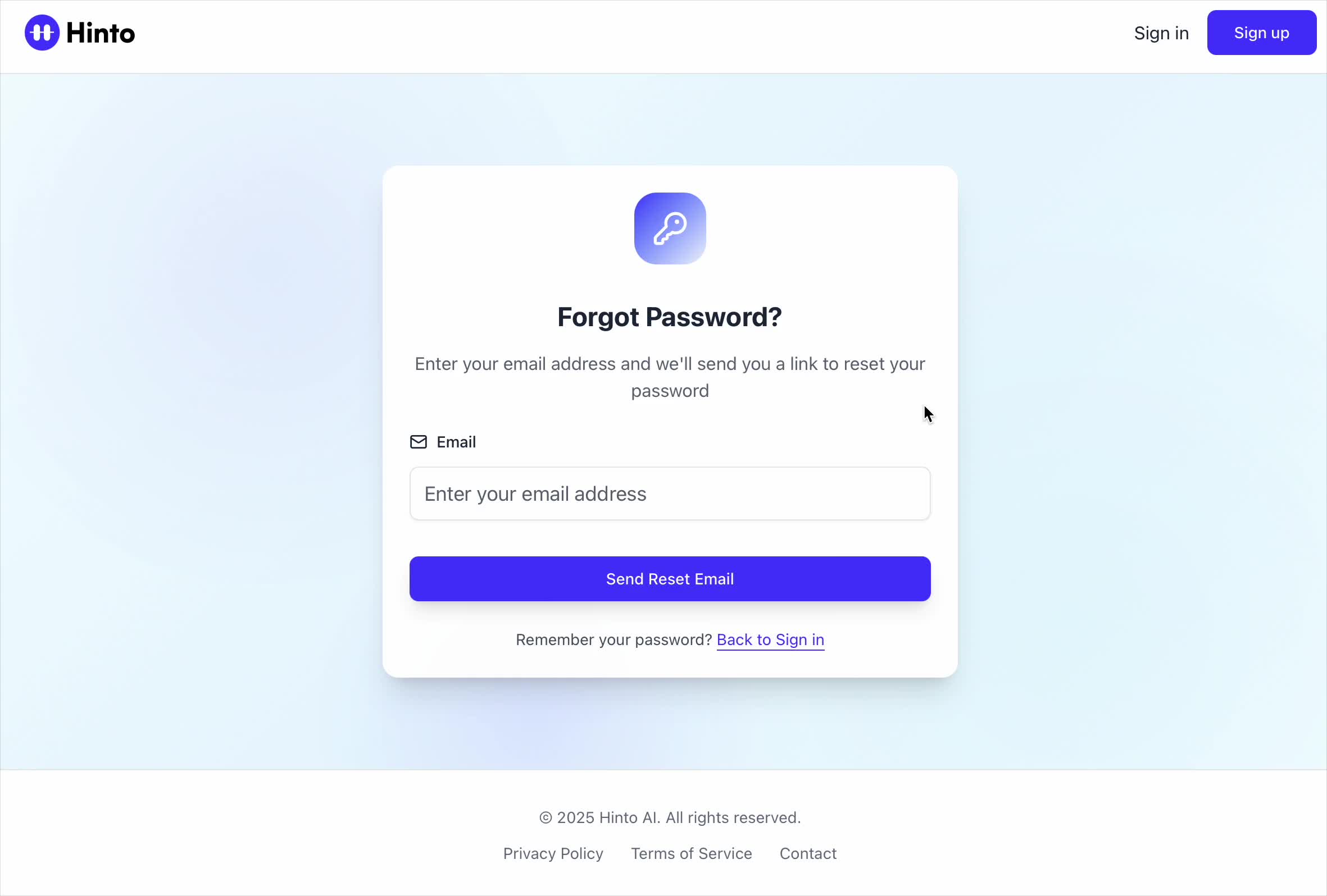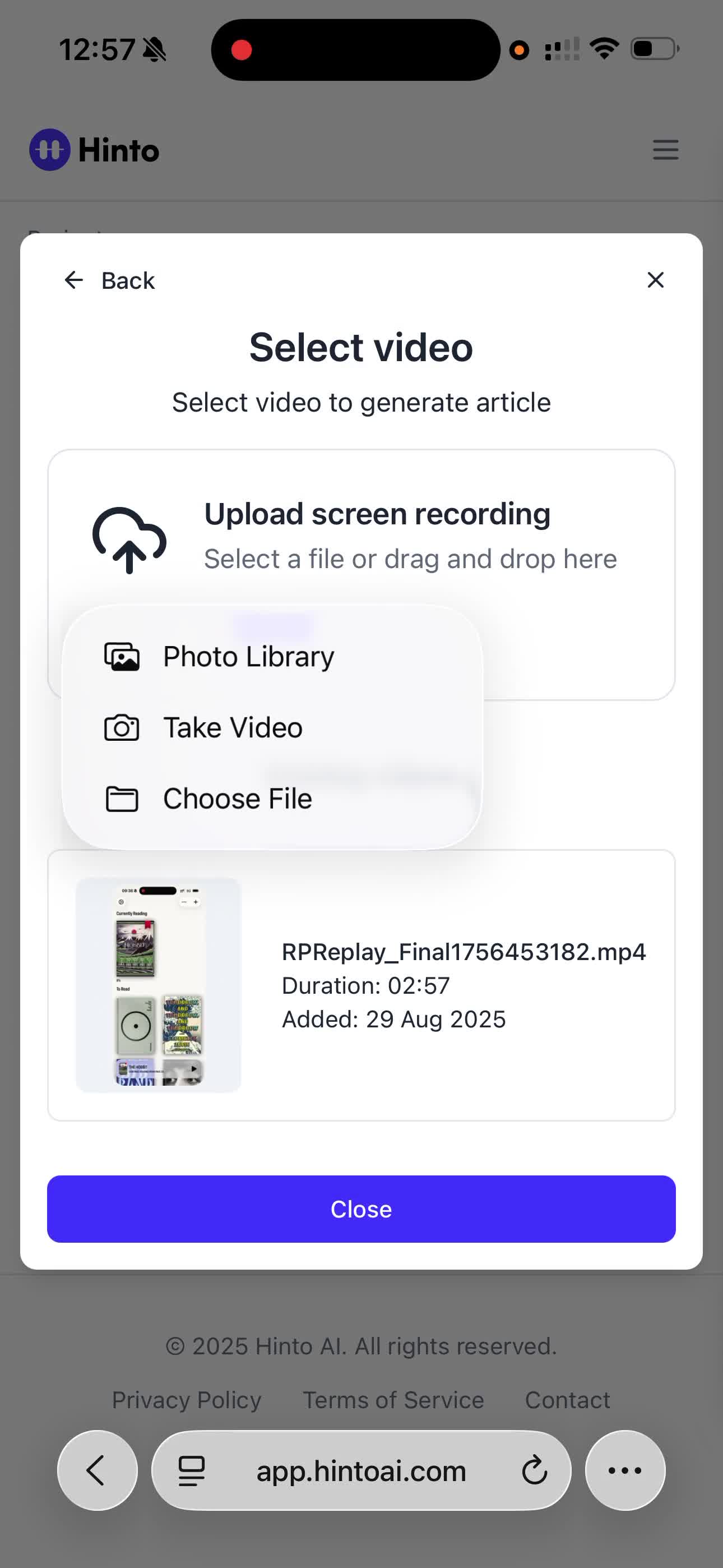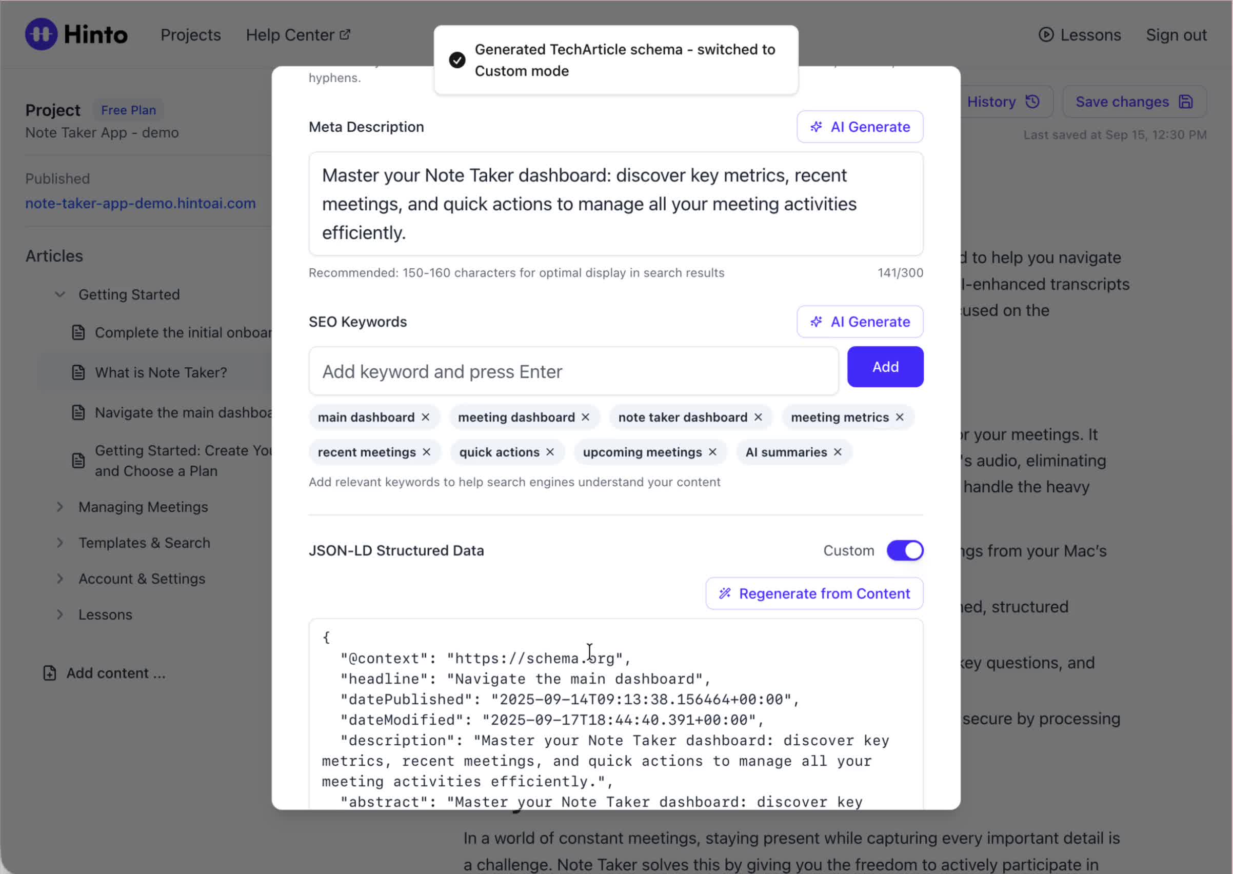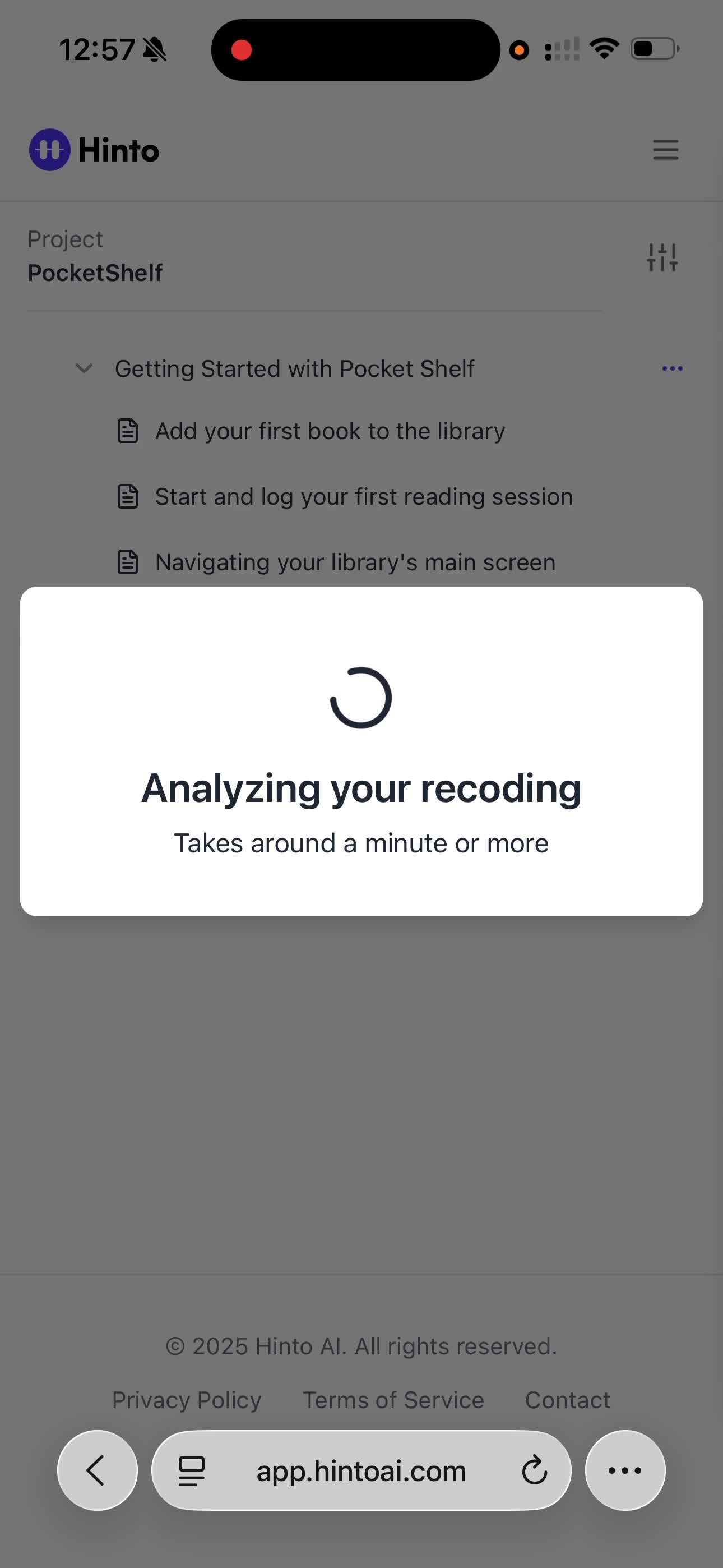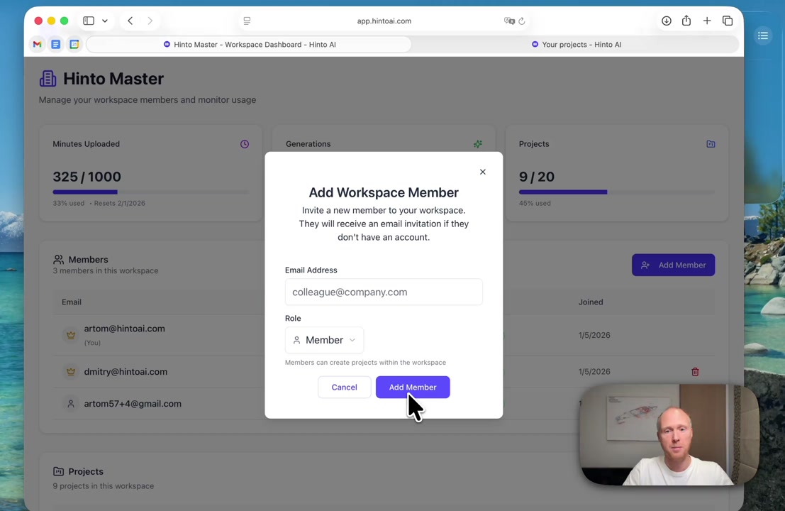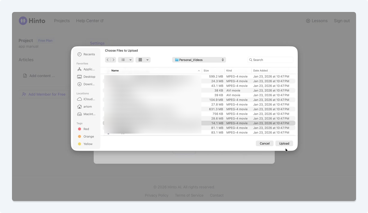 # Hinto AI --- ## Getting Started with Hinto AI ### Sign up and log in with Google # Sign up and log in with Google Hinto AI allows you to create an account and sign in using your existing Google account for a faster and more secure experience. This option is available on the main sign-up and sign-in pages, streamlining your access to the platform without needing to manage a separate password. ## Signing Up with Google If you are creating a new Hinto AI account, you can use your Google credentials to get started quickly. On the **Create Account** page, you will find the option to sign up with Google. 1. Navigate to the Hinto AI sign-up page. 2. Instead of filling out the email and password fields, click the **Sign up with Google** button. 3. A new window will open, prompting you to choose a Google account. Select the account you wish to use. 4. After selecting your account, you will be automatically authenticated and redirected to your Hinto AI projects dashboard.  ## Logging In with Google Once you have created an account using Google, you can use the same method to log in for subsequent sessions. The process is similar to signing up. 1. On the Hinto AI sign-in page, click the **Sign in with Google** button. 2. If you are already logged into your Google account in your browser, you may be logged into Hinto AI automatically. 3. If not, select your Google account from the list that appears. You will then be redirected to your dashboard. ### Important Considerations - **One Account, One Method:** If you sign up with Google, you should continue to log in with Google. An account created via Google OAuth is separate from an account created with the same email address and a password. - **Security:** Using Google for authentication leverages Google's security features, such as two-factor authentication (2FA), for your Hinto AI account. ## Summary This article explains how to use your Google account to both create and access your Hinto AI profile. By using the 'Sign up with Google' feature, you can bypass manual password creation for a streamlined and secure authentication process, getting you to your projects dashboard in just a few clicks. ## Related - [Create your Hinto AI account](/docs/getting-started-with-hinto-ai/create-your-hinto-ai-account) - [Log in into your Hinto AI account](/docs/getting-started-with-hinto-ai/log-in-into-your-hinto-ai-account) - [Create your first project](/docs/getting-started-with-hinto-ai/create-your-first-project) --- ### Complete the onboarding setup # Complete the onboarding setup After creating your Hinto AI account, you will be guided through a brief, multi-step onboarding process. This setup helps personalize your experience, create your first project, and prepares you to generate your first knowledge base. ## Step 1: Welcome to Hinto AI The first step helps us understand your needs better. You'll be asked to provide some basic information about yourself and your company. You must make a selection for each required field to proceed. - **How did you hear about Hinto AI?:** Select the source from the options provided. - **Company size:** Choose the option that best represents the number of employees in your company. - **What's your role?:** Select your current role from the list.  Once you have filled out all the fields, click the **Continue** button. ## Step 2: Create Your First Project Next, you will set up your first project. This project will house the documentation you generate. - **Project Name:** Enter a descriptive name for your project. - **Language:** Select the primary language for the content that will be generated.  Click **Continue** to move to the next step. ## Step 3: How Hinto AI Works A brief tutorial video will appear, providing a quick overview of how Hinto AI transforms your demos into a knowledge base. Watching this video is a great way to get acquainted with the platform's core functionality. When you are finished, click **Got it, Continue**.  ## Step 4: Upload Your First Video The final step is to upload your first screen recording. You can either drag and drop a file or click to select one from your computer. Hinto AI will use this video to automatically generate your knowledge base content. Supported formats include MP4, MOV, AVI, and WebM.  ### Tips for Using This Section If you prefer to explore the dashboard immediately, you can click the **Skip** button located in the top-right corner of the screen at any point during the onboarding process. This will take you directly to your project space. ## Summary This article provides a step-by-step guide to the Hinto AI onboarding flow. Following these steps allows you to personalize your account, create your first project, and upload a video to start generating content immediately after signing up. ## Related - [Create your Hinto AI account](/docs/getting-started-with-hinto-ai/create-your-hinto-ai-account) - [Create your first project](/docs/getting-started-with-hinto-ai/create-your-first-project) - [Generate a Knowledge Base](/docs/generating-content/generate-a-complete-knowledge-base-from-a-video) --- ### Log in into your Hinto AI account # How to Log In to Your Hinto AI Account This guide explains how to log in to your Hinto AI account. Following these steps will give you access to your projects and allow you to create new tutorials. You'll need the email address and password you used to register. 1. Navigate to the Hinto AI homepage and click the **Get Started** button in the top-right corner. 2. On the login page, enter your registered email address into the **Email** field. 3. Enter your password into the **Password** field. 4. Click the **Sign in** button to access your dashboard.  ### What If I Don't Have an Account? If you haven't created an account yet, click the **Sign up** link located below the **Sign in** button to register. --- ### What is Hinto AI and how it works? # What is Hinto AI and how it works? Hinto AI is a powerful platform designed to automate and accelerate the 