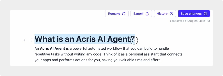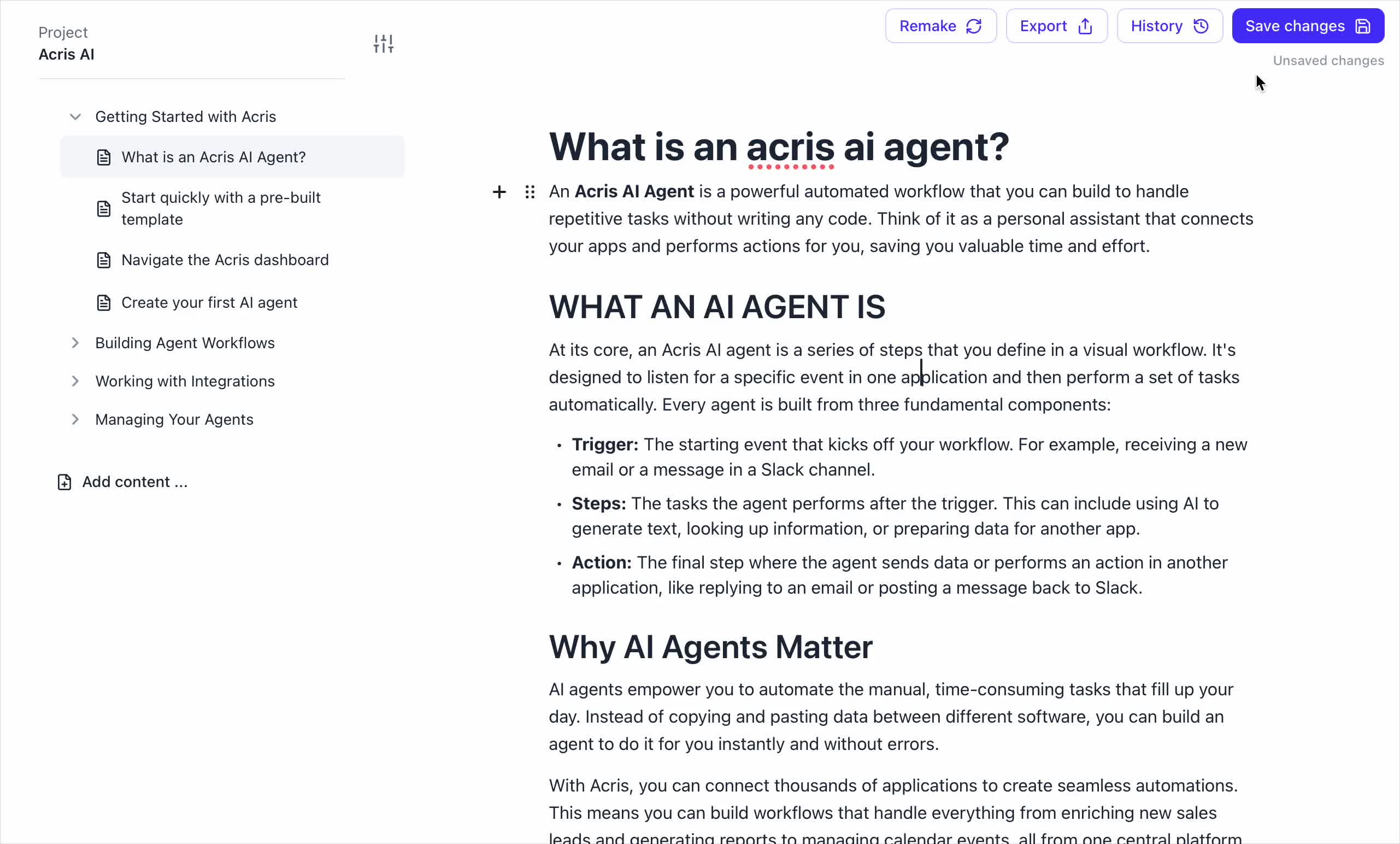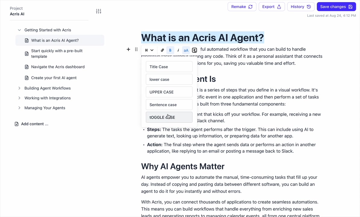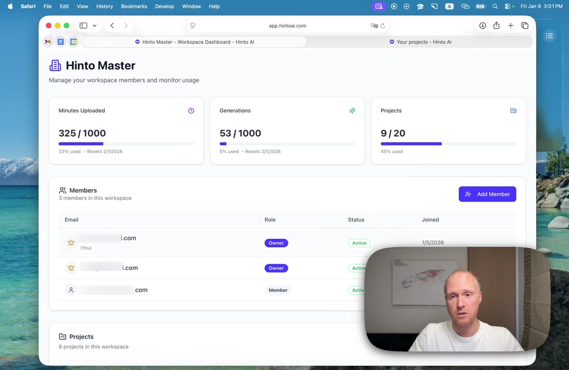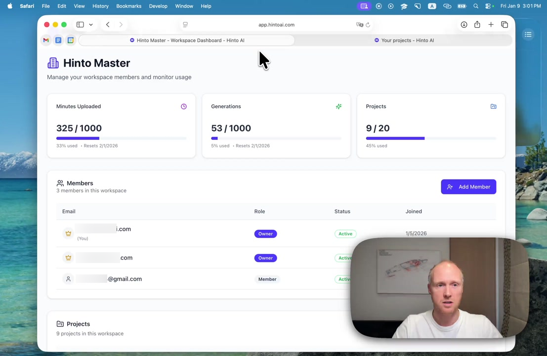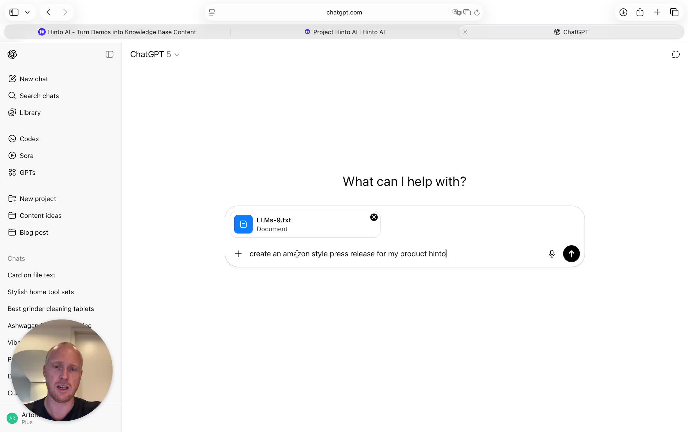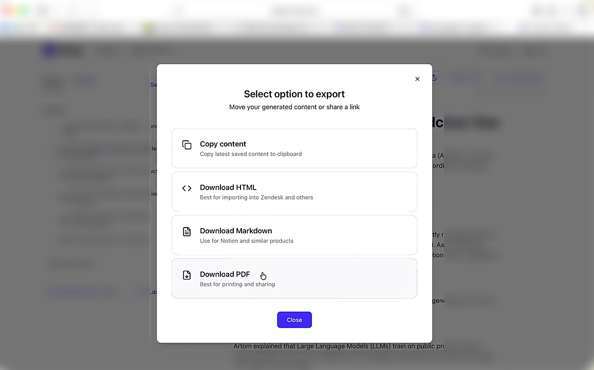 # Hinto AI --- ## Getting Started with Hinto AI ### Sign up and log in with Google # Sign up and log in with Google Hinto AI allows you to create an account and sign in using your existing Google account for a faster and more secure experience. This option is available on the main sign-up and sign-in pages, streamlining your access to the platform without needing to manage a separate password. ## Signing Up with Google If you are creating a new Hinto AI account, you can use your Google credentials to get started quickly. On the **Create Account** page, you will find the option to sign up with Google. 1. Navigate to the Hinto AI sign-up page. 2. Instead of filling out the email and password fields, click the **Sign up with Google** button. 3. A new window will open, prompting you to choose a Google account. Select the account you wish to use. 4. After selecting your account, you will be automatically authenticated and redirected to your Hinto AI projects dashboard.  ## Logging In with Google Once you have created an account using Google, you can use the same method to log in for subsequent sessions. The process is similar to signing up. 1. On the Hinto AI sign-in page, click the **Sign in with Google** button. 2. If you are already logged into your Google account in your browser, you may be logged into Hinto AI automatically. 3. If not, select your Google account from the list that appears. You will then be redirected to your dashboard. ### Important Considerations - **One Account, One Method:** If you sign up with Google, you should continue to log in with Google. An account created via Google OAuth is separate from an account created with the same email address and a password. - **Security:** Using Google for authentication leverages Google's security features, such as two-factor authentication (2FA), for your Hinto AI account. ## Summary This article explains how to use your Google account to both create and access your Hinto AI profile. By using the 'Sign up with Google' feature, you can bypass manual password creation for a streamlined and secure authentication process, getting you to your projects dashboard in just a few clicks. ## Related - [Create your Hinto AI account](/docs/getting-started-with-hinto-ai/create-your-hinto-ai-account) - [Log in into your Hinto AI account](/docs/getting-started-with-hinto-ai/log-in-into-your-hinto-ai-account) - [Create your first project](/docs/getting-started-with-hinto-ai/create-your-first-project) --- ### Complete the onboarding setup # Complete the onboarding setup After creating your Hinto AI account, you will be guided through a brief, multi-step onboarding process. This setup helps personalize your experience, create your first project, and prepares you to generate your first knowledge base. ## Step 1: Welcome to Hinto AI The first step helps us understand your needs better. You'll be asked to provide some basic information about yourself and your company. You must make a selection for each required field to proceed. - **How did you hear about Hinto AI?:** Select the source from the options provided. - **Company size:** Choose the option that best represents the number of employees in your company. - **What's your role?:** Select your current role from the list.  Once you have filled out all the fields, click the **Continue** button. ## Step 2: Create Your First Project Next, you will set up your first project. This project will house the documentation you generate. - **Project Name:** Enter a descriptive name for your project. - **Language:** Select the primary language for the content that will be generated.  Click **Continue** to move to the next step. ## Step 3: How Hinto AI Works A brief tutorial video will appear, providing a quick overview of how Hinto AI transforms your demos into a knowledge base. Watching this video is a great way to get acquainted with the platform's core functionality. When you are finished, click **Got it, Continue**.  ## Step 4: Upload Your First Video The final step is to upload your first screen recording. You can either drag and drop a file or click to select one from your computer. Hinto AI will use this video to automatically generate your knowledge base content. Supported formats include MP4, MOV, AVI, and WebM.  ### Tips for Using This Section If you prefer to explore the dashboard immediately, you can click the **Skip** button located in the top-right corner of the screen at any point during the onboarding process. This will take you directly to your project space. ## Summary This article provides a step-by-step guide to the Hinto AI onboarding flow. Following these steps allows you to personalize your account, create your first project, and upload a video to start generating content immediately after signing up. ## Related - [Create your Hinto AI account](/docs/getting-started-with-hinto-ai/create-your-hinto-ai-account) - [Create your first project](/docs/getting-started-with-hinto-ai/create-your-first-project) - [Generate a Knowledge Base](/docs/generating-content/generate-a-complete-knowledge-base-from-a-video) --- ### Log in into your Hinto AI account # How to Log In to Your Hinto AI Account This guide explains how to log in to your Hinto AI account. Following these steps will give you access to your projects and allow you to create new tutorials. You'll need the email address and password you used to register. 1. Navigate to the Hinto AI homepage and click the **Get Started** button in the top-right corner. 2. On the login page, enter your registered email address into the **Email** field. 3. Enter your password into the **Password** field. 4. Click the **Sign in** button to access your dashboard.  ### What If I Don't Have an Account? If you haven't created an account yet, click the **Sign up** link located below the **Sign in** button to register. --- ### What is Hinto AI and how it works? # What is Hinto AI and how it works? Hinto AI is a powerful platform designed to automate and accelerate the 