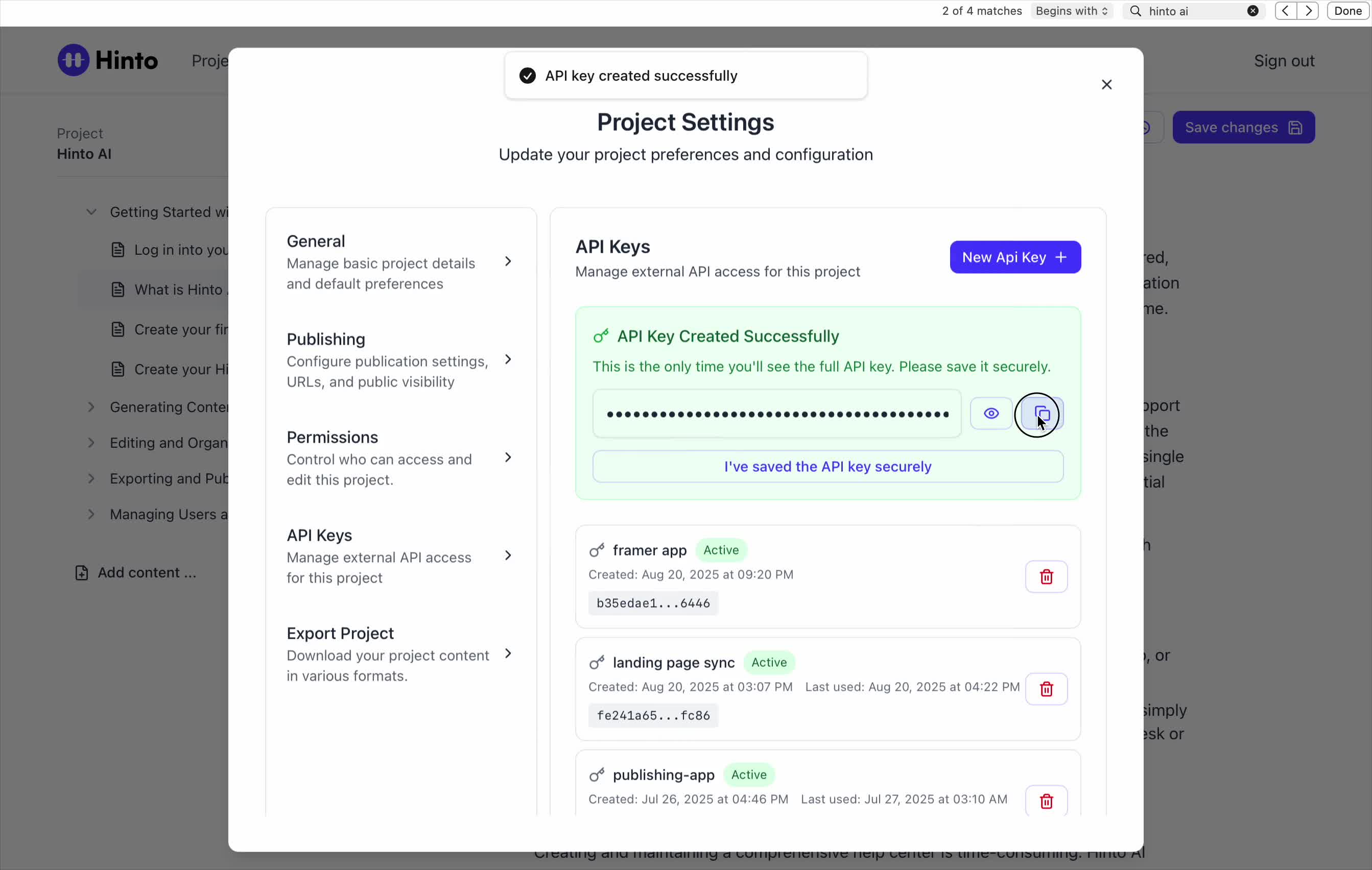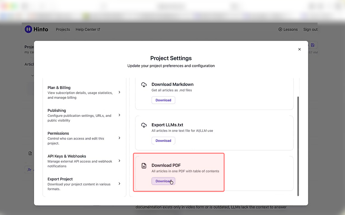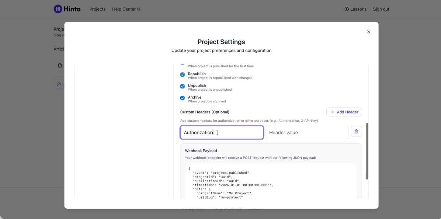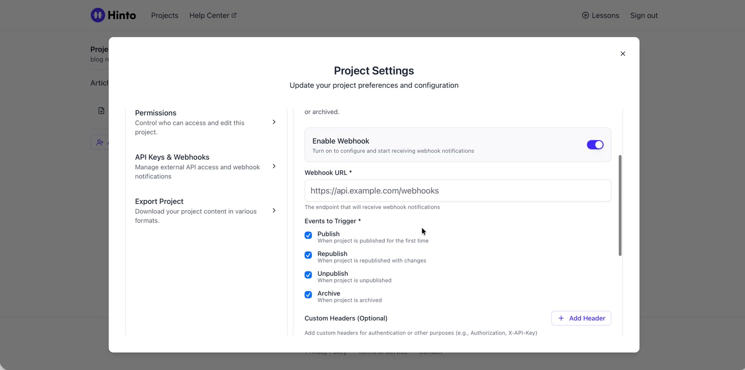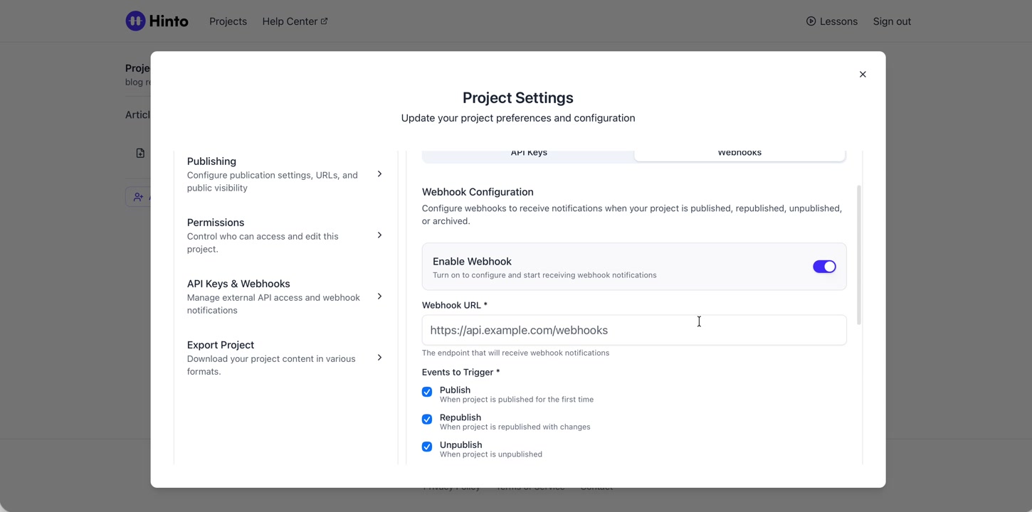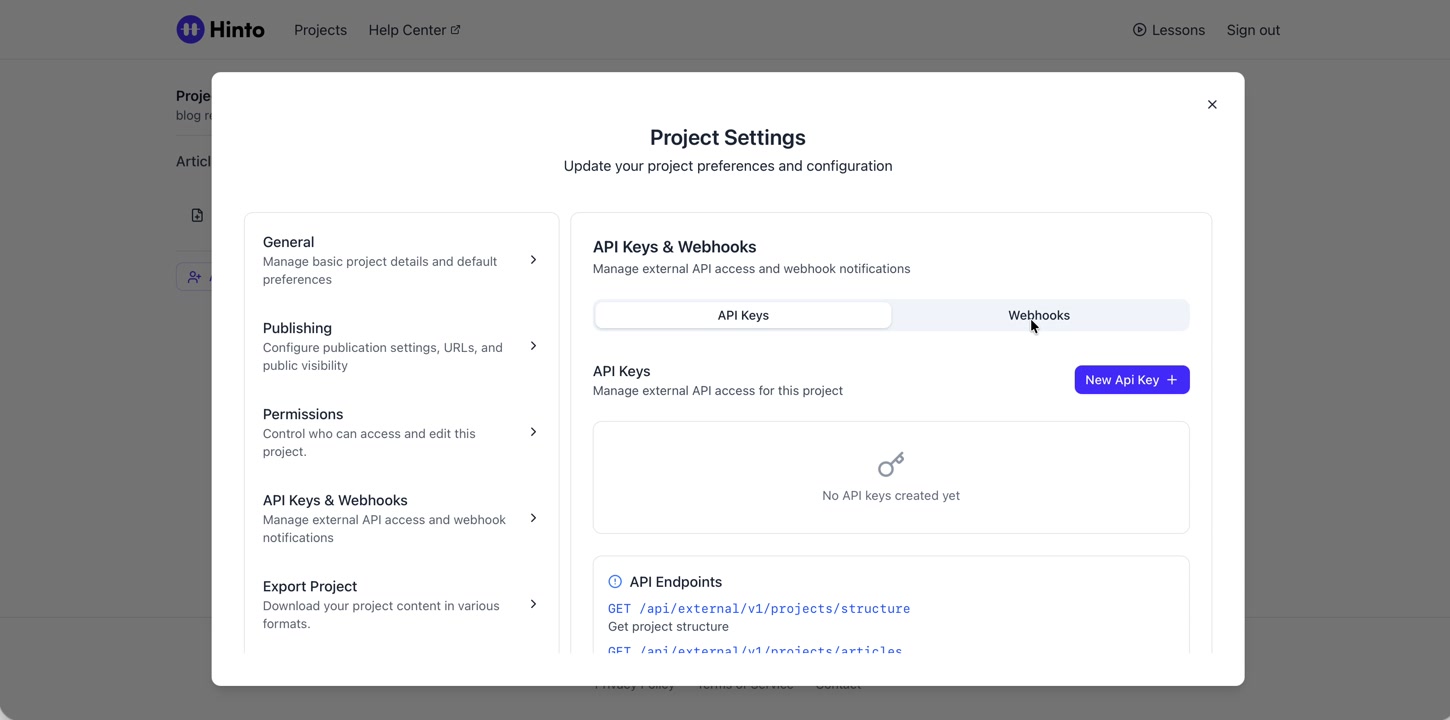 ", "format": "html" }, "project": { "slug": "project-slug", "name": "Project Name" } } ``` **Response (Markdown format):** ``` { "article": { "id": 1, "title": "Article Title", "project_id": "uuid", "folder_id": 1, "created_at": "2024-01-01T00:00:00Z", "updated_at": "2024-01-01T00:00:00Z" }, "content": { "markdown": "# Article Title\n\nArticle content...", "format": "markdown" }, "project": { "slug": "project-slug", "name": "Project Name" } } ``` ### 3. Export Complete Project **Endpoint:** GET /api/external/v1/projects/export **Authentication:** Required (Project API Key) Downloads the entire project as a ZIP archive or single file. **Query Parameters:** - format (optional): Export format - html (default): HTML files in ZIP archive - markdown: Markdown files in ZIP archive - llm-text: Single plain text file (all articles combined) **Response:** - For html/markdown: Binary ZIP file download with folder structure - Content-Type: application/zip - Content-Disposition: attachment; filename="project-name.zip" - For llm-text: Plain text file download (single file) - Content-Type: text/plain - Content-Disposition: attachment; filename="project-name.txt" ## Error Responses All endpoints return consistent error responses: ``` { "error": "Error type", "message": "Detailed error message" } ``` Common error codes: - 401 - Missing or invalid API key - 403 - Access denied to resource - 404 - Resource not found - 405 - Method not allowed - 500 - Internal server error ## Usage Examples ### Get Project Structure ``` curl -H "X-API-Key: your-api-key" \ https://app.hintoai.com/api/external/v1/projects/structure ``` ### Get Specific Article (HTML) ``` curl -H "X-API-Key: your-api-key" \ https://app.hintoai.com/api/external/v1/articles/123 ``` ### Get Article in Markdown Format ``` curl -H "X-API-Key: your-api-key" \ https://app.hintoai.com/api/external/v1/articles/123?format=markdown ``` ### Get Article with Clean HTML ``` curl -H "X-API-Key: your-api-key" \ https://app.hintoai.com/api/external/v1/articles/123?clean=true ``` ### Export Project as ZIP ``` curl -H "X-API-Key: your-api-key" \ https://app.hintoai.com/api/external/v1/projects/export?format=html \ -o project-export.zip ``` ### Export Project as LLM Text ``` curl -H "X-API-Key: your-api-key" \ https://app.hintoai.com/api/external/v1/projects/export?format=llm-text \ -o project-export.txt ``` ### Export Project as Markdown ``` curl -H "X-API-Key: your-api-key" \ https://app.hintoai.com/api/external/v1/projects/export?format=markdown \ -o project-export.zip ``` --- ### Set up webhooks for project notifications # Set up webhooks for project notifications Webhooks allow you to receive real-time notifications when specific events happen in your project, such as when it's published or archived. This guide shows you how to set up a webhook to send these notifications to an external service or application. You will need a valid endpoint URL from the service that will receive the webhook data. 1. From your project, navigate to **Project Settings**. 2. In the left-hand menu, click **API Keys & Webhooks**. 3. Select the **Webhooks** tab to open the configuration settings.  4. Click the **Enable Webhook** toggle to turn it on. 5. In the **Webhook URL** field, enter the complete URL of the endpoint that will receive the webhook notifications. This field is required.  6. Under **Events to Trigger**, select the checkboxes for the events you want notifications for. You can choose from **Publish**, **Republish**, **Unpublish**, and **Archive**.  7. Optionally, add custom headers for authentication. Click **+ Add Header** and enter the **Header name** and **Header value**.  8. Click **Save Configuration** to activate your webhook. ## Summary This article explains how to configure webhooks for your projects. Setting up a webhook enables Hinto AI to automatically send notifications to your specified URL when key project events occur, such as publishing or archiving, which helps automate your workflows and integrate with other tools. ## Related - [Generate and manage API keys](/docs/integrations/generate-and-manage-api-keys) - [API Documentation](/docs/integrations/api-documentation) - [How to publish your project](/docs/publishing-documentation/how-to-publish-your-project-with-a-public-url) --- ### Framer Integration #### Connect Hinto AI with Framer # How to Connect Hinto AI with Framer This guide explains how to connect your Hinto AI knowledge base with Framer. By following these steps, you can seamlessly import your documentation, including articles and folders, directly into Framer's CMS. This allows you to build a fully functional, dynamic help center on your Framer site. You will need active accounts for both Hinto AI and Framer. ## Part 1: Syncing Your Articles. 1. In your Framer project, navigate to the **CMS** panel on the left sidebar. 2. Open the command palette by pressing **Cmd/Ctrl + K** or click the **plugin** icon at the bottom of the canvas. Search for **Hinto AI** and select it to launch the plugin.  3. In the **New Collection** window that appears, enter 'Articles' as the name and click **Create**. This collection will store all your individual help articles.  4. To get your API key, navigate to the Hinto AI web app and open your project. 5. Click the settings icon to open **Project Settings** and select **API Keys** from the side menu. 6. Click the **New API Key +** button. 7. Enter a descriptive name for your key (e.g., 'Framer Integration') and click **Create API Key**. 1. Click the copy icon to copy the new API key to your clipboard. 2. Return to Framer, paste the key into the **API Key** field, and click **Continue**.  1. In the Hinto Content Sync window, ensure the **Content Type** is set to **Articles**. 2. (Optional) For internal links to function correctly, expand **Advanced Settings** and enter your site’s full base URL path where articles will live (e.g., https://yourdomain.com/docs). 3. Click **Import** to begin syncing. Your Hinto A