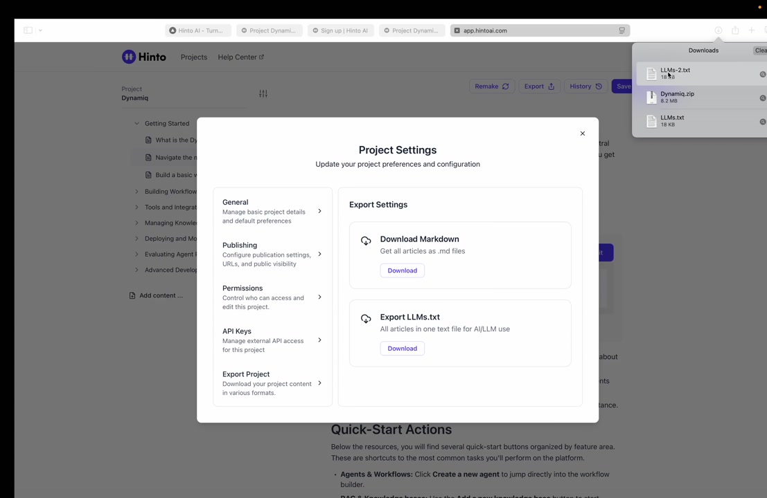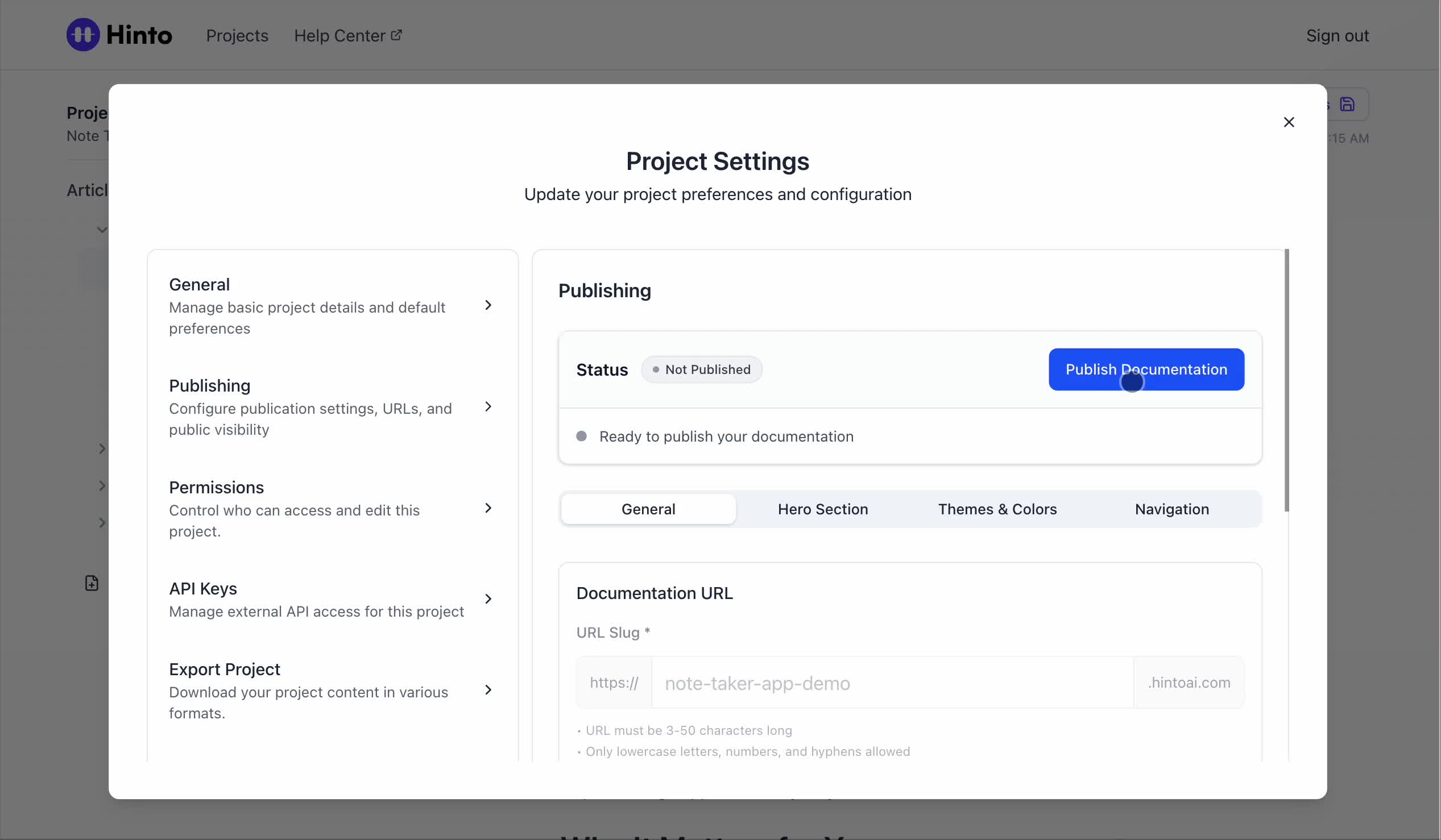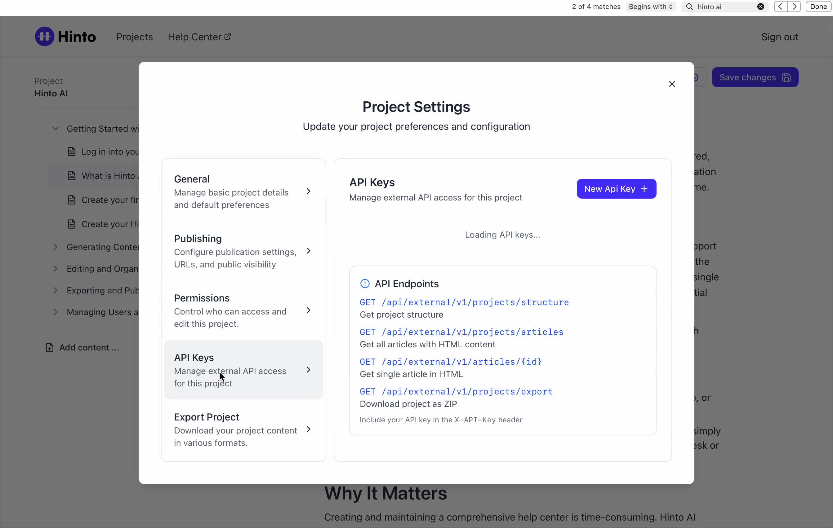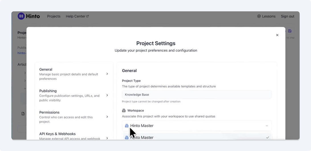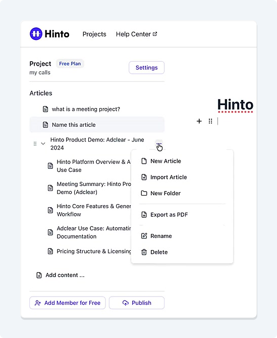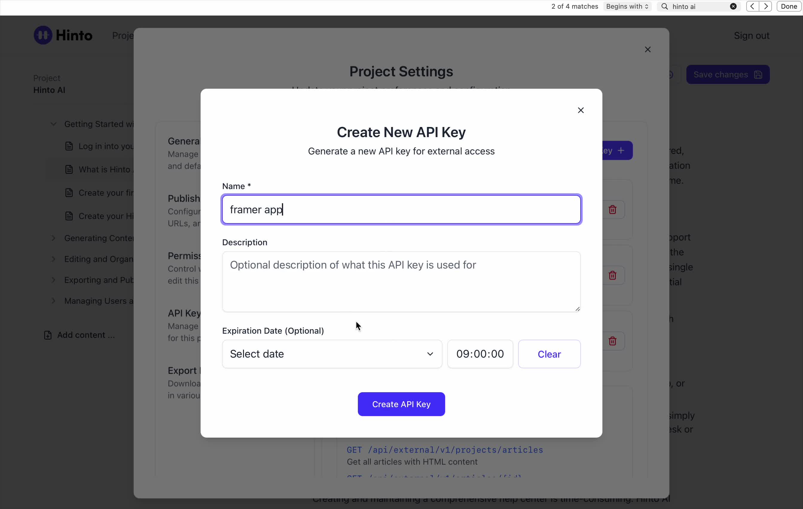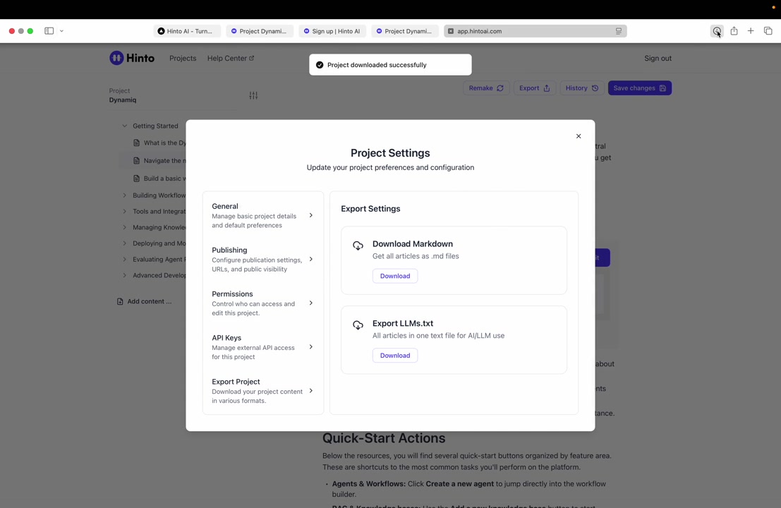 ", "format": "html" }, "project": { "slug": "project-slug", "name": "Project Name" } } ``` **Response (Markdown format):** ``` { "article": { "id": 1, "title": "Article Title", "project_id": "uuid", "folder_id": 1, "created_at": "2024-01-01T00:00:00Z", "updated_at": "2024-01-01T00:00:00Z" }, "content": { "markdown": "# Article Title\n\nArticle content...", "format": "markdown" }, "project": { "slug": "project-slug", "name": "Project Name" } } ``` ### 3. Export Complete Project **Endpoint:** GET /api/external/v1/projects/export **Authentication:** Required (Project API Key) Downloads the entire project as a ZIP archive or single file. **Query Parameters:** - format (optional): Export format - html (default): HTML files in ZIP archive - markdown: Markdown files in ZIP archive - llm-text: Single plain text file (all articles combined) **Response:** - For html/markdown: Binary ZIP file download with folder structure - Content-Type: application/zip - Content-Disposition: attachment; filename="project-name.zip" - For llm-text: Plain text file download (single file) - Content-Type: text/plain - Content-Disposition: attachment; filename="project-name.txt" ## Error Responses All endpoints return consistent error responses: ``` { "error": "Error type", "message": "Detailed error message" } ``` Common error codes: - 401 - Missing or invalid API key - 403 - Access denied to resource - 404 - Resource not found - 405 - Method not allowed - 500 - Internal server error ## Usage Examples ### Get Project Structure ``` curl -H "X-API-Key: your-api-key" \ https://app.hintoai.com/api/external/v1/projects/structure ``` ### Get Specific Article (HTML) ``` curl -H "X-API-Key: your-api-key" \ https://app.hintoai.com/api/external/v1/articles/123 ``` ### Get Article in Markdown Format ``` curl -H "X-API-Key: your-api-key" \ https://app.hintoai.com/api/external/v1/articles/123?format=markdown ``` ### Get Article with Clean HTML ``` curl -H "X-API-Key: your-api-key" \ https://app.hintoai.com/api/external/v1/articles/123?clean=true ``` ### Export Project as ZIP ``` curl -H "X-API-Key: your-api-key" \ https://app.hintoai.com/api/external/v1/projects/export?format=html \ -o project-export.zip ``` ### Export Project as LLM Text ``` curl -H "X-API-Key: your-api-key" \ https://app.hintoai.com/api/external/v1/projects/export?format=llm-text \ -o project-export.txt ``` ### Export Project as Markdown ``` curl -H "X-API-Key: your-api-key" \ https://app.hintoai.com/api/external/v1/projects/export?format=markdown \ -o project-export.zip ``` --- ### Set up webhooks for project notifications # Set up webhooks for project notifications Webhooks allow you to receive real-time notifications when specific events happen in your project, such as when it's published or archived. This guide shows you how to set up a webhook to send these notifications to an external service or application. You will need a valid endpoint URL from the service that will receive the webhook data. 1. From your project, navigate to **Project Settings**. 2. In the left-hand menu, click **API Keys & Webhooks**. 3. Select the **Webhooks** tab to open the configuration settings.  4. Click the **Enable Webhook** toggle to turn it on. 5. In the **Webhook URL** field, enter the complete URL of the endpoint that will receive the webhook notifications. This field is required.  6. Under **Events to Trigger**, select the checkboxes for the events you want notifications for. You can choose from **Publish**, **Republish**, **Unpublish**, and **Archive**.  7. Optionally, add custom headers for authentication. Click **+ Add Header** and enter the **Header name** and **Header value**.  8. Click **Save Configuration** to activate your webhook. ## Summary This article explains how to configure webhooks for your projects. Setting up a webhook enables Hinto AI to automatically send notifications to your specified URL when key project events occur, such as publishing or archiving, which helps automate your workflows and integrate with other tools. ## Related - [Generate and manage API keys](/docs/integrations/generate-and-manage-api-keys) - [API Documentation](/docs/integrations/api-documentation) - [How to publish your project](/docs/publishing-documentation/how-to-publish-your-project-with-a-public-url) --- ### Framer Integration #### Connect Hinto AI with Framer # How to Connect Hinto AI with Framer This guide explains how to connect your Hinto AI knowledge base with Framer. By following these steps, you can seamlessly import your documentation, including articles and folders, directly into Framer's CMS. This allows you to build a fully functional, dynamic help center on your Framer site. You will need active accounts for both Hinto AI and Framer. ## Part 1: Syncing Your Articles. 1. In your Framer project, navigate to the **CMS** panel on the left sidebar. 2. Open the command palette by pressing **Cmd/Ctrl + K** or click the **plugin** icon at the bottom of the canvas. Search for **Hinto AI** and select it to launch the plugin.  3. In the **New Collection** window that appears, enter 'Articles' as the name and click **Create**. This collection will store all your individual help articles.  4. To get your API key, navigate to the Hinto AI web app and open your project. 5. Click the settings icon to open **Project Settings** and select **API Keys** from the side menu. 6. Click the **New API Key +** button. 7. Enter a descriptive name for your key (e.g., 'Framer Integration') and click **Create API Key**. 1. Click the copy icon to copy the new API key to your clipboard. 2. Return to Framer, paste the key into the **API Key** field, and click **Continue**.  1. In the Hinto Content Sync window, ensure the **Content Type** is set to **Articles**. 2. (Optional) For internal links to function correctly, expand **Advanced Settings** and enter your site’s full base URL path where articles will live (e.g., https://yourdomain.com/docs). 3. Click **Import** to begin syncing. Your Hinto A