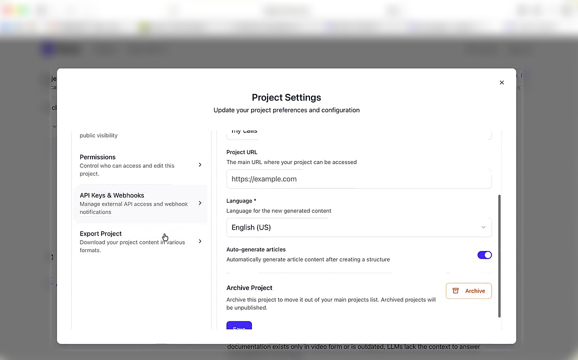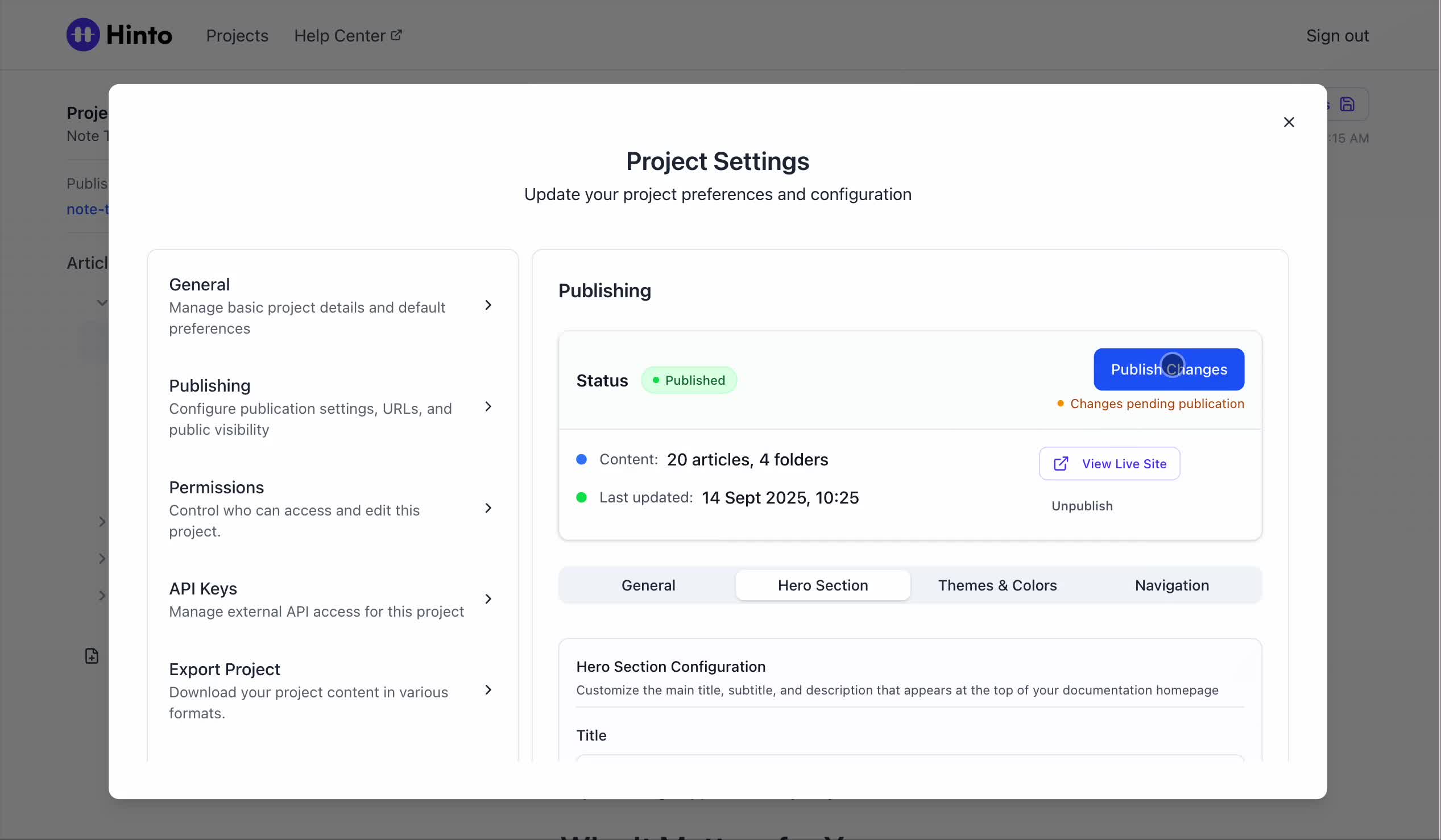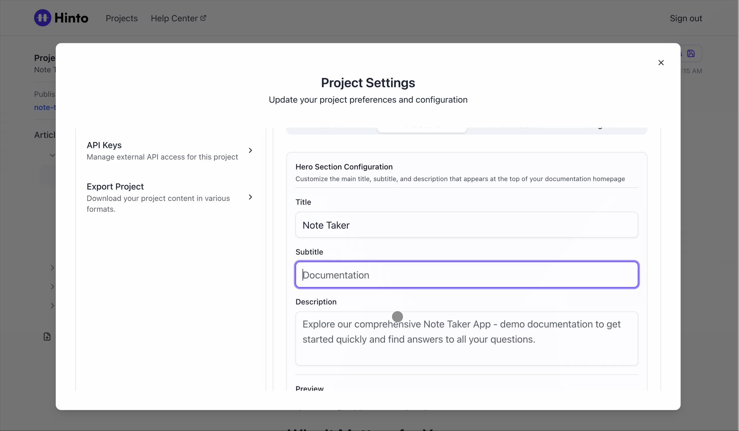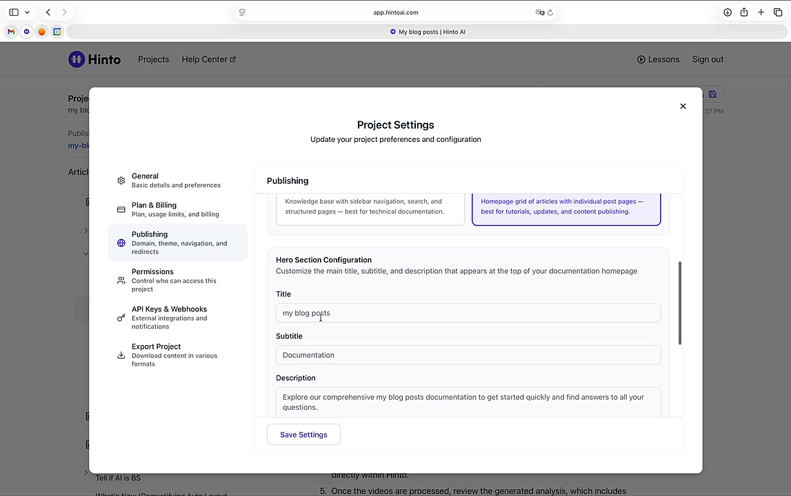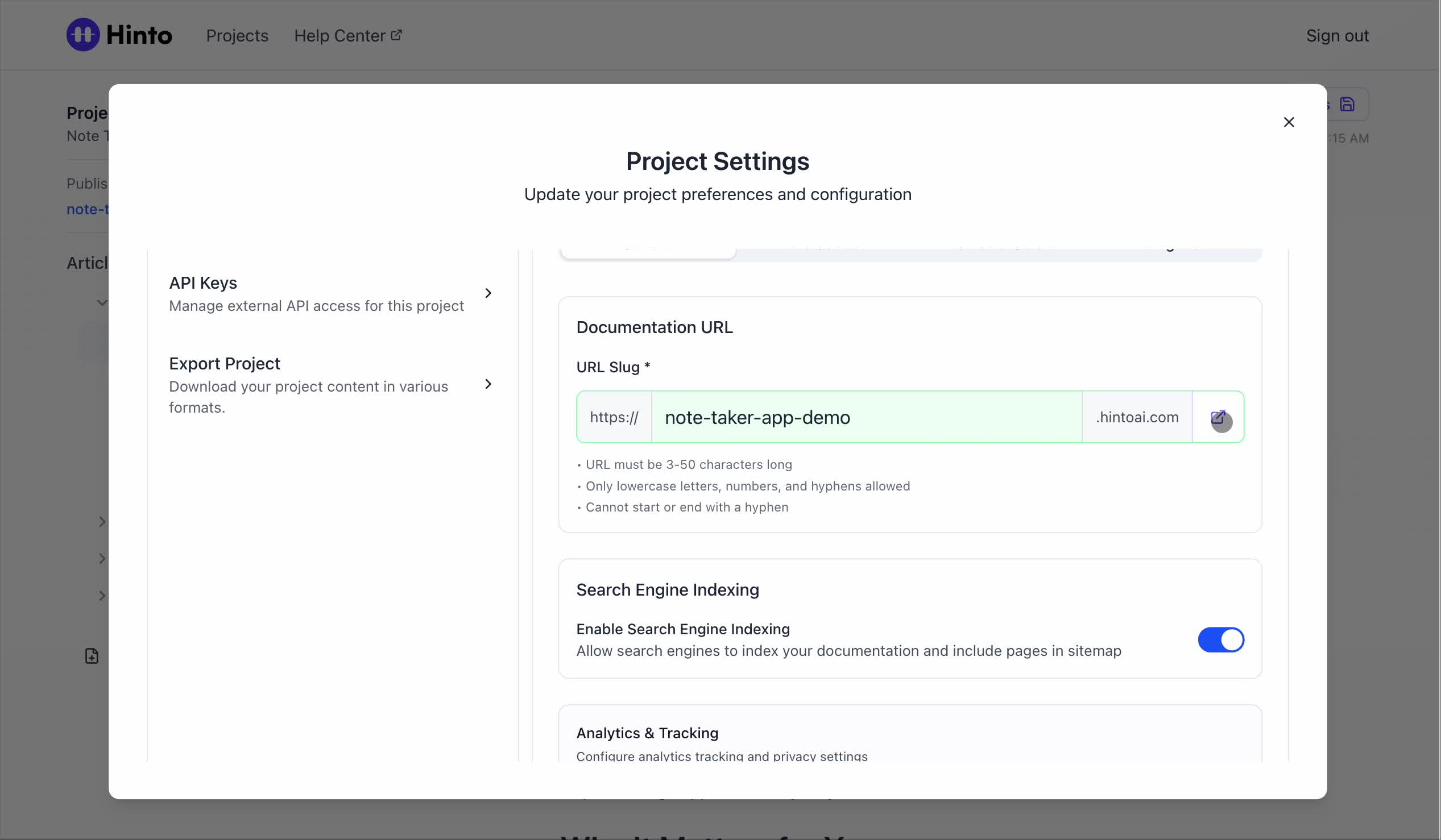 ", "format": "html" }, "project": { "slug": "project-slug", "name": "Project Name" } } ``` **Response (Markdown format):** ``` { "article": { "id": 1, "title": "Article Title", "project_id": "uuid", "folder_id": 1, "created_at": "2024-01-01T00:00:00Z", "updated_at": "2024-01-01T00:00:00Z" }, "content": { "markdown": "# Article Title\n\nArticle content...", "format": "markdown" }, "project": { "slug": "project-slug", "name": "Project Name" } } ``` ### 3. Export Complete Project **Endpoint:** GET /api/external/v1/projects/export **Authentication:** Required (Project API Key) Downloads the entire project as a ZIP archive or single file. **Query Parameters:** - format (optional): Export format - html (default): HTML files in ZIP archive - markdown: Markdown files in ZIP archive - llm-text: Single plain text file (all articles combined) **Response:** - For html/markdown: Binary ZIP file download with folder structure - Content-Type: application/zip - Content-Disposition: attachment; filename="project-name.zip" - For llm-text: Plain text file download (single file) - Content-Type: text/plain - Content-Disposition: attachment; filename="project-name.txt" ## Error Responses All endpoints return consistent error responses: ``` { "error": "Error type", "message": "Detailed error message" } ``` Common error codes: - 401 - Missing or invalid API key - 403 - Access denied to resource - 404 - Resource not found - 405 - Method not allowed - 500 - Internal server error ## Usage Examples ### Get Project Structure ``` curl -H "X-API-Key: your-api-key" \ https://app.hintoai.com/api/external/v1/projects/structure ``` ### Get Specific Article (HTML) ``` curl -H "X-API-Key: your-api-key" \ https://app.hintoai.com/api/external/v1/articles/123 ``` ### Get Article in Markdown Format ``` curl -H "X-API-Key: your-api-key" \ https://app.hintoai.com/api/external/v1/articles/123?format=markdown ``` ### Get Article with Clean HTML ``` curl -H "X-API-Key: your-api-key" \ https://app.hintoai.com/api/external/v1/articles/123?clean=true ``` ### Export Project as ZIP ``` curl -H "X-API-Key: your-api-key" \ https://app.hintoai.com/api/external/v1/projects/export?format=html \ -o project-export.zip ``` ### Export Project as LLM Text ``` curl -H "X-API-Key: your-api-key" \ https://app.hintoai.com/api/external/v1/projects/export?format=llm-text \ -o project-export.txt ``` ### Export Project as Markdown ``` curl -H "X-API-Key: your-api-key" \ https://app.hintoai.com/api/external/v1/projects/export?format=markdown \ -o project-export.zip ``` --- ### Set up webhooks for project notifications # Set up webhooks for project notifications Webhooks allow you to receive real-time notifications when specific events happen in your project, such as when it's published or archived. This guide shows you how to set up a webhook to send these notifications to an external service or application. You will need a valid endpoint URL from the service that will receive the webhook data. 1. From your project, navigate to **Project Settings**. 2. In the left-hand menu, click **API Keys & Webhooks**. 3. Select the **Webhooks** tab to open the configuration settings.  4. Click the **Enable Webhook** toggle to turn it on. 5. In the **Webhook URL** field, enter the complete URL of the endpoint that will receive the webhook notifications. This field is required.  6. Under **Events to Trigger**, select the checkboxes for the events you want notifications for. You can choose from **Publish**, **Republish**, **Unpublish**, and **Archive**.  7. Optionally, add custom headers for authentication. Click **+ Add Header** and enter the **Header name** and **Header value**.  8. Click **Save Configuration** to activate your webhook. ## Summary This article explains how to configure webhooks for your projects. Setting up a webhook enables Hinto AI to automatically send notifications to your specified URL when key project events occur, such as publishing or archiving, which helps automate your workflows and integrate with other tools. ## Related - [Generate and manage API keys](/docs/integrations/generate-and-manage-api-keys) - [API Documentation](/docs/integrations/api-documentation) - [How to publish your project](/docs/publishing-documentation/how-to-publish-your-project-with-a-public-url) --- ### Framer Integration #### Connect Hinto AI with Framer # How to Connect Hinto AI with Framer This guide explains how to connect your Hinto AI knowledge base with Framer. By following these steps, you can seamlessly import your documentation, including articles and folders, directly into Framer's CMS. This allows you to build a fully functional, dynamic help center on your Framer site. You will need active accounts for both Hinto AI and Framer. ## Part 1: Syncing Your Articles. 1. In your Framer project, navigate to the **CMS** panel on the left sidebar. 2. Open the command palette by pressing **Cmd/Ctrl + K** or click the **plugin** icon at the bottom of the canvas. Search for **Hinto AI** and select it to launch the plugin.  3. In the **New Collection** window that appears, enter 'Articles' as the name and click **Create**. This collection will store all your individual help articles.  4. To get your API key, navigate to the Hinto AI web app and open your project. 5. Click the settings icon to open **Project Settings** and select **API Keys** from the side menu. 6. Click the **New API Key +** button. 7. Enter a descriptive name for your key (e.g., 'Framer Integration') and click **Create API Key**. 1. Click the copy icon to copy the new API key to your clipboard. 2. Return to Framer, paste the key into the **API Key** field, and click **Continue**.  1. In the Hinto Content Sync window, ensure the **Content Type** is set to **Articles**. 2. (Optional) For internal links to function correctly, expand **Advanced Settings** and enter your site’s full base URL path where articles will live (e.g., https://yourdomain.com/docs). 3. Click **Import** to begin syncing. Your Hinto A