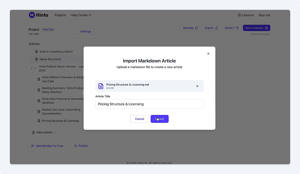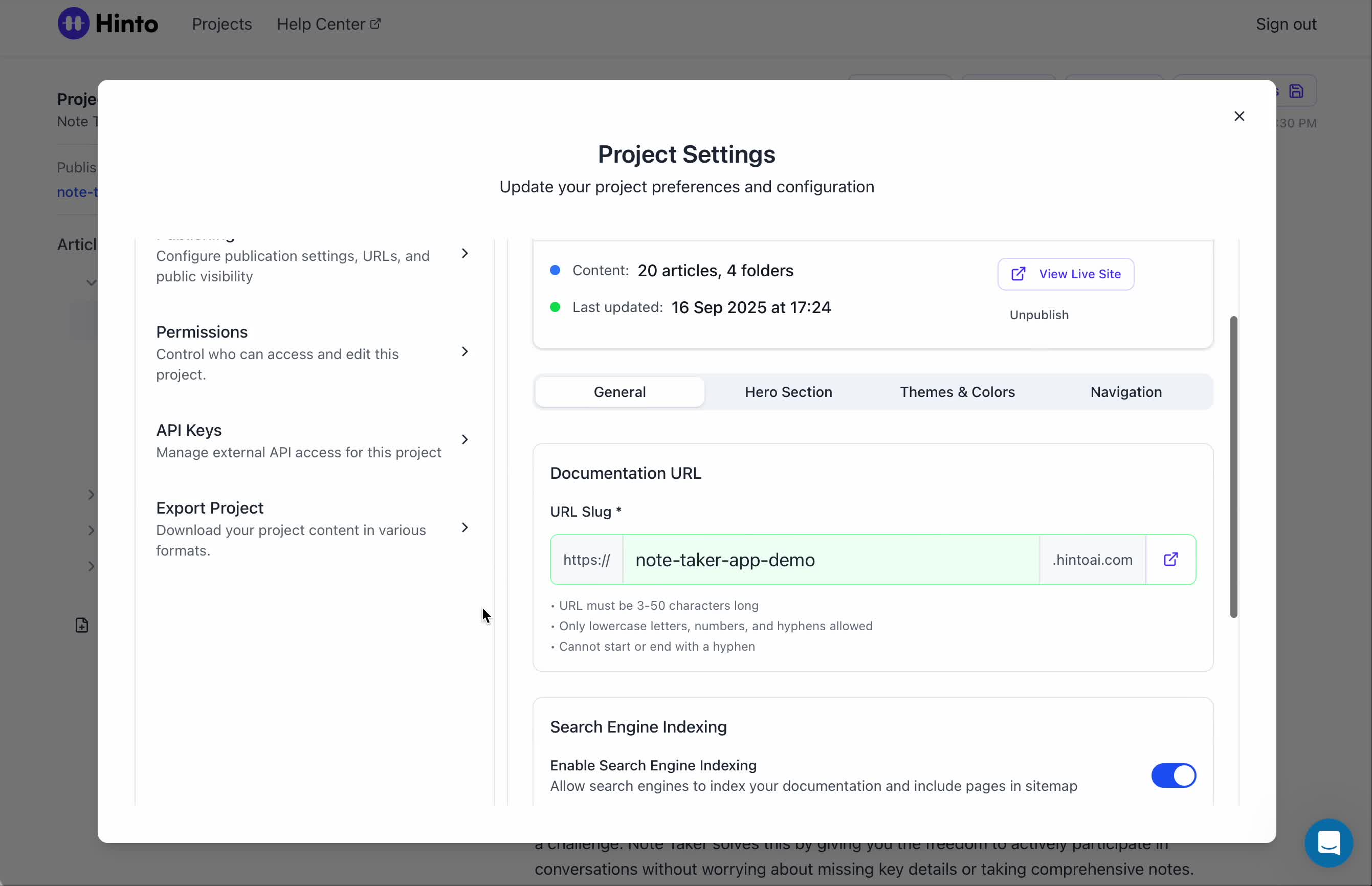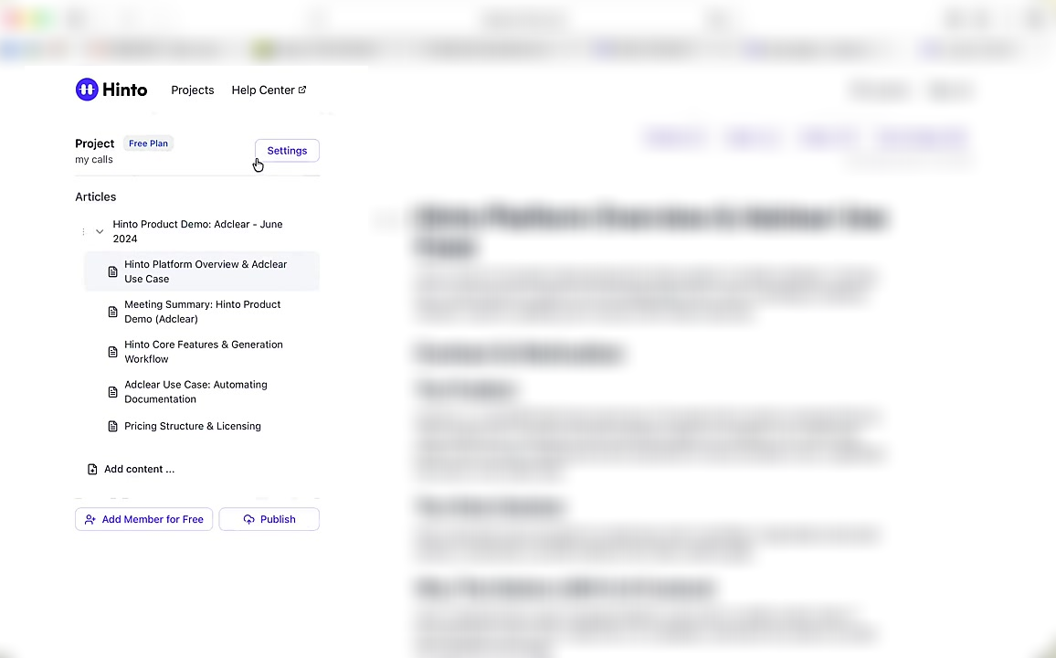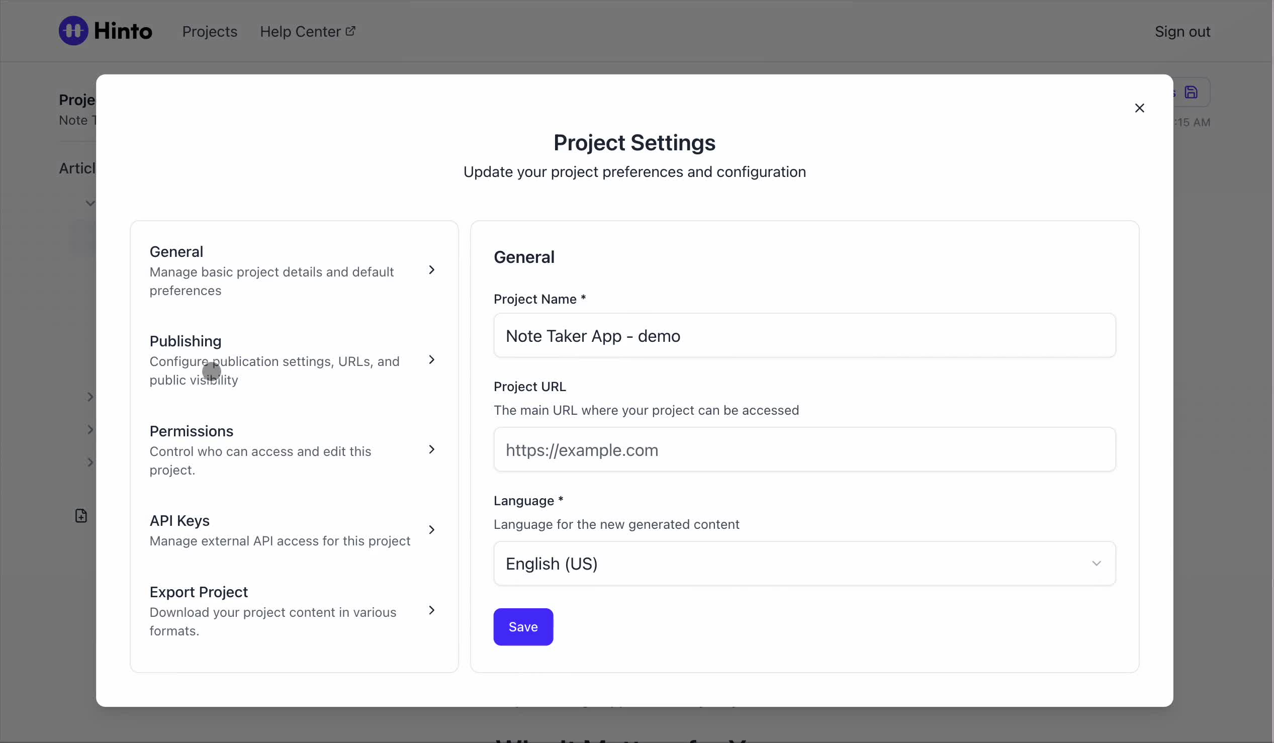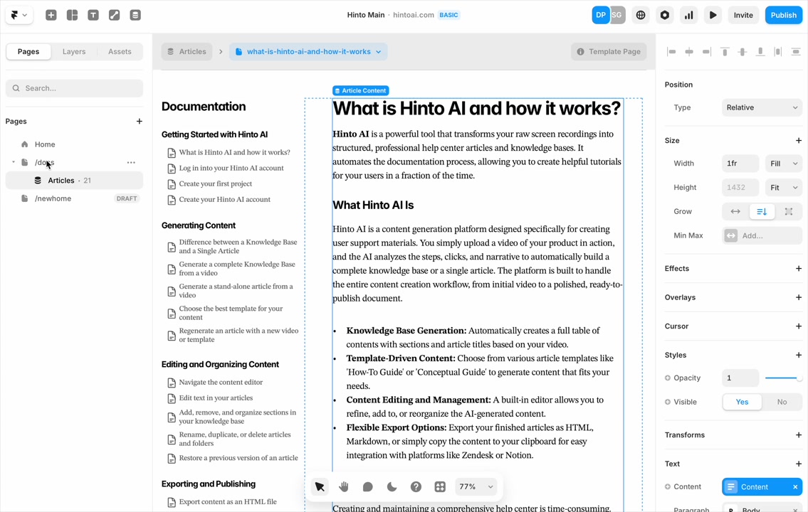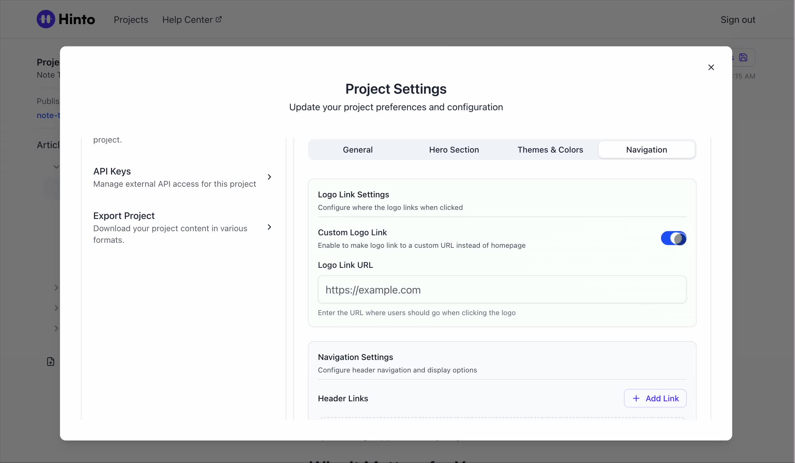 ", "format": "html" }, "project": { "slug": "project-slug", "name": "Project Name" } } ``` **Response (Markdown format):** ``` { "article": { "id": 1, "title": "Article Title", "project_id": "uuid", "folder_id": 1, "created_at": "2024-01-01T00:00:00Z", "updated_at": "2024-01-01T00:00:00Z" }, "content": { "markdown": "# Article Title\n\nArticle content...", "format": "markdown" }, "project": { "slug": "project-slug", "name": "Project Name" } } ``` ### 3. Export Complete Project **Endpoint:** GET /api/external/v1/projects/export **Authentication:** Required (Project API Key) Downloads the entire project as a ZIP archive or single file. **Query Parameters:** - format (optional): Export format - html (default): HTML files in ZIP archive - markdown: Markdown files in ZIP archive - llm-text: Single plain text file (all articles combined) **Response:** - For html/markdown: Binary ZIP file download with folder structure - Content-Type: application/zip - Content-Disposition: attachment; filename="project-name.zip" - For llm-text: Plain text file download (single file) - Content-Type: text/plain - Content-Disposition: attachment; filename="project-name.txt" ## Error Responses All endpoints return consistent error responses: ``` { "error": "Error type", "message": "Detailed error message" } ``` Common error codes: - 401 - Missing or invalid API key - 403 - Access denied to resource - 404 - Resource not found - 405 - Method not allowed - 500 - Internal server error ## Usage Examples ### Get Project Structure ``` curl -H "X-API-Key: your-api-key" \ https://app.hintoai.com/api/external/v1/projects/structure ``` ### Get Specific Article (HTML) ``` curl -H "X-API-Key: your-api-key" \ https://app.hintoai.com/api/external/v1/articles/123 ``` ### Get Article in Markdown Format ``` curl -H "X-API-Key: your-api-key" \ https://app.hintoai.com/api/external/v1/articles/123?format=markdown ``` ### Get Article with Clean HTML ``` curl -H "X-API-Key: your-api-key" \ https://app.hintoai.com/api/external/v1/articles/123?clean=true ``` ### Export Project as ZIP ``` curl -H "X-API-Key: your-api-key" \ https://app.hintoai.com/api/external/v1/projects/export?format=html \ -o project-export.zip ``` ### Export Project as LLM Text ``` curl -H "X-API-Key: your-api-key" \ https://app.hintoai.com/api/external/v1/projects/export?format=llm-text \ -o project-export.txt ``` ### Export Project as Markdown ``` curl -H "X-API-Key: your-api-key" \ https://app.hintoai.com/api/external/v1/projects/export?format=markdown \ -o project-export.zip ``` --- ### Set up webhooks for project notifications # Set up webhooks for project notifications Webhooks allow you to receive real-time notifications when specific events happen in your project, such as when it's published or archived. This guide shows you how to set up a webhook to send these notifications to an external service or application. You will need a valid endpoint URL from the service that will receive the webhook data. 1. From your project, navigate to **Project Settings**. 2. In the left-hand menu, click **API Keys & Webhooks**. 3. Select the **Webhooks** tab to open the configuration settings.  4. Click the **Enable Webhook** toggle to turn it on. 5. In the **Webhook URL** field, enter the complete URL of the endpoint that will receive the webhook notifications. This field is required.  6. Under **Events to Trigger**, select the checkboxes for the events you want notifications for. You can choose from **Publish**, **Republish**, **Unpublish**, and **Archive**.  7. Optionally, add custom headers for authentication. Click **+ Add Header** and enter the **Header name** and **Header value**.  8. Click **Save Configuration** to activate your webhook. ## Summary This article explains how to configure webhooks for your projects. Setting up a webhook enables Hinto AI to automatically send notifications to your specified URL when key project events occur, such as publishing or archiving, which helps automate your workflows and integrate with other tools. ## Related - [Generate and manage API keys](/docs/integrations/generate-and-manage-api-keys) - [API Documentation](/docs/integrations/api-documentation) - [How to publish your project](/docs/publishing-documentation/how-to-publish-your-project-with-a-public-url) --- ### Framer Integration #### Connect Hinto AI with Framer # How to Connect Hinto AI with Framer This guide explains how to connect your Hinto AI knowledge base with Framer. By following these steps, you can seamlessly import your documentation, including articles and folders, directly into Framer's CMS. This allows you to build a fully functional, dynamic help center on your Framer site. You will need active accounts for both Hinto AI and Framer. ## Part 1: Syncing Your Articles. 1. In your Framer project, navigate to the **CMS** panel on the left sidebar. 2. Open the command palette by pressing **Cmd/Ctrl + K** or click the **plugin** icon at the bottom of the canvas. Search for **Hinto AI** and select it to launch the plugin.  3. In the **New Collection** window that appears, enter 'Articles' as the name and click **Create**. This collection will store all your individual help articles.  4. To get your API key, navigate to the Hinto AI web app and open your project. 5. Click the settings icon to open **Project Settings** and select **API Keys** from the side menu. 6. Click the **New API Key +** button. 7. Enter a descriptive name for your key (e.g., 'Framer Integration') and click **Create API Key**. 1. Click the copy icon to copy the new API key to your clipboard. 2. Return to Framer, paste the key into the **API Key** field, and click **Continue**.  1. In the Hinto Content Sync window, ensure the **Content Type** is set to **Articles**. 2. (Optional) For internal links to function correctly, expand **Advanced Settings** and enter your site’s full base URL path where articles will live (e.g., https://yourdomain.com/docs). 3. Click **Import** to begin syncing. Your Hinto A