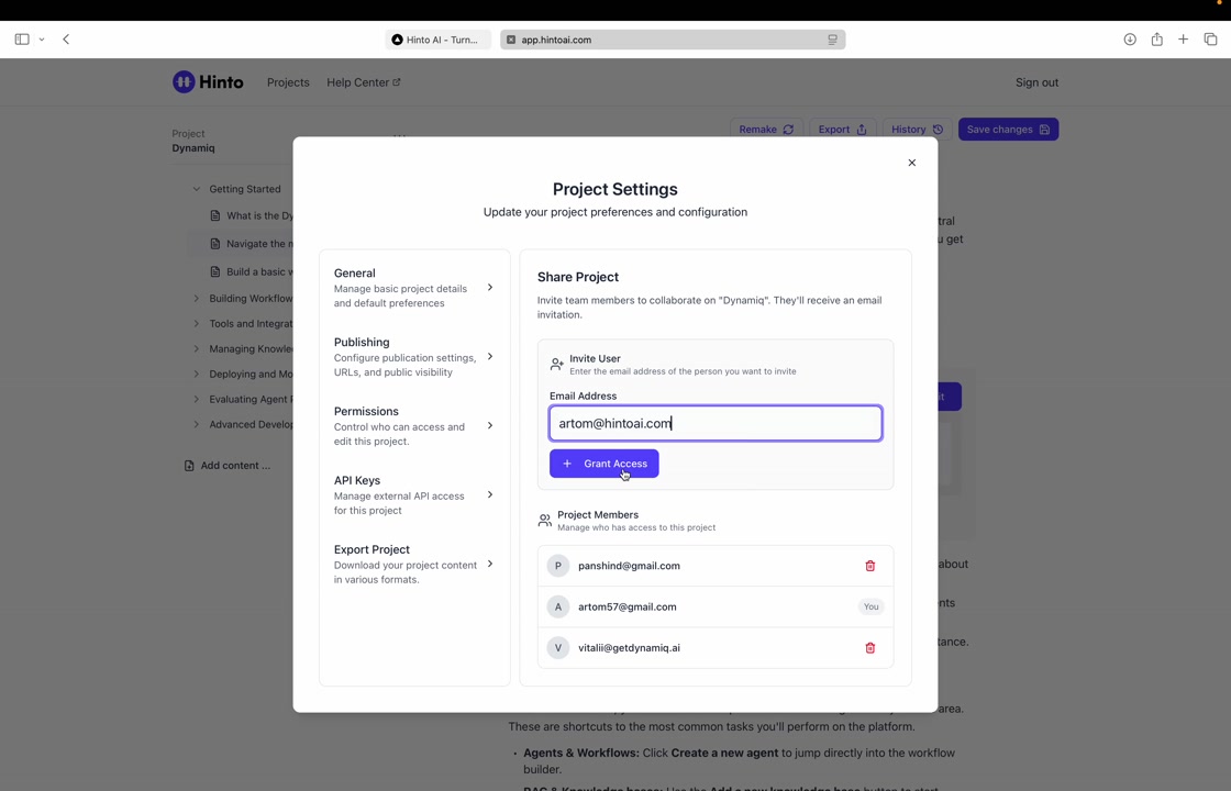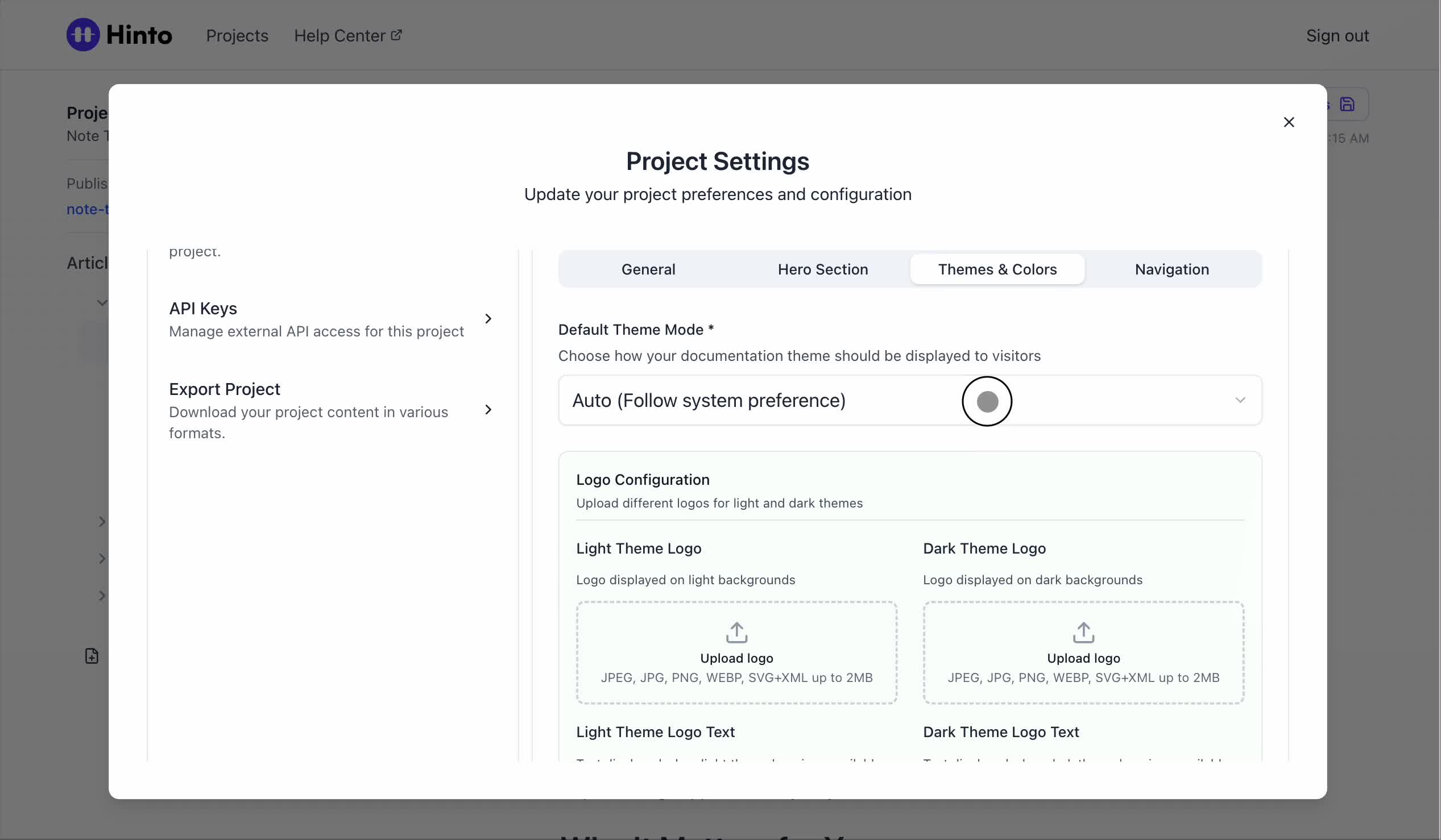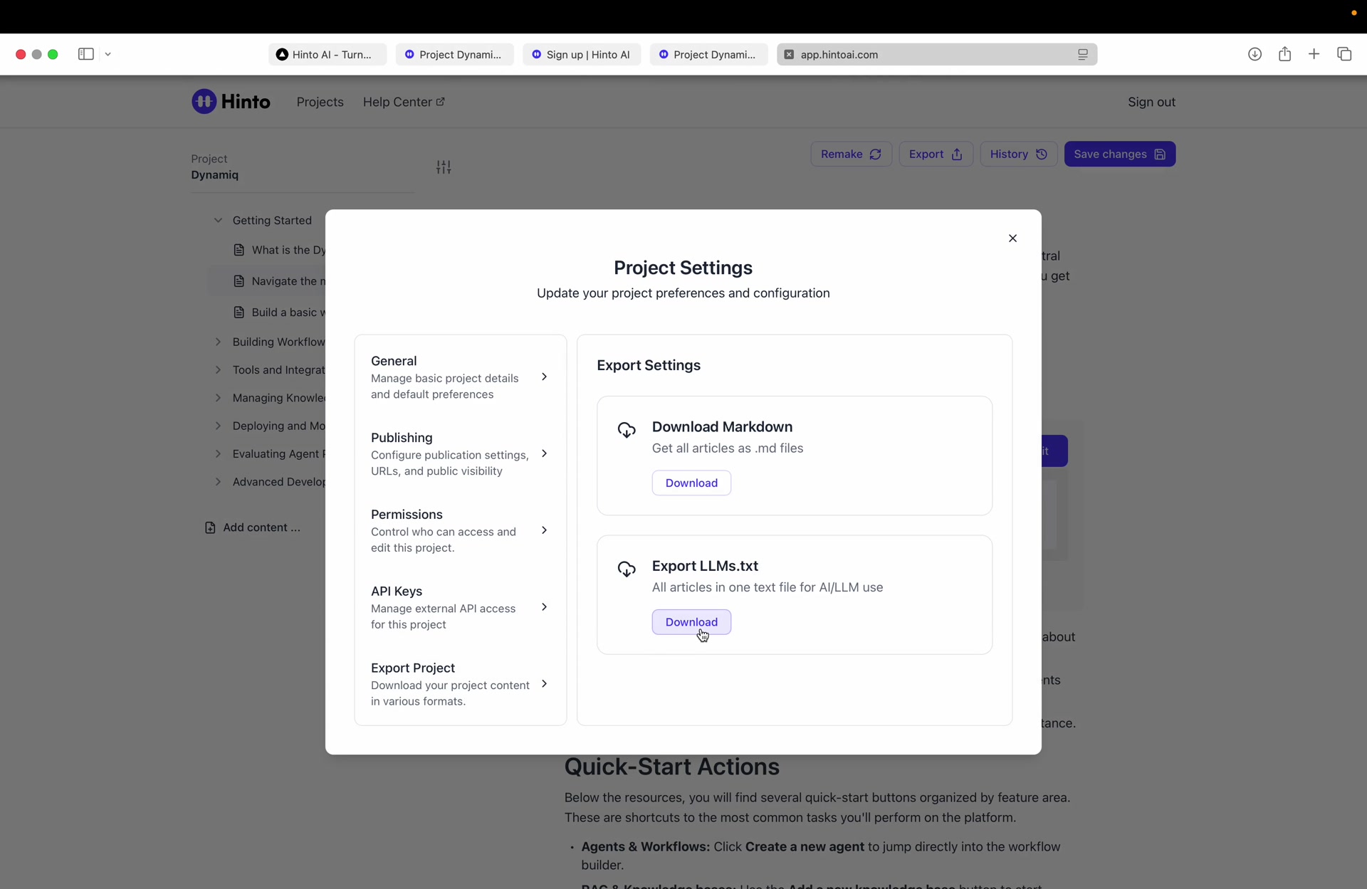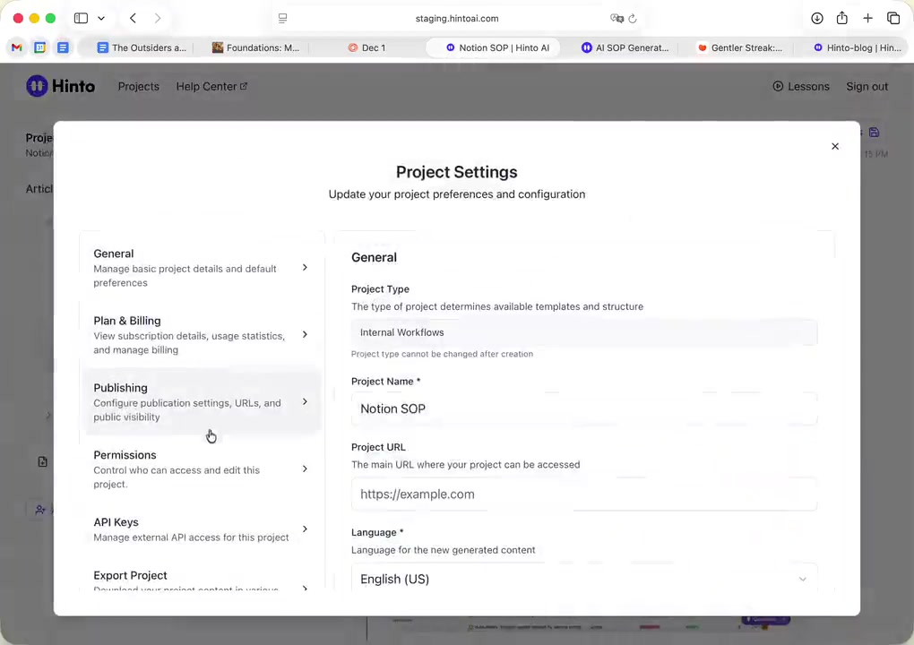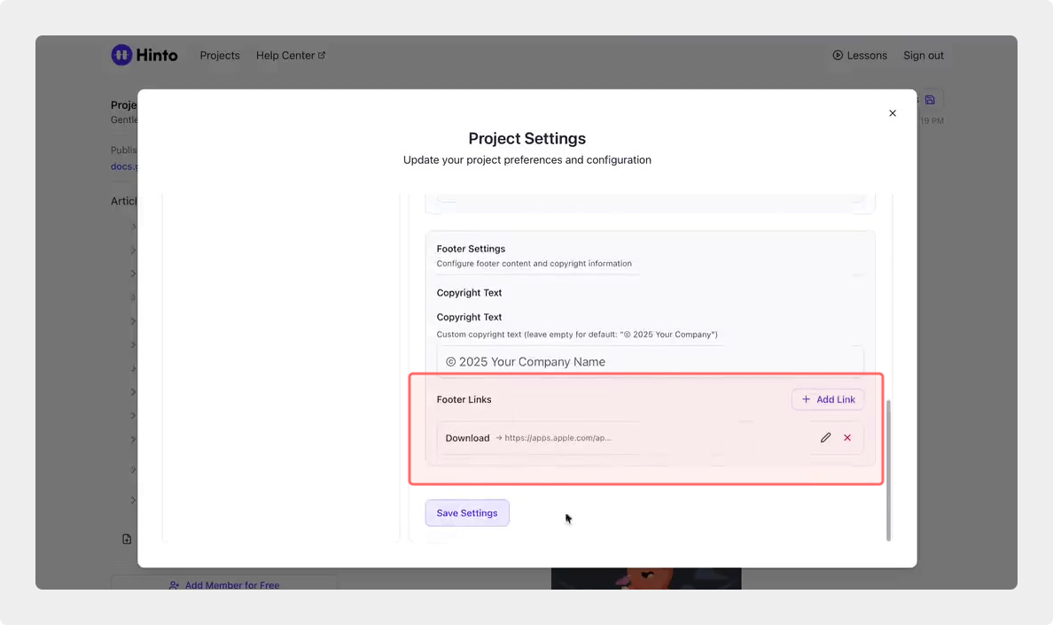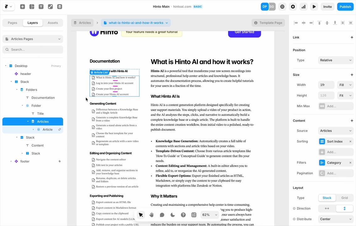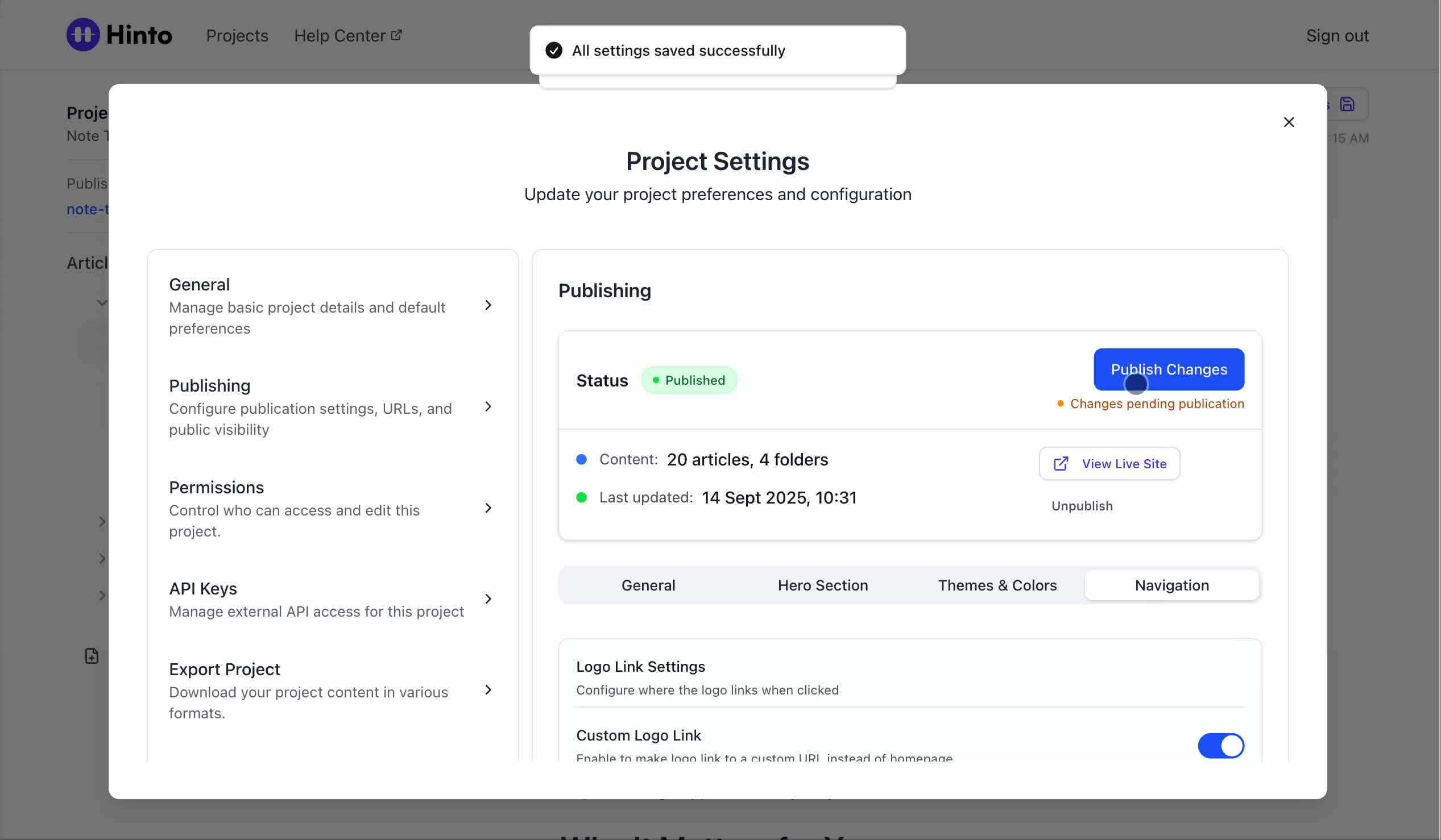 ", "format": "html" }, "project": { "slug": "project-slug", "name": "Project Name" } } ``` **Response (Markdown format):** ``` { "article": { "id": 1, "title": "Article Title", "project_id": "uuid", "folder_id": 1, "created_at": "2024-01-01T00:00:00Z", "updated_at": "2024-01-01T00:00:00Z" }, "content": { "markdown": "# Article Title\n\nArticle content...", "format": "markdown" }, "project": { "slug": "project-slug", "name": "Project Name" } } ``` ### 3. Export Complete Project **Endpoint:** GET /api/external/v1/projects/export **Authentication:** Required (Project API Key) Downloads the entire project as a ZIP archive or single file. **Query Parameters:** - format (optional): Export format - html (default): HTML files in ZIP archive - markdown: Markdown files in ZIP archive - llm-text: Single plain text file (all articles combined) **Response:** - For html/markdown: Binary ZIP file download with folder structure - Content-Type: application/zip - Content-Disposition: attachment; filename="project-name.zip" - For llm-text: Plain text file download (single file) - Content-Type: text/plain - Content-Disposition: attachment; filename="project-name.txt" ## Error Responses All endpoints return consistent error responses: ``` { "error": "Error type", "message": "Detailed error message" } ``` Common error codes: - 401 - Missing or invalid API key - 403 - Access denied to resource - 404 - Resource not found - 405 - Method not allowed - 500 - Internal server error ## Usage Examples ### Get Project Structure ``` curl -H "X-API-Key: your-api-key" \ https://app.hintoai.com/api/external/v1/projects/structure ``` ### Get Specific Article (HTML) ``` curl -H "X-API-Key: your-api-key" \ https://app.hintoai.com/api/external/v1/articles/123 ``` ### Get Article in Markdown Format ``` curl -H "X-API-Key: your-api-key" \ https://app.hintoai.com/api/external/v1/articles/123?format=markdown ``` ### Get Article with Clean HTML ``` curl -H "X-API-Key: your-api-key" \ https://app.hintoai.com/api/external/v1/articles/123?clean=true ``` ### Export Project as ZIP ``` curl -H "X-API-Key: your-api-key" \ https://app.hintoai.com/api/external/v1/projects/export?format=html \ -o project-export.zip ``` ### Export Project as LLM Text ``` curl -H "X-API-Key: your-api-key" \ https://app.hintoai.com/api/external/v1/projects/export?format=llm-text \ -o project-export.txt ``` ### Export Project as Markdown ``` curl -H "X-API-Key: your-api-key" \ https://app.hintoai.com/api/external/v1/projects/export?format=markdown \ -o project-export.zip ``` --- ### Set up webhooks for project notifications # Set up webhooks for project notifications Webhooks allow you to receive real-time notifications when specific events happen in your project, such as when it's published or archived. This guide shows you how to set up a webhook to send these notifications to an external service or application. You will need a valid endpoint URL from the service that will receive the webhook data. 1. From your project, navigate to **Project Settings**. 2. In the left-hand menu, click **API Keys & Webhooks**. 3. Select the **Webhooks** tab to open the configuration settings.  4. Click the **Enable Webhook** toggle to turn it on. 5. In the **Webhook URL** field, enter the complete URL of the endpoint that will receive the webhook notifications. This field is required.  6. Under **Events to Trigger**, select the checkboxes for the events you want notifications for. You can choose from **Publish**, **Republish**, **Unpublish**, and **Archive**.  7. Optionally, add custom headers for authentication. Click **+ Add Header** and enter the **Header name** and **Header value**.  8. Click **Save Configuration** to activate your webhook. ## Summary This article explains how to configure webhooks for your projects. Setting up a webhook enables Hinto AI to automatically send notifications to your specified URL when key project events occur, such as publishing or archiving, which helps automate your workflows and integrate with other tools. ## Related - [Generate and manage API keys](/docs/integrations/generate-and-manage-api-keys) - [API Documentation](/docs/integrations/api-documentation) - [How to publish your project](/docs/publishing-documentation/how-to-publish-your-project-with-a-public-url) --- ### Framer Integration #### Connect Hinto AI with Framer # How to Connect Hinto AI with Framer This guide explains how to connect your Hinto AI knowledge base with Framer. By following these steps, you can seamlessly import your documentation, including articles and folders, directly into Framer's CMS. This allows you to build a fully functional, dynamic help center on your Framer site. You will need active accounts for both Hinto AI and Framer. ## Part 1: Syncing Your Articles. 1. In your Framer project, navigate to the **CMS** panel on the left sidebar. 2. Open the command palette by pressing **Cmd/Ctrl + K** or click the **plugin** icon at the bottom of the canvas. Search for **Hinto AI** and select it to launch the plugin.  3. In the **New Collection** window that appears, enter 'Articles' as the name and click **Create**. This collection will store all your individual help articles.  4. To get your API key, navigate to the Hinto AI web app and open your project. 5. Click the settings icon to open **Project Settings** and select **API Keys** from the side menu. 6. Click the **New API Key +** button. 7. Enter a descriptive name for your key (e.g., 'Framer Integration') and click **Create API Key**. 1. Click the copy icon to copy the new API key to your clipboard. 2. Return to Framer, paste the key into the **API Key** field, and click **Continue**.  1. In the Hinto Content Sync window, ensure the **Content Type** is set to **Articles**. 2. (Optional) For internal links to function correctly, expand **Advanced Settings** and enter your site’s full base URL path where articles will live (e.g., https://yourdomain.com/docs). 3. Click **Import** to begin syncing. Your Hinto A
