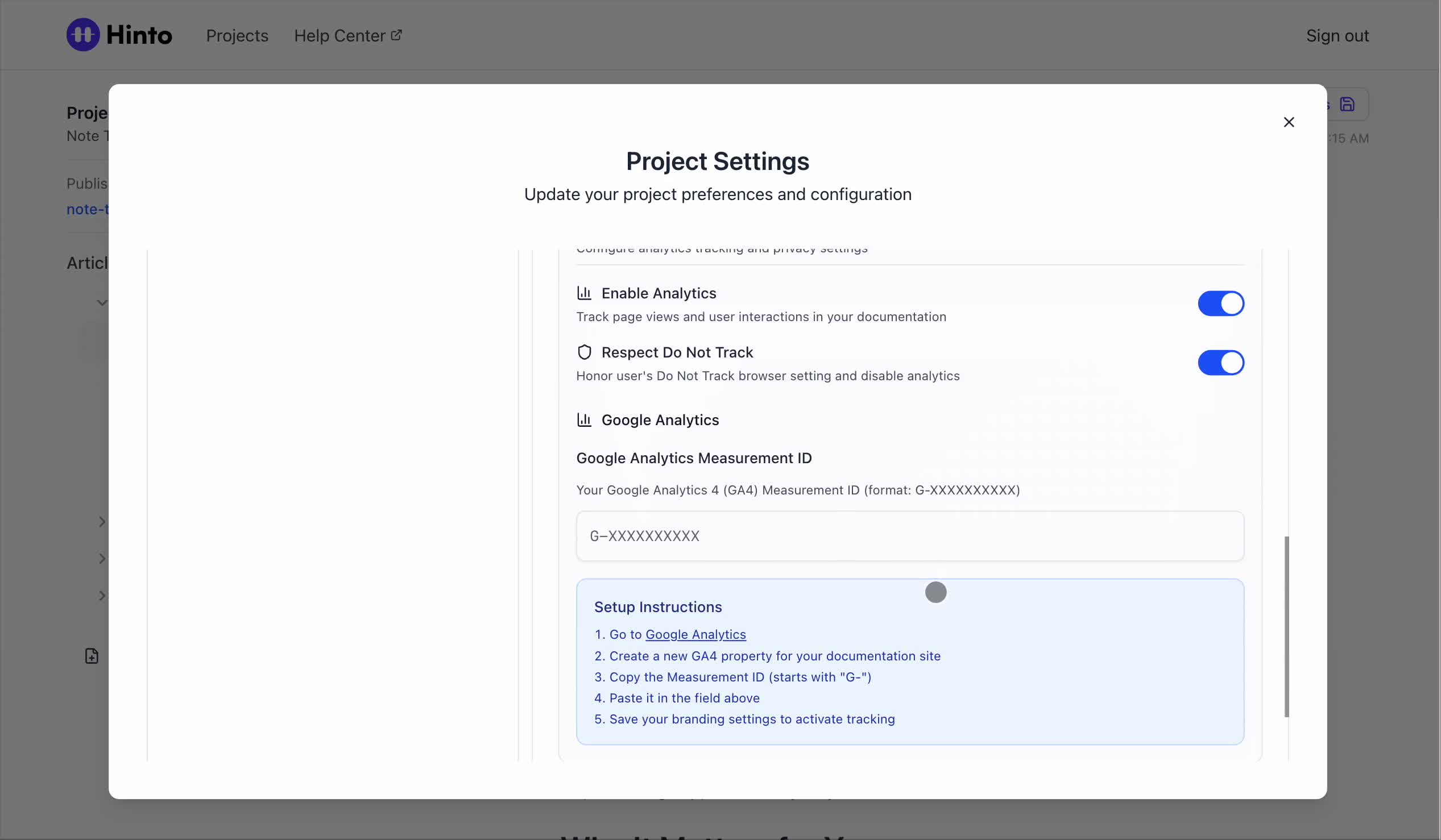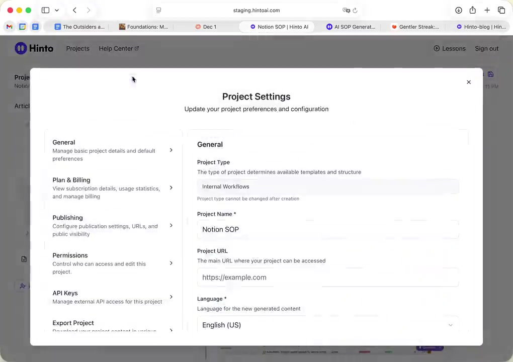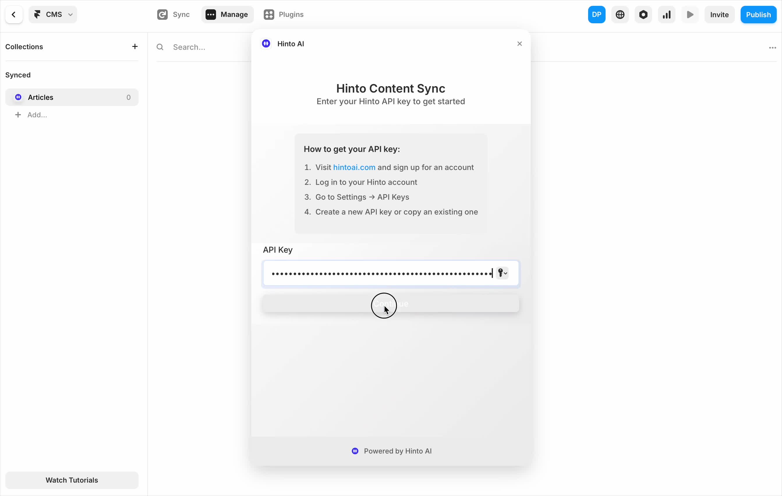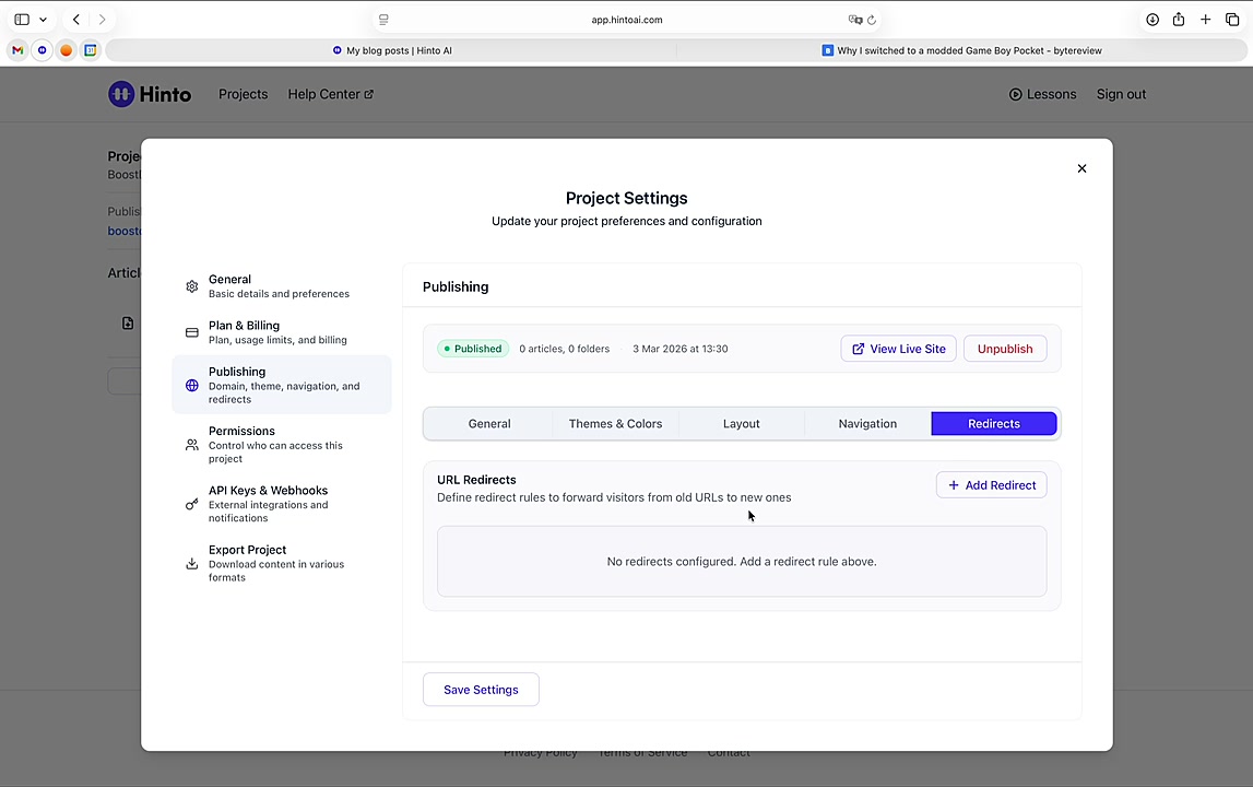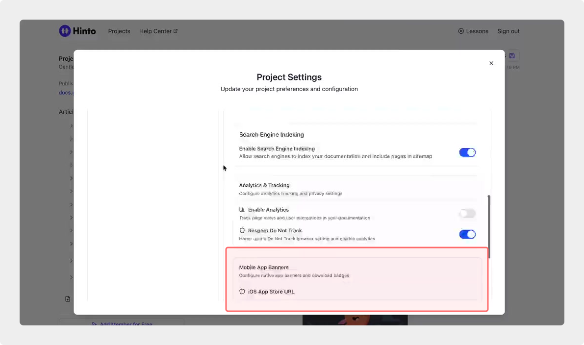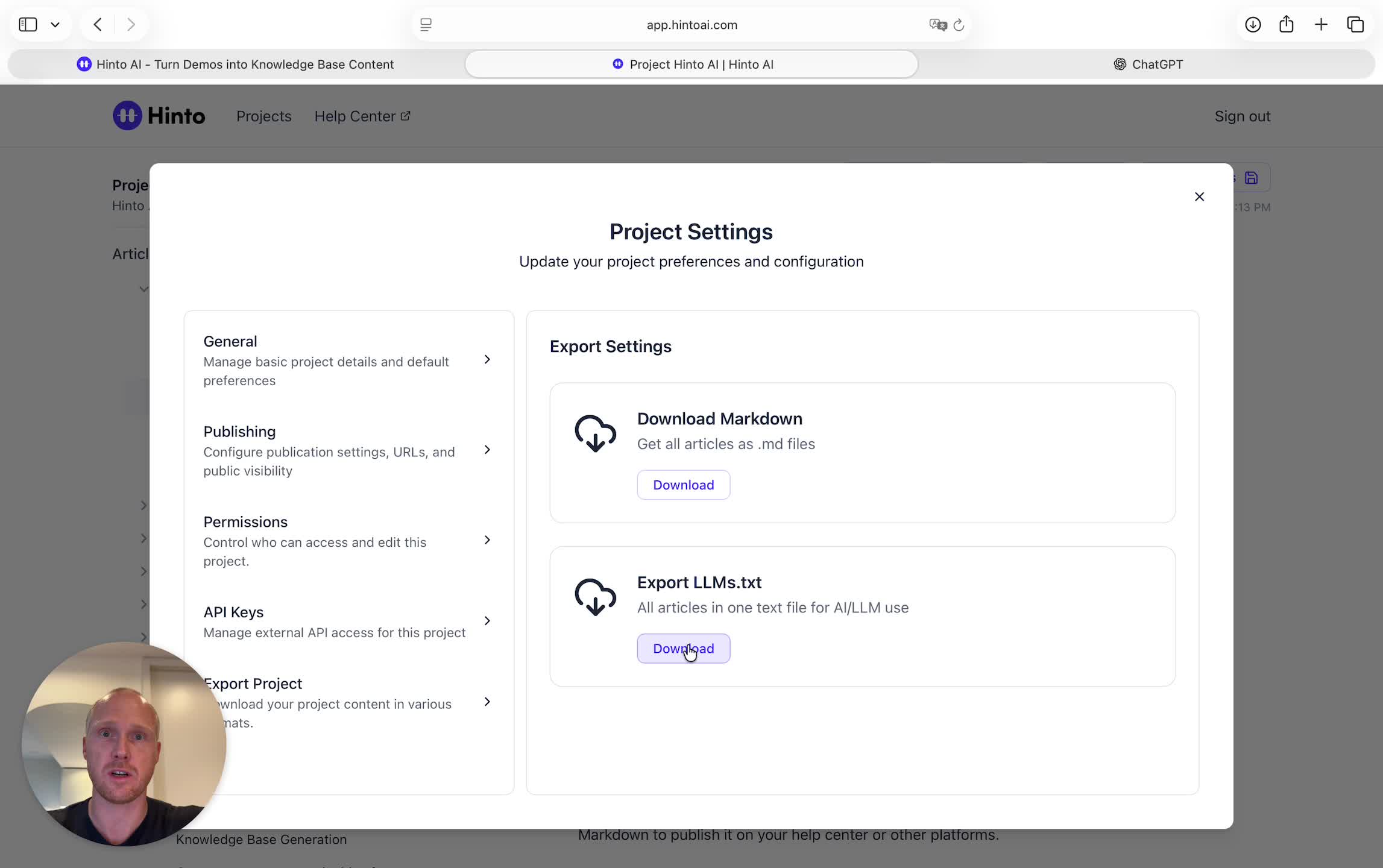 ", "format": "html" }, "project": { "slug": "project-slug", "name": "Project Name" } } ``` **Response (Markdown format):** ``` { "article": { "id": 1, "title": "Article Title", "project_id": "uuid", "folder_id": 1, "created_at": "2024-01-01T00:00:00Z", "updated_at": "2024-01-01T00:00:00Z" }, "content": { "markdown": "# Article Title\n\nArticle content...", "format": "markdown" }, "project": { "slug": "project-slug", "name": "Project Name" } } ``` ### 3. Export Complete Project **Endpoint:** GET /api/external/v1/projects/export **Authentication:** Required (Project API Key) Downloads the entire project as a ZIP archive or single file. **Query Parameters:** - format (optional): Export format - html (default): HTML files in ZIP archive - markdown: Markdown files in ZIP archive - llm-text: Single plain text file (all articles combined) **Response:** - For html/markdown: Binary ZIP file download with folder structure - Content-Type: application/zip - Content-Disposition: attachment; filename="project-name.zip" - For llm-text: Plain text file download (single file) - Content-Type: text/plain - Content-Disposition: attachment; filename="project-name.txt" ## Error Responses All endpoints return consistent error responses: ``` { "error": "Error type", "message": "Detailed error message" } ``` Common error codes: - 401 - Missing or invalid API key - 403 - Access denied to resource - 404 - Resource not found - 405 - Method not allowed - 500 - Internal server error ## Usage Examples ### Get Project Structure ``` curl -H "X-API-Key: your-api-key" \ https://app.hintoai.com/api/external/v1/projects/structure ``` ### Get Specific Article (HTML) ``` curl -H "X-API-Key: your-api-key" \ https://app.hintoai.com/api/external/v1/articles/123 ``` ### Get Article in Markdown Format ``` curl -H "X-API-Key: your-api-key" \ https://app.hintoai.com/api/external/v1/articles/123?format=markdown ``` ### Get Article with Clean HTML ``` curl -H "X-API-Key: your-api-key" \ https://app.hintoai.com/api/external/v1/articles/123?clean=true ``` ### Export Project as ZIP ``` curl -H "X-API-Key: your-api-key" \ https://app.hintoai.com/api/external/v1/projects/export?format=html \ -o project-export.zip ``` ### Export Project as LLM Text ``` curl -H "X-API-Key: your-api-key" \ https://app.hintoai.com/api/external/v1/projects/export?format=llm-text \ -o project-export.txt ``` ### Export Project as Markdown ``` curl -H "X-API-Key: your-api-key" \ https://app.hintoai.com/api/external/v1/projects/export?format=markdown \ -o project-export.zip ``` --- ### Set up webhooks for project notifications # Set up webhooks for project notifications Webhooks allow you to receive real-time notifications when specific events happen in your project, such as when it's published or archived. This guide shows you how to set up a webhook to send these notifications to an external service or application. You will need a valid endpoint URL from the service that will receive the webhook data. 1. From your project, navigate to **Project Settings**. 2. In the left-hand menu, click **API Keys & Webhooks**. 3. Select the **Webhooks** tab to open the configuration settings.  4. Click the **Enable Webhook** toggle to turn it on. 5. In the **Webhook URL** field, enter the complete URL of the endpoint that will receive the webhook notifications. This field is required.  6. Under **Events to Trigger**, select the checkboxes for the events you want notifications for. You can choose from **Publish**, **Republish**, **Unpublish**, and **Archive**.  7. Optionally, add custom headers for authentication. Click **+ Add Header** and enter the **Header name** and **Header value**.  8. Click **Save Configuration** to activate your webhook. ## Summary This article explains how to configure webhooks for your projects. Setting up a webhook enables Hinto AI to automatically send notifications to your specified URL when key project events occur, such as publishing or archiving, which helps automate your workflows and integrate with other tools. ## Related - [Generate and manage API keys](/docs/integrations/generate-and-manage-api-keys) - [API Documentation](/docs/integrations/api-documentation) - [How to publish your project](/docs/publishing-documentation/how-to-publish-your-project-with-a-public-url) --- ### Framer Integration #### Connect Hinto AI with Framer # How to Connect Hinto AI with Framer This guide explains how to connect your Hinto AI knowledge base with Framer. By following these steps, you can seamlessly import your documentation, including articles and folders, directly into Framer's CMS. This allows you to build a fully functional, dynamic help center on your Framer site. You will need active accounts for both Hinto AI and Framer. ## Part 1: Syncing Your Articles. 1. In your Framer project, navigate to the **CMS** panel on the left sidebar. 2. Open the command palette by pressing **Cmd/Ctrl + K** or click the **plugin** icon at the bottom of the canvas. Search for **Hinto AI** and select it to launch the plugin.  3. In the **New Collection** window that appears, enter 'Articles' as the name and click **Create**. This collection will store all your individual help articles.  4. To get your API key, navigate to the Hinto AI web app and open your project. 5. Click the settings icon to open **Project Settings** and select **API Keys** from the side menu. 6. Click the **New API Key +** button. 7. Enter a descriptive name for your key (e.g., 'Framer Integration') and click **Create API Key**. 1. Click the copy icon to copy the new API key to your clipboard. 2. Return to Framer, paste the key into the **API Key** field, and click **Continue**.  1. In the Hinto Content Sync window, ensure the **Content Type** is set to **Articles**. 2. (Optional) For internal links to function correctly, expand **Advanced Settings** and enter your site’s full base URL path where articles will live (e.g., https://yourdomain.com/docs). 3. Click **Import** to begin syncing. Your Hinto A