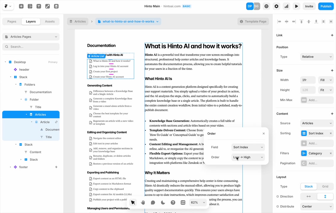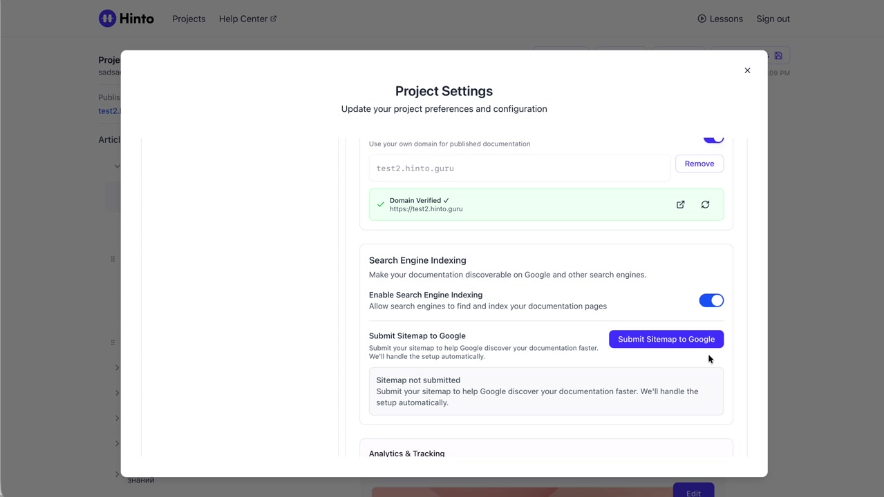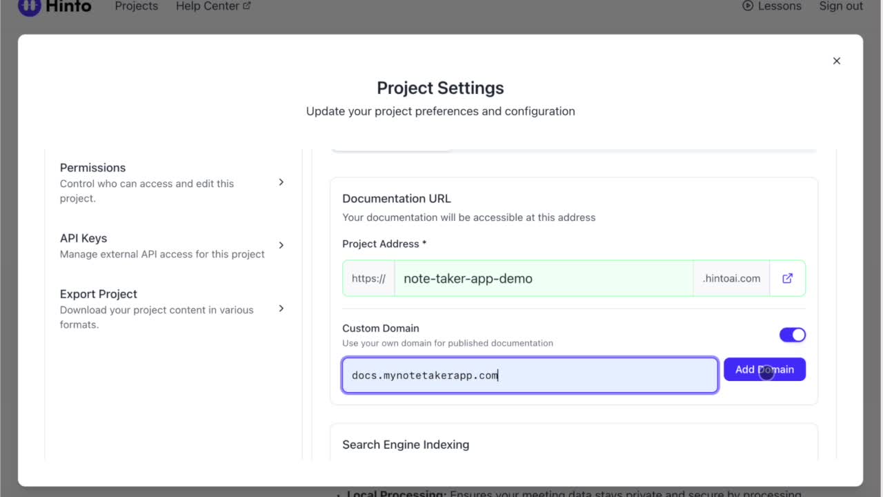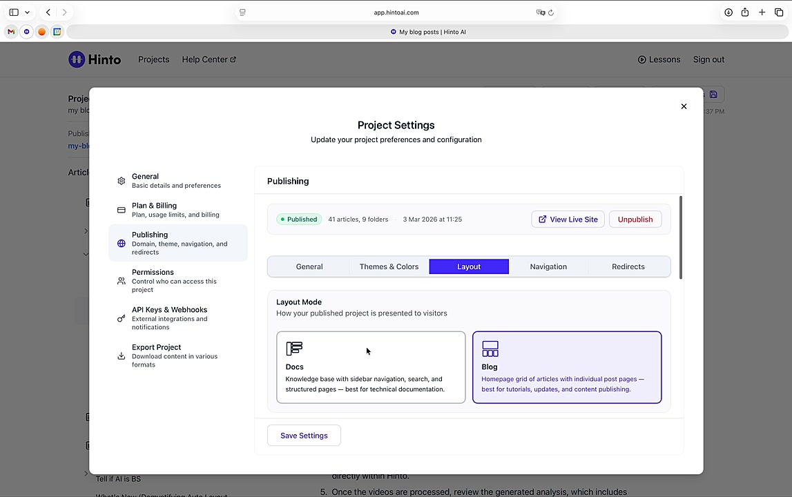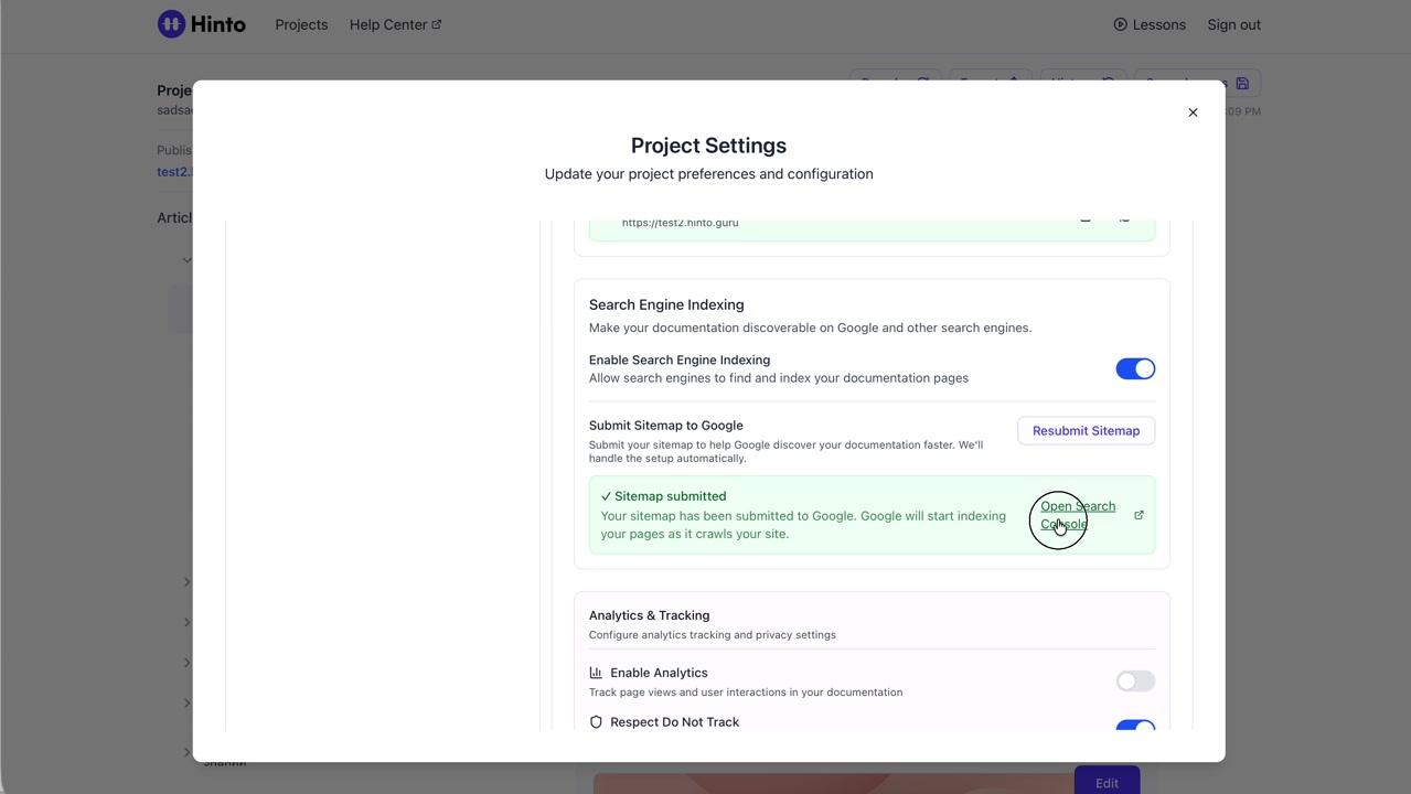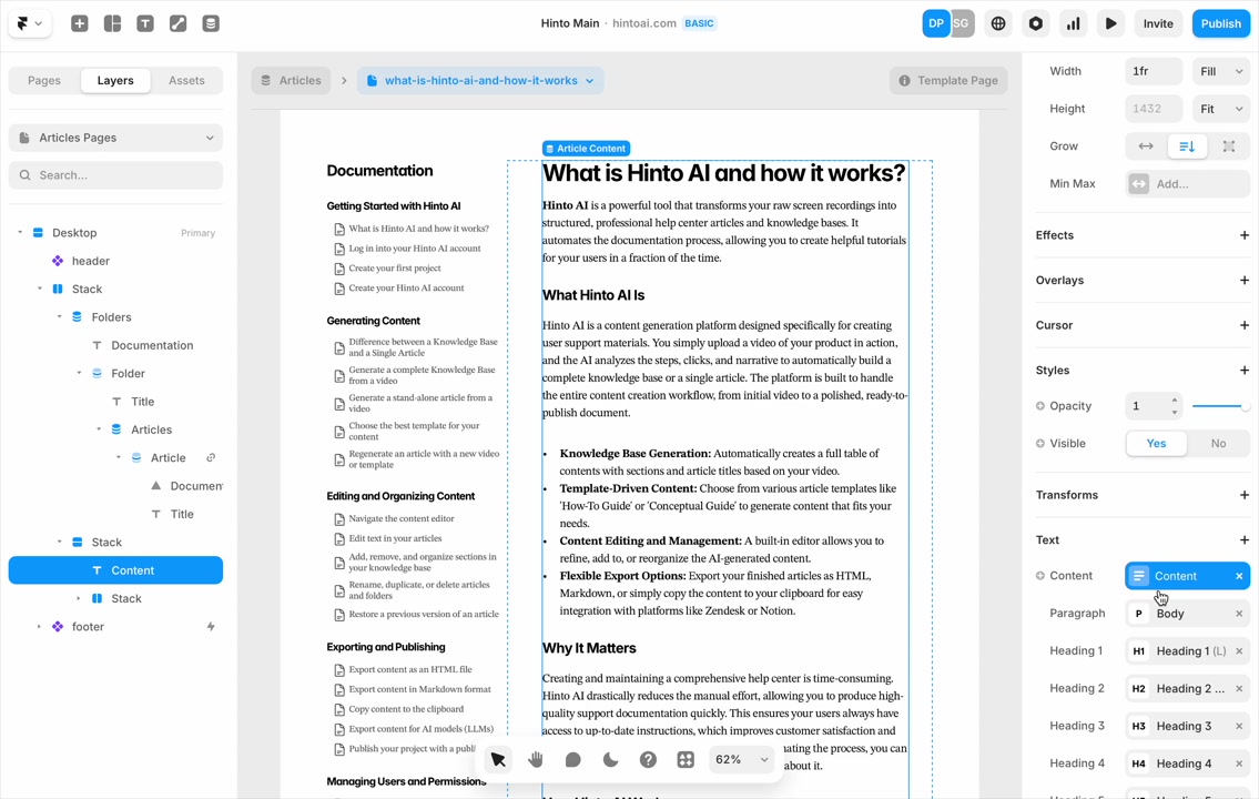 ", "format": "html" }, "project": { "slug": "project-slug", "name": "Project Name" } } ``` **Response (Markdown format):** ``` { "article": { "id": 1, "title": "Article Title", "project_id": "uuid", "folder_id": 1, "created_at": "2024-01-01T00:00:00Z", "updated_at": "2024-01-01T00:00:00Z" }, "content": { "markdown": "# Article Title\n\nArticle content...", "format": "markdown" }, "project": { "slug": "project-slug", "name": "Project Name" } } ``` ### 3. Export Complete Project **Endpoint:** GET /api/external/v1/projects/export **Authentication:** Required (Project API Key) Downloads the entire project as a ZIP archive or single file. **Query Parameters:** - format (optional): Export format - html (default): HTML files in ZIP archive - markdown: Markdown files in ZIP archive - llm-text: Single plain text file (all articles combined) **Response:** - For html/markdown: Binary ZIP file download with folder structure - Content-Type: application/zip - Content-Disposition: attachment; filename="project-name.zip" - For llm-text: Plain text file download (single file) - Content-Type: text/plain - Content-Disposition: attachment; filename="project-name.txt" ## Error Responses All endpoints return consistent error responses: ``` { "error": "Error type", "message": "Detailed error message" } ``` Common error codes: - 401 - Missing or invalid API key - 403 - Access denied to resource - 404 - Resource not found - 405 - Method not allowed - 500 - Internal server error ## Usage Examples ### Get Project Structure ``` curl -H "X-API-Key: your-api-key" \ https://app.hintoai.com/api/external/v1/projects/structure ``` ### Get Specific Article (HTML) ``` curl -H "X-API-Key: your-api-key" \ https://app.hintoai.com/api/external/v1/articles/123 ``` ### Get Article in Markdown Format ``` curl -H "X-API-Key: your-api-key" \ https://app.hintoai.com/api/external/v1/articles/123?format=markdown ``` ### Get Article with Clean HTML ``` curl -H "X-API-Key: your-api-key" \ https://app.hintoai.com/api/external/v1/articles/123?clean=true ``` ### Export Project as ZIP ``` curl -H "X-API-Key: your-api-key" \ https://app.hintoai.com/api/external/v1/projects/export?format=html \ -o project-export.zip ``` ### Export Project as LLM Text ``` curl -H "X-API-Key: your-api-key" \ https://app.hintoai.com/api/external/v1/projects/export?format=llm-text \ -o project-export.txt ``` ### Export Project as Markdown ``` curl -H "X-API-Key: your-api-key" \ https://app.hintoai.com/api/external/v1/projects/export?format=markdown \ -o project-export.zip ``` --- ### Set up webhooks for project notifications # Set up webhooks for project notifications Webhooks allow you to receive real-time notifications when specific events happen in your project, such as when it's published or archived. This guide shows you how to set up a webhook to send these notifications to an external service or application. You will need a valid endpoint URL from the service that will receive the webhook data. 1. From your project, navigate to **Project Settings**. 2. In the left-hand menu, click **API Keys & Webhooks**. 3. Select the **Webhooks** tab to open the configuration settings.  4. Click the **Enable Webhook** toggle to turn it on. 5. In the **Webhook URL** field, enter the complete URL of the endpoint that will receive the webhook notifications. This field is required.  6. Under **Events to Trigger**, select the checkboxes for the events you want notifications for. You can choose from **Publish**, **Republish**, **Unpublish**, and **Archive**.  7. Optionally, add custom headers for authentication. Click **+ Add Header** and enter the **Header name** and **Header value**.  8. Click **Save Configuration** to activate your webhook. ## Summary This article explains how to configure webhooks for your projects. Setting up a webhook enables Hinto AI to automatically send notifications to your specified URL when key project events occur, such as publishing or archiving, which helps automate your workflows and integrate with other tools. ## Related - [Generate and manage API keys](/docs/integrations/generate-and-manage-api-keys) - [API Documentation](/docs/integrations/api-documentation) - [How to publish your project](/docs/publishing-documentation/how-to-publish-your-project-with-a-public-url) --- ### Framer Integration #### Connect Hinto AI with Framer # How to Connect Hinto AI with Framer This guide explains how to connect your Hinto AI knowledge base with Framer. By following these steps, you can seamlessly import your documentation, including articles and folders, directly into Framer's CMS. This allows you to build a fully functional, dynamic help center on your Framer site. You will need active accounts for both Hinto AI and Framer. ## Part 1: Syncing Your Articles. 1. In your Framer project, navigate to the **CMS** panel on the left sidebar. 2. Open the command palette by pressing **Cmd/Ctrl + K** or click the **plugin** icon at the bottom of the canvas. Search for **Hinto AI** and select it to launch the plugin.  3. In the **New Collection** window that appears, enter 'Articles' as the name and click **Create**. This collection will store all your individual help articles.  4. To get your API key, navigate to the Hinto AI web app and open your project. 5. Click the settings icon to open **Project Settings** and select **API Keys** from the side menu. 6. Click the **New API Key +** button. 7. Enter a descriptive name for your key (e.g., 'Framer Integration') and click **Create API Key**. 1. Click the copy icon to copy the new API key to your clipboard. 2. Return to Framer, paste the key into the **API Key** field, and click **Continue**.  1. In the Hinto Content Sync window, ensure the **Content Type** is set to **Articles**. 2. (Optional) For internal links to function correctly, expand **Advanced Settings** and enter your site’s full base URL path where articles will live (e.g., https://yourdomain.com/docs). 3. Click **Import** to begin syncing. Your Hinto A