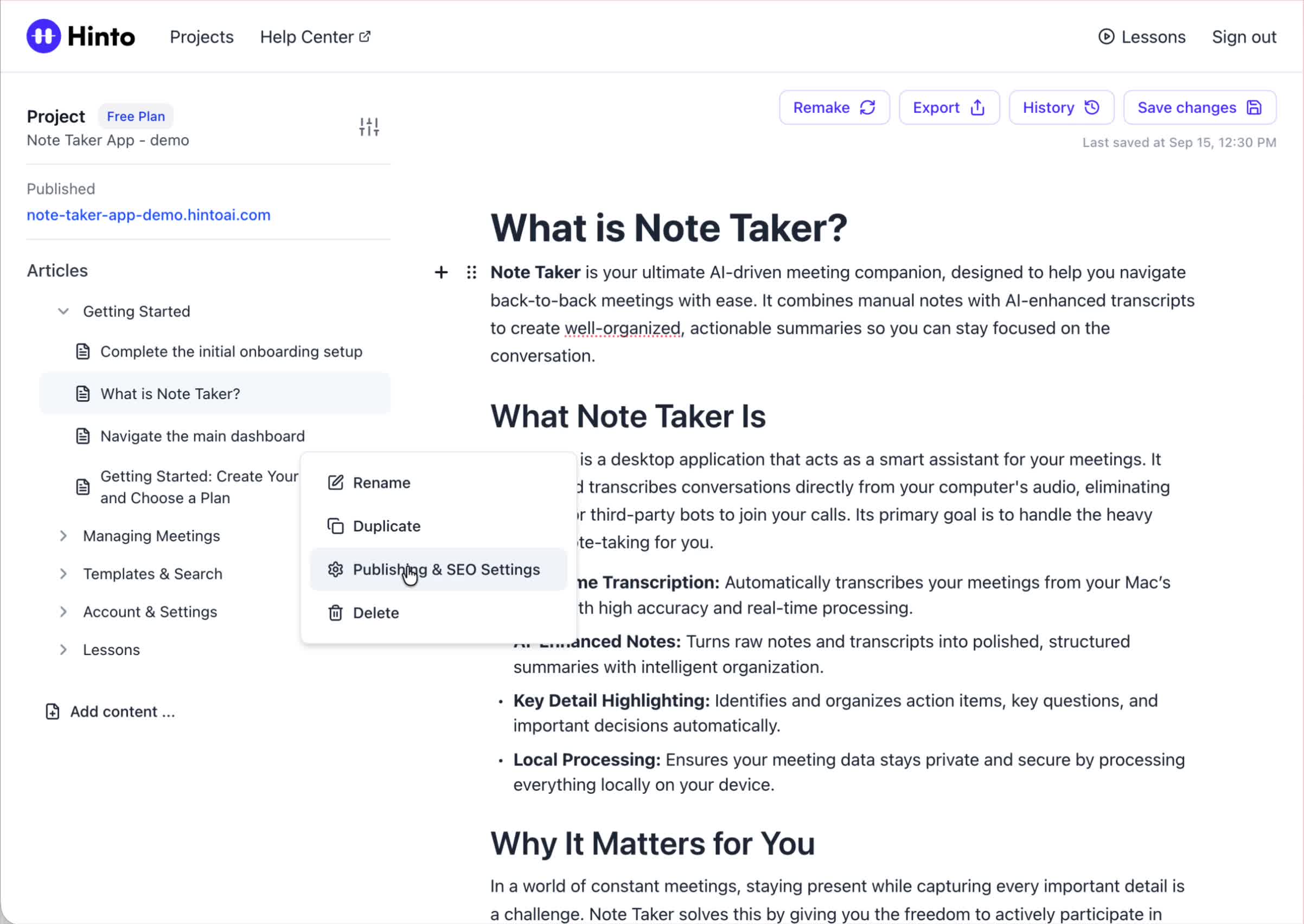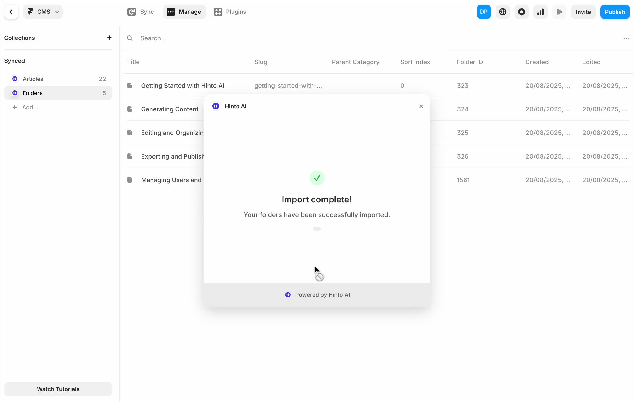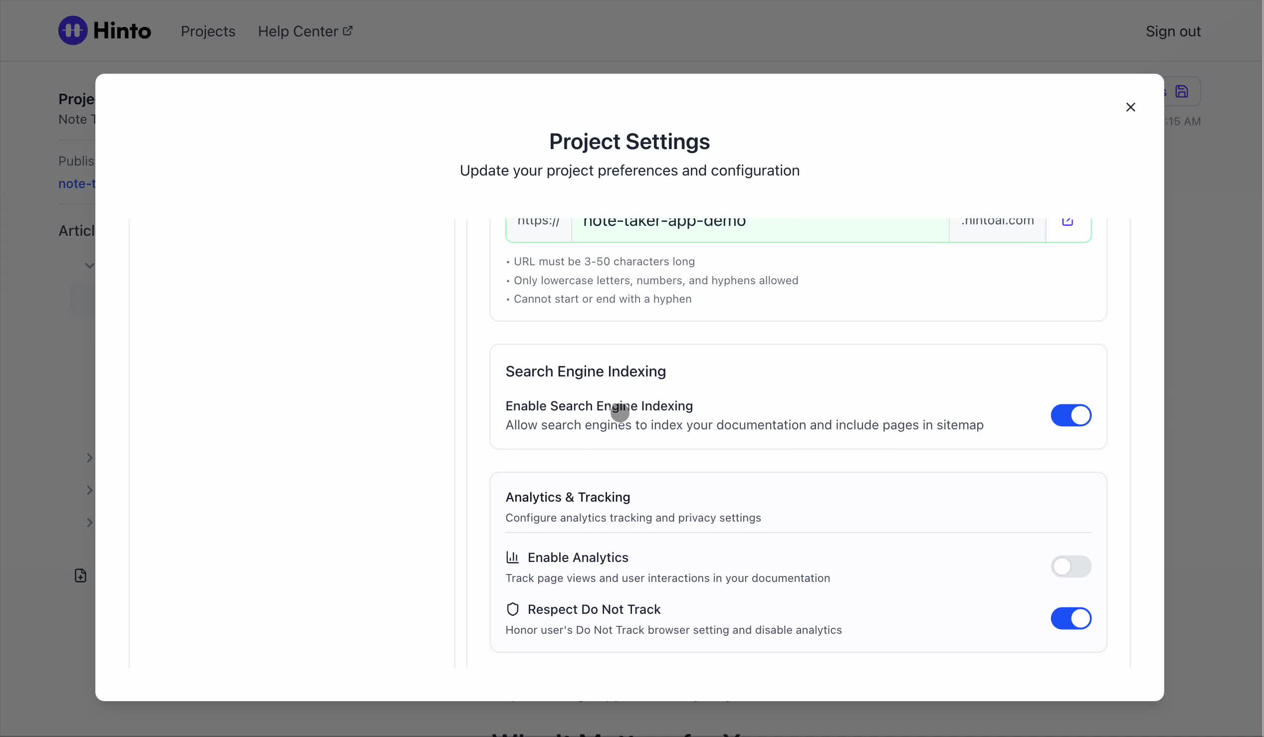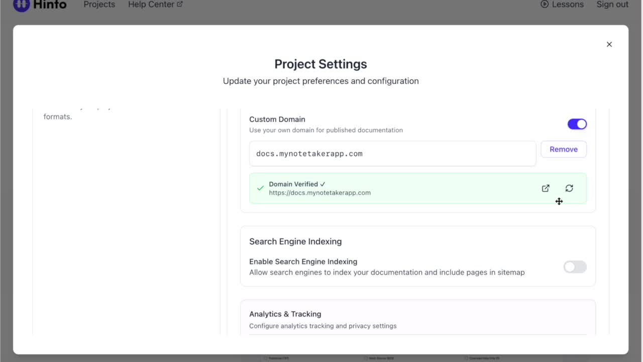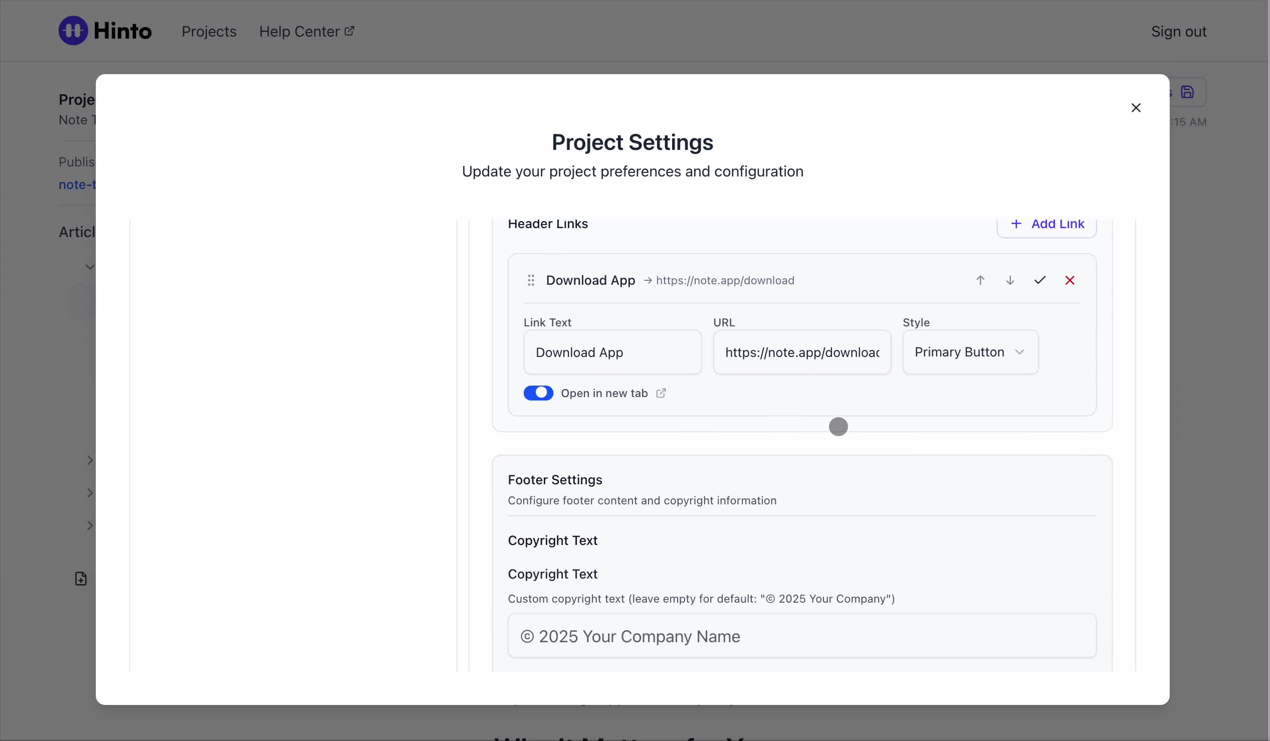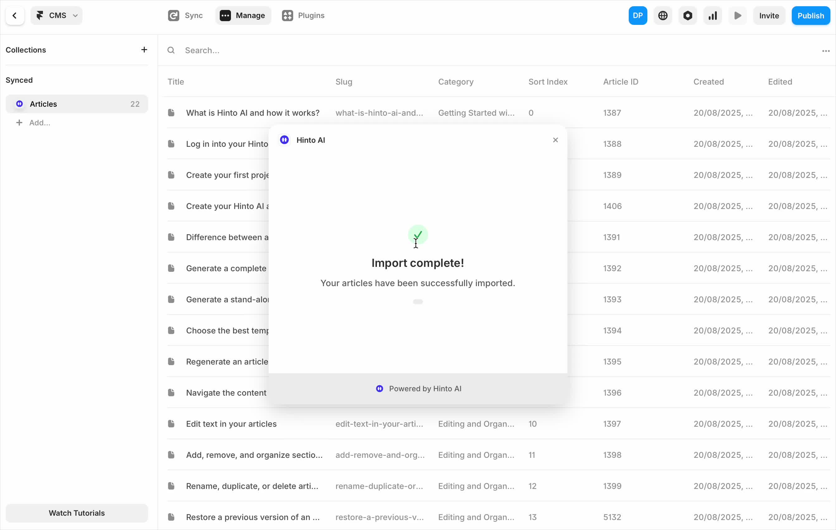 ", "format": "html" }, "project": { "slug": "project-slug", "name": "Project Name" } } ``` **Response (Markdown format):** ``` { "article": { "id": 1, "title": "Article Title", "project_id": "uuid", "folder_id": 1, "created_at": "2024-01-01T00:00:00Z", "updated_at": "2024-01-01T00:00:00Z" }, "content": { "markdown": "# Article Title\n\nArticle content...", "format": "markdown" }, "project": { "slug": "project-slug", "name": "Project Name" } } ``` ### 3. Export Complete Project **Endpoint:** GET /api/external/v1/projects/export **Authentication:** Required (Project API Key) Downloads the entire project as a ZIP archive or single file. **Query Parameters:** - format (optional): Export format - html (default): HTML files in ZIP archive - markdown: Markdown files in ZIP archive - llm-text: Single plain text file (all articles combined) **Response:** - For html/markdown: Binary ZIP file download with folder structure - Content-Type: application/zip - Content-Disposition: attachment; filename="project-name.zip" - For llm-text: Plain text file download (single file) - Content-Type: text/plain - Content-Disposition: attachment; filename="project-name.txt" ## Error Responses All endpoints return consistent error responses: ``` { "error": "Error type", "message": "Detailed error message" } ``` Common error codes: - 401 - Missing or invalid API key - 403 - Access denied to resource - 404 - Resource not found - 405 - Method not allowed - 500 - Internal server error ## Usage Examples ### Get Project Structure ``` curl -H "X-API-Key: your-api-key" \ https://app.hintoai.com/api/external/v1/projects/structure ``` ### Get Specific Article (HTML) ``` curl -H "X-API-Key: your-api-key" \ https://app.hintoai.com/api/external/v1/articles/123 ``` ### Get Article in Markdown Format ``` curl -H "X-API-Key: your-api-key" \ https://app.hintoai.com/api/external/v1/articles/123?format=markdown ``` ### Get Article with Clean HTML ``` curl -H "X-API-Key: your-api-key" \ https://app.hintoai.com/api/external/v1/articles/123?clean=true ``` ### Export Project as ZIP ``` curl -H "X-API-Key: your-api-key" \ https://app.hintoai.com/api/external/v1/projects/export?format=html \ -o project-export.zip ``` ### Export Project as LLM Text ``` curl -H "X-API-Key: your-api-key" \ https://app.hintoai.com/api/external/v1/projects/export?format=llm-text \ -o project-export.txt ``` ### Export Project as Markdown ``` curl -H "X-API-Key: your-api-key" \ https://app.hintoai.com/api/external/v1/projects/export?format=markdown \ -o project-export.zip ``` --- ### Set up webhooks for project notifications # Set up webhooks for project notifications Webhooks allow you to receive real-time notifications when specific events happen in your project, such as when it's published or archived. This guide shows you how to set up a webhook to send these notifications to an external service or application. You will need a valid endpoint URL from the service that will receive the webhook data. 1. From your project, navigate to **Project Settings**. 2. In the left-hand menu, click **API Keys & Webhooks**. 3. Select the **Webhooks** tab to open the configuration settings.  4. Click the **Enable Webhook** toggle to turn it on. 5. In the **Webhook URL** field, enter the complete URL of the endpoint that will receive the webhook notifications. This field is required.  6. Under **Events to Trigger**, select the checkboxes for the events you want notifications for. You can choose from **Publish**, **Republish**, **Unpublish**, and **Archive**.  7. Optionally, add custom headers for authentication. Click **+ Add Header** and enter the **Header name** and **Header value**.  8. Click **Save Configuration** to activate your webhook. ## Summary This article explains how to configure webhooks for your projects. Setting up a webhook enables Hinto AI to automatically send notifications to your specified URL when key project events occur, such as publishing or archiving, which helps automate your workflows and integrate with other tools. ## Related - [Generate and manage API keys](/docs/integrations/generate-and-manage-api-keys) - [API Documentation](/docs/integrations/api-documentation) - [How to publish your project](/docs/publishing-documentation/how-to-publish-your-project-with-a-public-url) --- ### Framer Integration #### Connect Hinto AI with Framer # How to Connect Hinto AI with Framer This guide explains how to connect your Hinto AI knowledge base with Framer. By following these steps, you can seamlessly import your documentation, including articles and folders, directly into Framer's CMS. This allows you to build a fully functional, dynamic help center on your Framer site. You will need active accounts for both Hinto AI and Framer. ## Part 1: Syncing Your Articles. 1. In your Framer project, navigate to the **CMS** panel on the left sidebar. 2. Open the command palette by pressing **Cmd/Ctrl + K** or click the **plugin** icon at the bottom of the canvas. Search for **Hinto AI** and select it to launch the plugin.  3. In the **New Collection** window that appears, enter 'Articles' as the name and click **Create**. This collection will store all your individual help articles.  4. To get your API key, navigate to the Hinto AI web app and open your project. 5. Click the settings icon to open **Project Settings** and select **API Keys** from the side menu. 6. Click the **New API Key +** button. 7. Enter a descriptive name for your key (e.g., 'Framer Integration') and click **Create API Key**. 1. Click the copy icon to copy the new API key to your clipboard. 2. Return to Framer, paste the key into the **API Key** field, and click **Continue**.  1. In the Hinto Content Sync window, ensure the **Content Type** is set to **Articles**. 2. (Optional) For internal links to function correctly, expand **Advanced Settings** and enter your site’s full base URL path where articles will live (e.g., https://yourdomain.com/docs). 3. Click **Import** to begin syncing. Your Hinto A