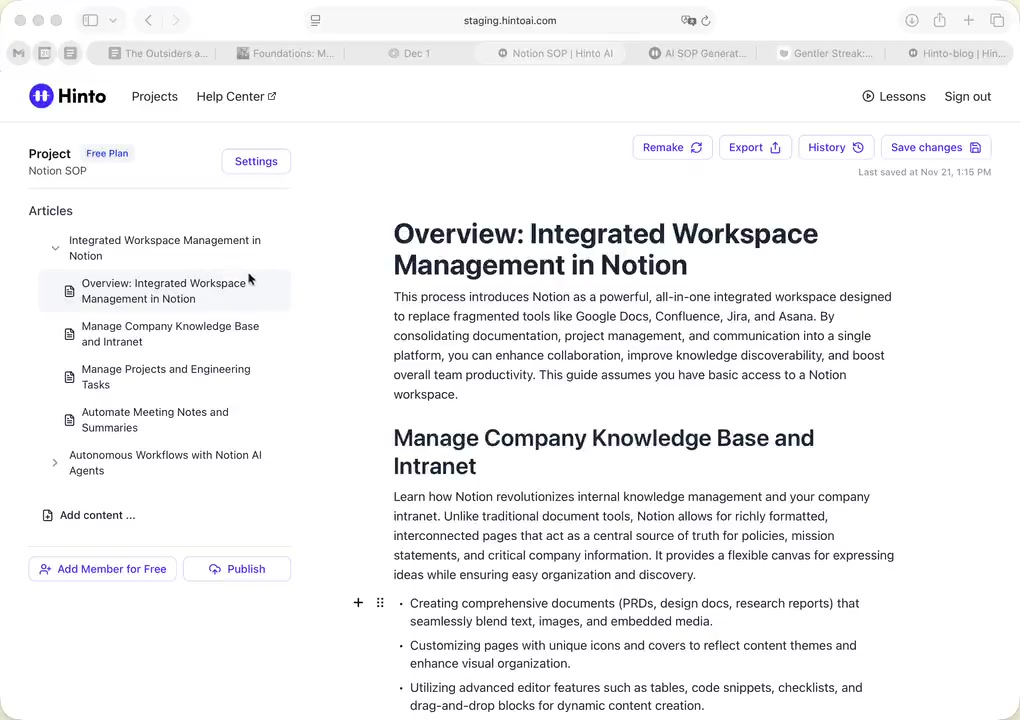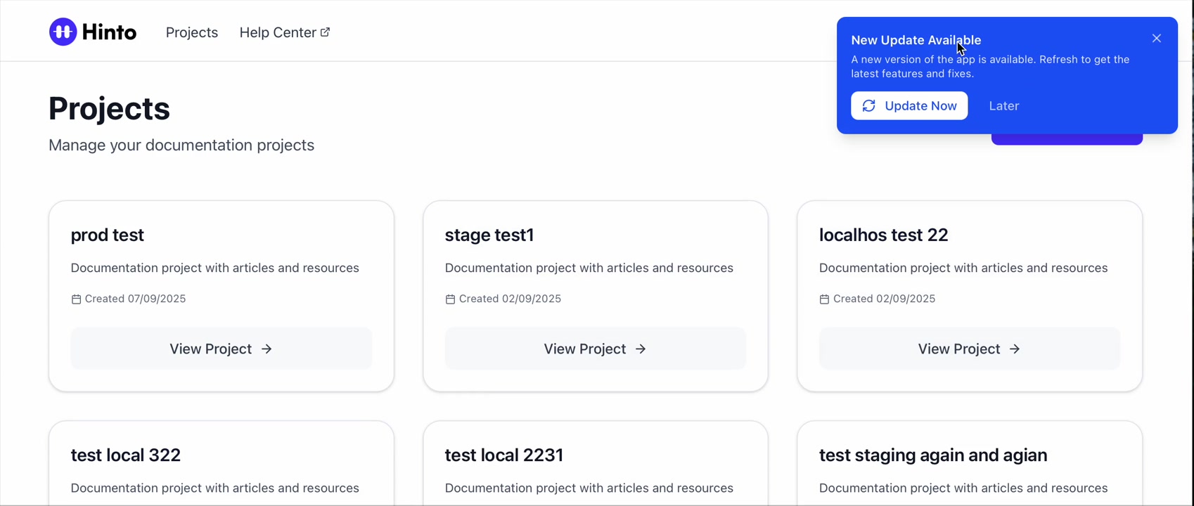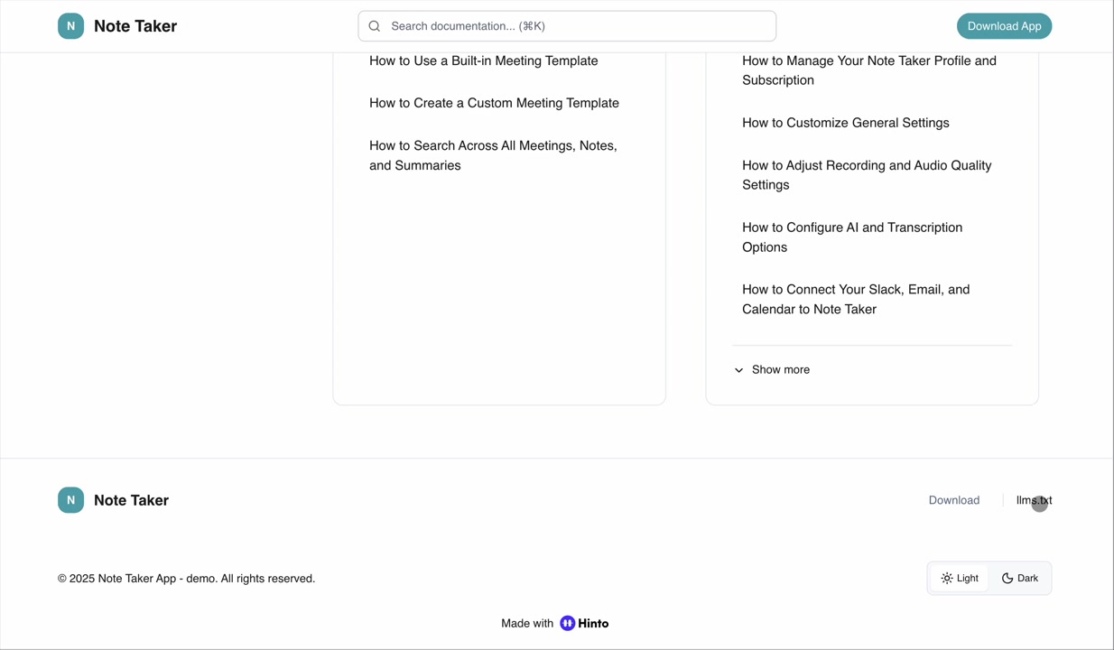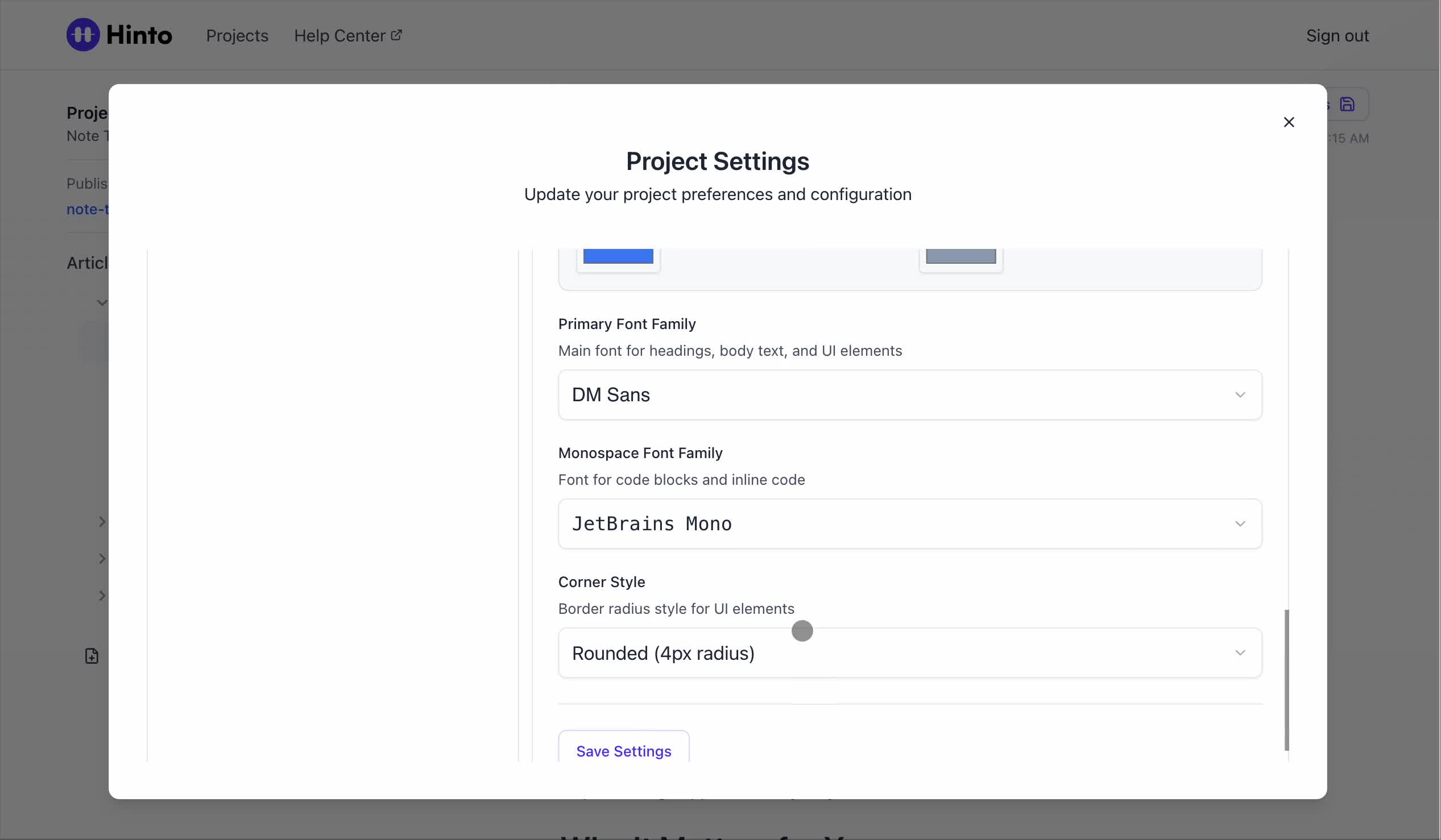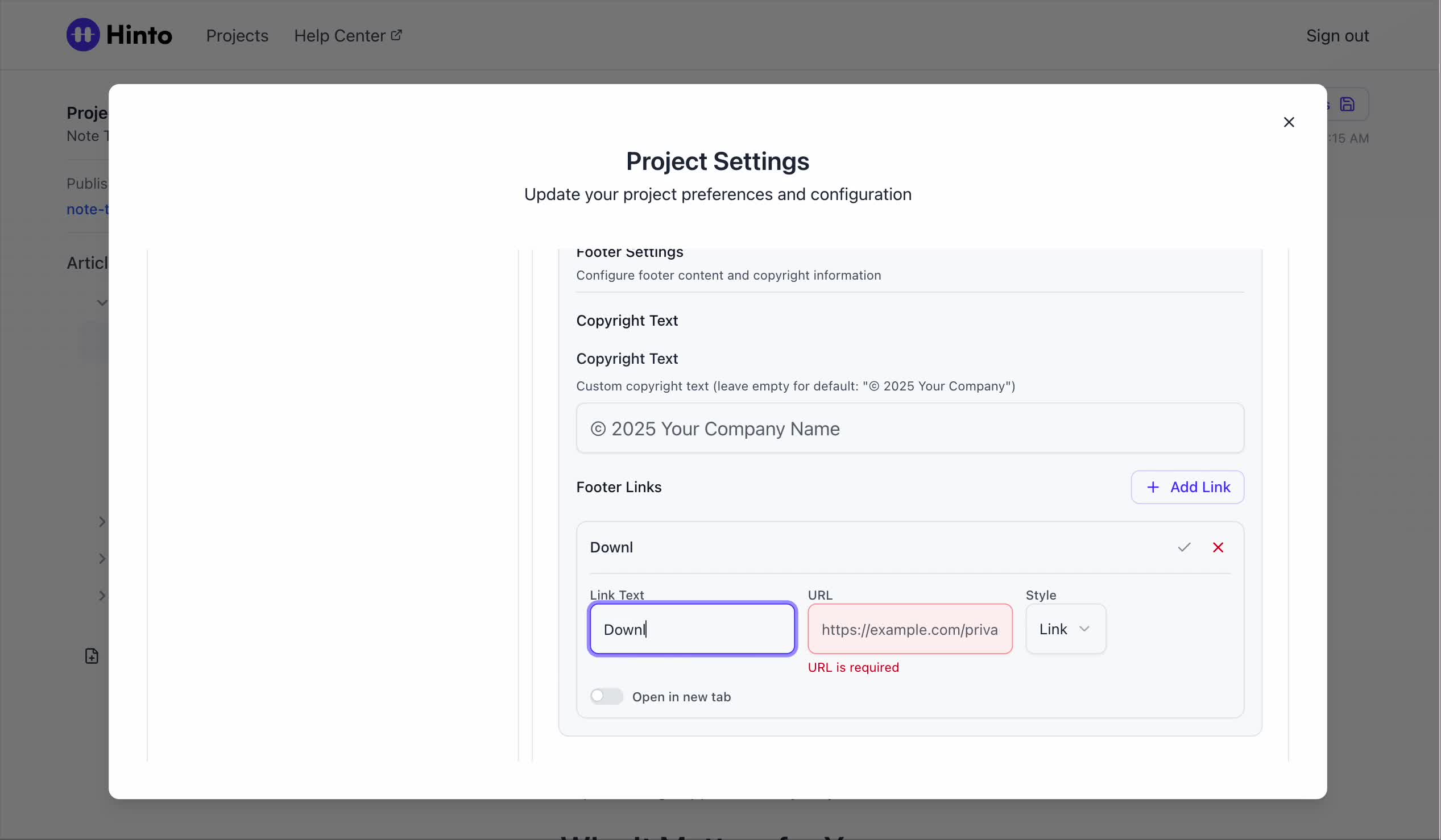 ", "format": "html" }, "project": { "slug": "project-slug", "name": "Project Name" } } ``` **Response (Markdown format):** ``` { "article": { "id": 1, "title": "Article Title", "project_id": "uuid", "folder_id": 1, "created_at": "2024-01-01T00:00:00Z", "updated_at": "2024-01-01T00:00:00Z" }, "content": { "markdown": "# Article Title\n\nArticle content...", "format": "markdown" }, "project": { "slug": "project-slug", "name": "Project Name" } } ``` ### 3. Export Complete Project **Endpoint:** GET /api/external/v1/projects/export **Authentication:** Required (Project API Key) Downloads the entire project as a ZIP archive or single file. **Query Parameters:** - format (optional): Export format - html (default): HTML files in ZIP archive - markdown: Markdown files in ZIP archive - llm-text: Single plain text file (all articles combined) **Response:** - For html/markdown: Binary ZIP file download with folder structure - Content-Type: application/zip - Content-Disposition: attachment; filename="project-name.zip" - For llm-text: Plain text file download (single file) - Content-Type: text/plain - Content-Disposition: attachment; filename="project-name.txt" ## Error Responses All endpoints return consistent error responses: ``` { "error": "Error type", "message": "Detailed error message" } ``` Common error codes: - 401 - Missing or invalid API key - 403 - Access denied to resource - 404 - Resource not found - 405 - Method not allowed - 500 - Internal server error ## Usage Examples ### Get Project Structure ``` curl -H "X-API-Key: your-api-key" \ https://app.hintoai.com/api/external/v1/projects/structure ``` ### Get Specific Article (HTML) ``` curl -H "X-API-Key: your-api-key" \ https://app.hintoai.com/api/external/v1/articles/123 ``` ### Get Article in Markdown Format ``` curl -H "X-API-Key: your-api-key" \ https://app.hintoai.com/api/external/v1/articles/123?format=markdown ``` ### Get Article with Clean HTML ``` curl -H "X-API-Key: your-api-key" \ https://app.hintoai.com/api/external/v1/articles/123?clean=true ``` ### Export Project as ZIP ``` curl -H "X-API-Key: your-api-key" \ https://app.hintoai.com/api/external/v1/projects/export?format=html \ -o project-export.zip ``` ### Export Project as LLM Text ``` curl -H "X-API-Key: your-api-key" \ https://app.hintoai.com/api/external/v1/projects/export?format=llm-text \ -o project-export.txt ``` ### Export Project as Markdown ``` curl -H "X-API-Key: your-api-key" \ https://app.hintoai.com/api/external/v1/projects/export?format=markdown \ -o project-export.zip ``` --- ### Set up webhooks for project notifications # Set up webhooks for project notifications Webhooks allow you to receive real-time notifications when specific events happen in your project, such as when it's published or archived. This guide shows you how to set up a webhook to send these notifications to an external service or application. You will need a valid endpoint URL from the service that will receive the webhook data. 1. From your project, navigate to **Project Settings**. 2. In the left-hand menu, click **API Keys & Webhooks**. 3. Select the **Webhooks** tab to open the configuration settings.  4. Click the **Enable Webhook** toggle to turn it on. 5. In the **Webhook URL** field, enter the complete URL of the endpoint that will receive the webhook notifications. This field is required.  6. Under **Events to Trigger**, select the checkboxes for the events you want notifications for. You can choose from **Publish**, **Republish**, **Unpublish**, and **Archive**.  7. Optionally, add custom headers for authentication. Click **+ Add Header** and enter the **Header name** and **Header value**.  8. Click **Save Configuration** to activate your webhook. ## Summary This article explains how to configure webhooks for your projects. Setting up a webhook enables Hinto AI to automatically send notifications to your specified URL when key project events occur, such as publishing or archiving, which helps automate your workflows and integrate with other tools. ## Related - [Generate and manage API keys](/docs/integrations/generate-and-manage-api-keys) - [API Documentation](/docs/integrations/api-documentation) - [How to publish your project](/docs/publishing-documentation/how-to-publish-your-project-with-a-public-url) --- ### Framer Integration #### Connect Hinto AI with Framer # How to Connect Hinto AI with Framer This guide explains how to connect your Hinto AI knowledge base with Framer. By following these steps, you can seamlessly import your documentation, including articles and folders, directly into Framer's CMS. This allows you to build a fully functional, dynamic help center on your Framer site. You will need active accounts for both Hinto AI and Framer. ## Part 1: Syncing Your Articles. 1. In your Framer project, navigate to the **CMS** panel on the left sidebar. 2. Open the command palette by pressing **Cmd/Ctrl + K** or click the **plugin** icon at the bottom of the canvas. Search for **Hinto AI** and select it to launch the plugin.  3. In the **New Collection** window that appears, enter 'Articles' as the name and click **Create**. This collection will store all your individual help articles.  4. To get your API key, navigate to the Hinto AI web app and open your project. 5. Click the settings icon to open **Project Settings** and select **API Keys** from the side menu. 6. Click the **New API Key +** button. 7. Enter a descriptive name for your key (e.g., 'Framer Integration') and click **Create API Key**. 1. Click the copy icon to copy the new API key to your clipboard. 2. Return to Framer, paste the key into the **API Key** field, and click **Continue**.  1. In the Hinto Content Sync window, ensure the **Content Type** is set to **Articles**. 2. (Optional) For internal links to function correctly, expand **Advanced Settings** and enter your site’s full base URL path where articles will live (e.g., https://yourdomain.com/docs). 3. Click **Import** to begin syncing. Your Hinto A