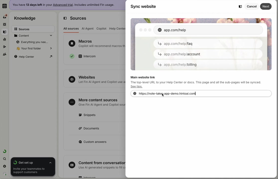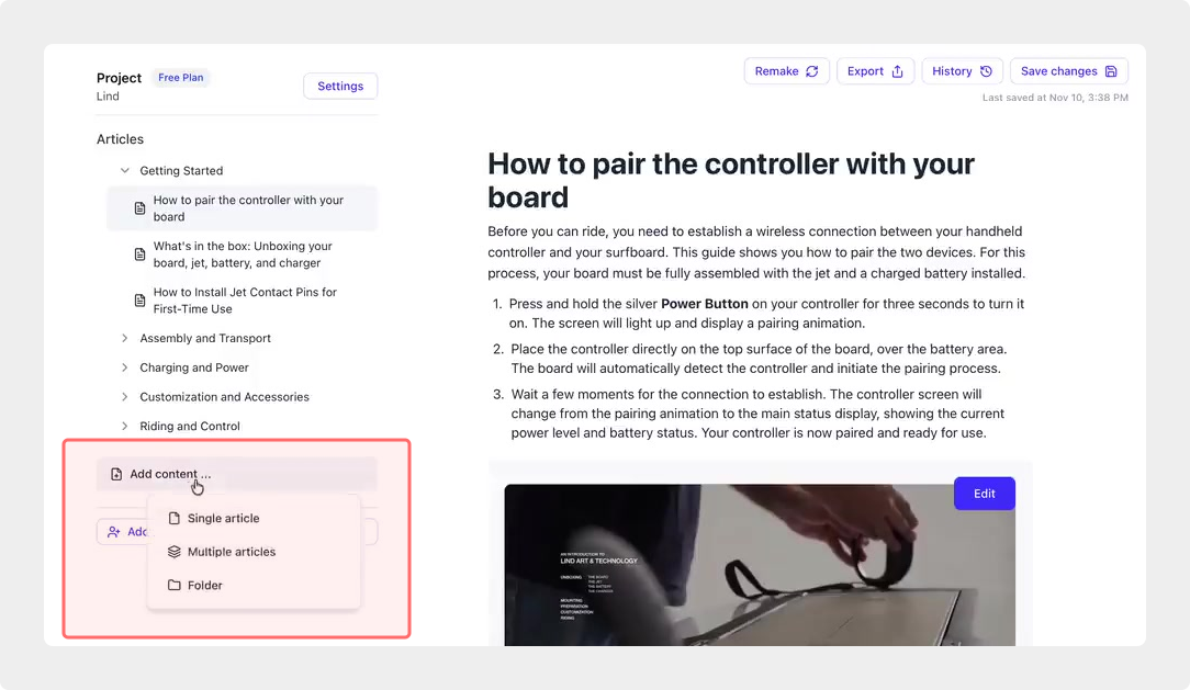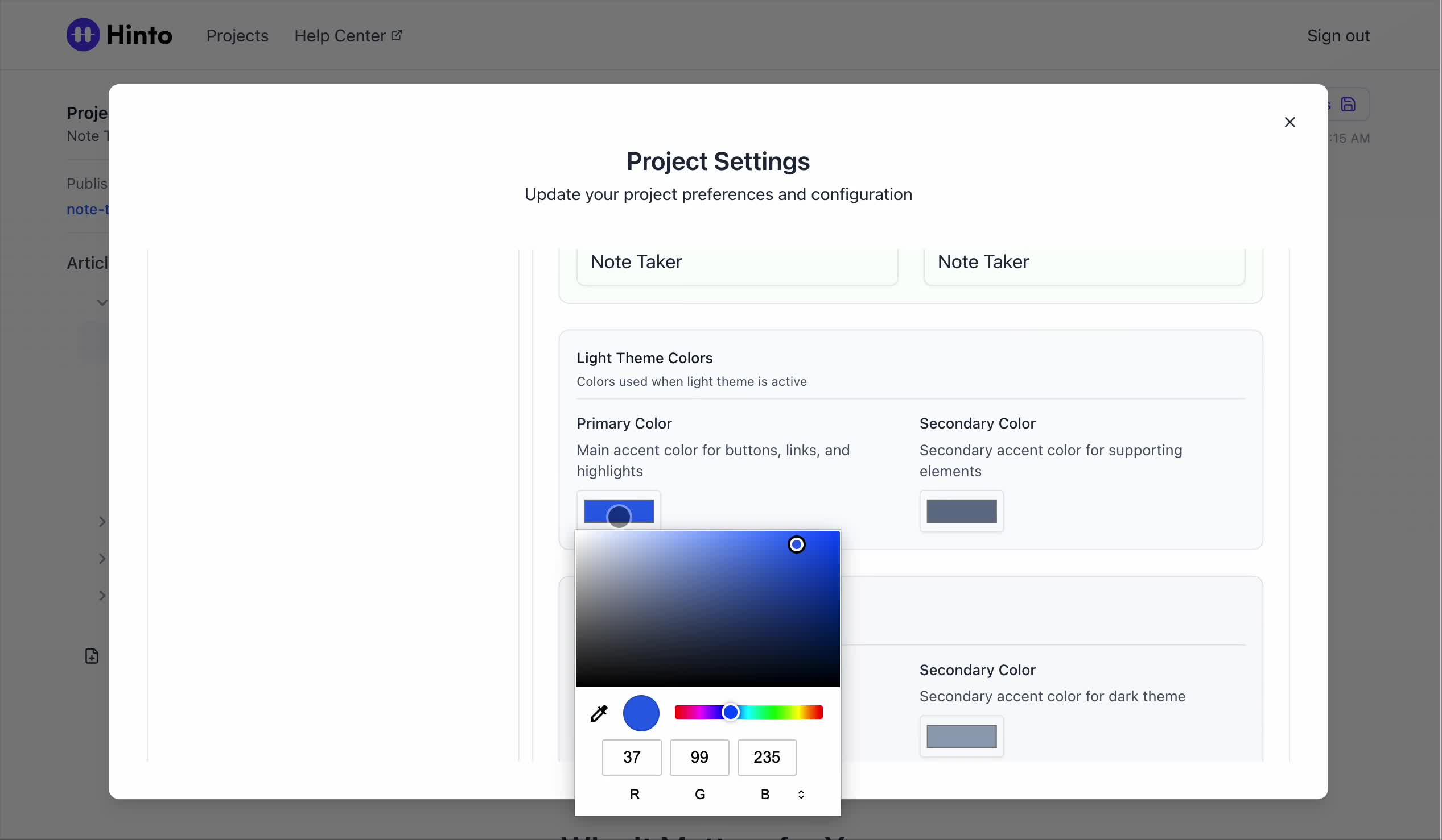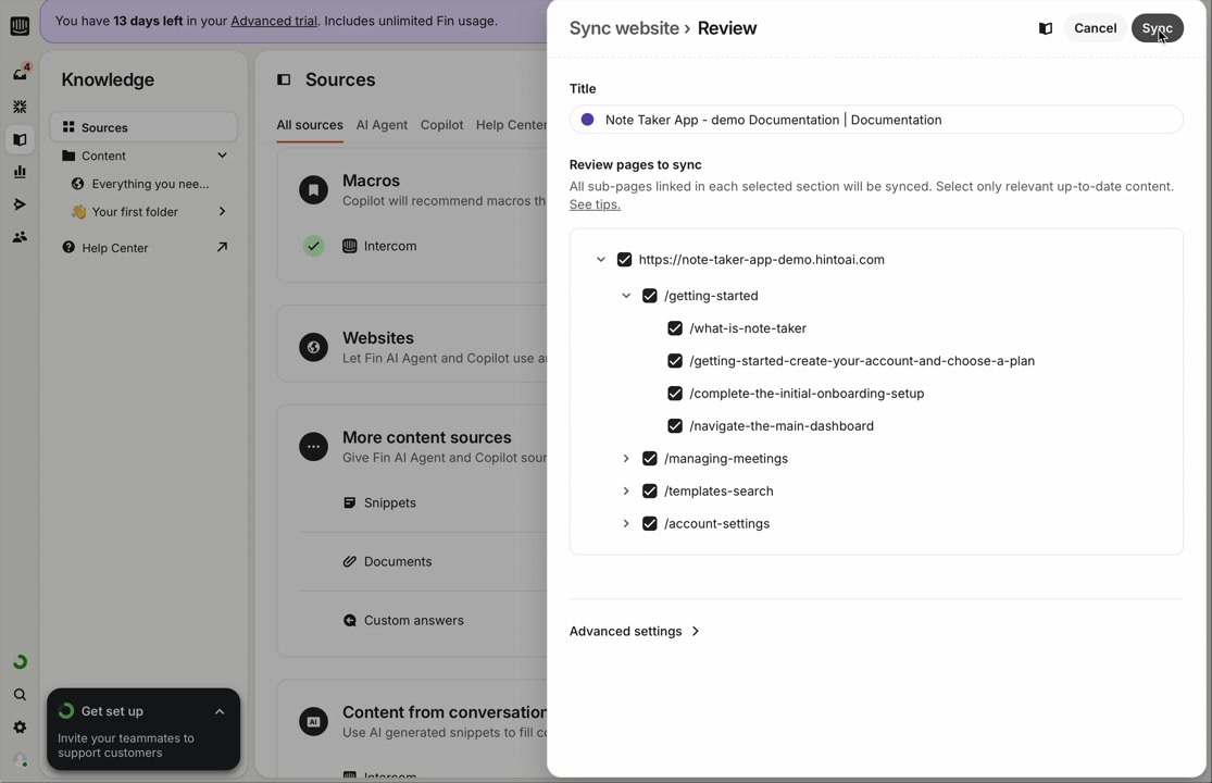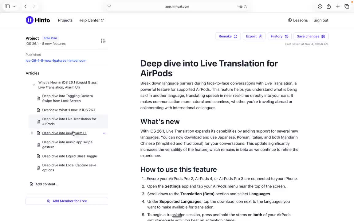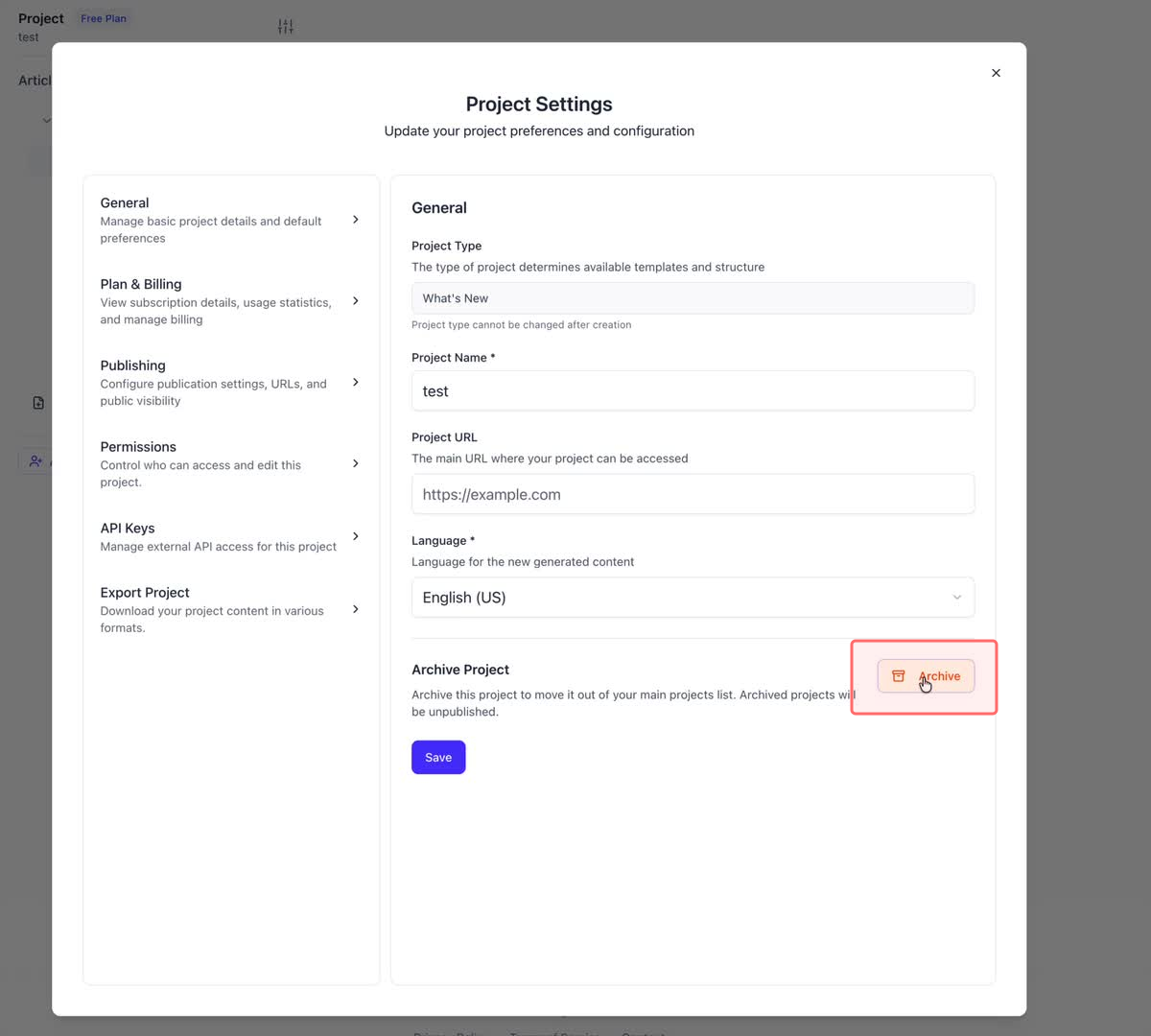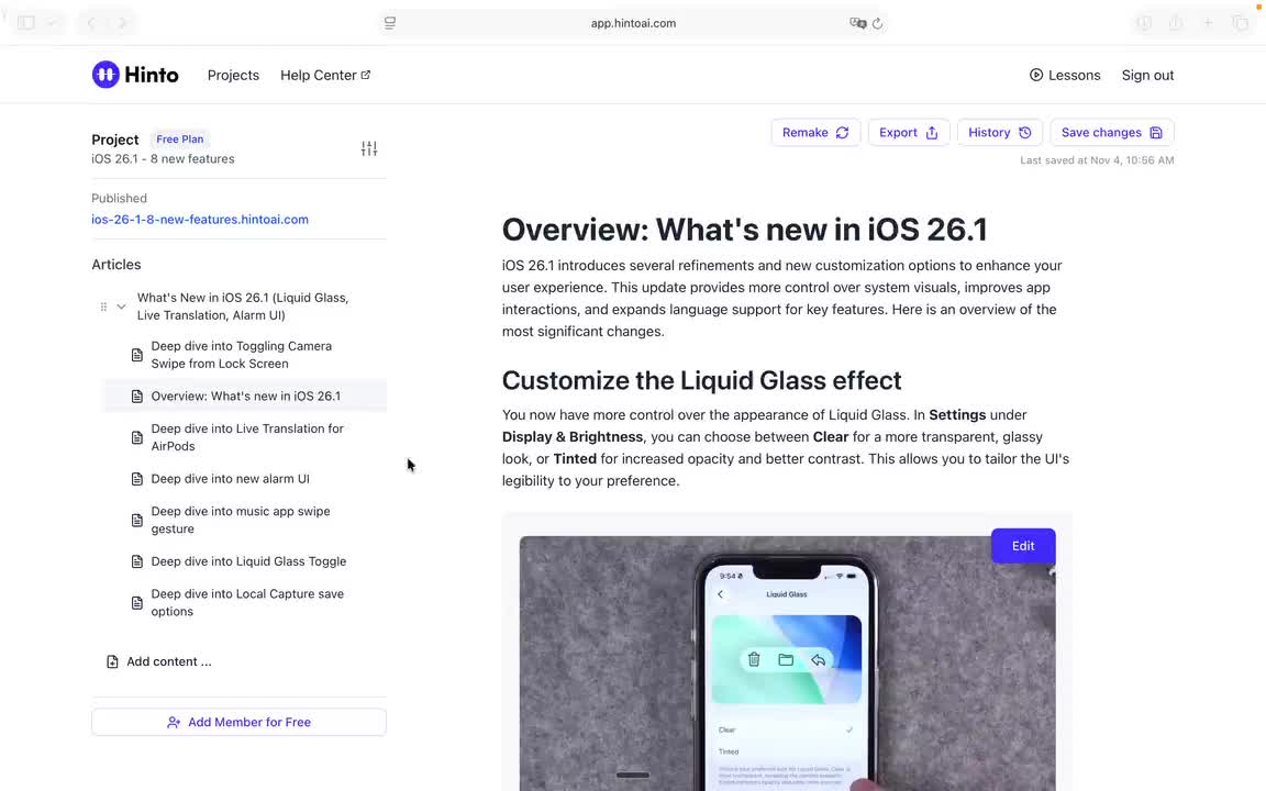 ", "format": "html" }, "project": { "slug": "project-slug", "name": "Project Name" } } ``` **Response (Markdown format):** ``` { "article": { "id": 1, "title": "Article Title", "project_id": "uuid", "folder_id": 1, "created_at": "2024-01-01T00:00:00Z", "updated_at": "2024-01-01T00:00:00Z" }, "content": { "markdown": "# Article Title\n\nArticle content...", "format": "markdown" }, "project": { "slug": "project-slug", "name": "Project Name" } } ``` ### 3. Export Complete Project **Endpoint:** GET /api/external/v1/projects/export **Authentication:** Required (Project API Key) Downloads the entire project as a ZIP archive or single file. **Query Parameters:** - format (optional): Export format - html (default): HTML files in ZIP archive - markdown: Markdown files in ZIP archive - llm-text: Single plain text file (all articles combined) **Response:** - For html/markdown: Binary ZIP file download with folder structure - Content-Type: application/zip - Content-Disposition: attachment; filename="project-name.zip" - For llm-text: Plain text file download (single file) - Content-Type: text/plain - Content-Disposition: attachment; filename="project-name.txt" ## Error Responses All endpoints return consistent error responses: ``` { "error": "Error type", "message": "Detailed error message" } ``` Common error codes: - 401 - Missing or invalid API key - 403 - Access denied to resource - 404 - Resource not found - 405 - Method not allowed - 500 - Internal server error ## Usage Examples ### Get Project Structure ``` curl -H "X-API-Key: your-api-key" \ https://app.hintoai.com/api/external/v1/projects/structure ``` ### Get Specific Article (HTML) ``` curl -H "X-API-Key: your-api-key" \ https://app.hintoai.com/api/external/v1/articles/123 ``` ### Get Article in Markdown Format ``` curl -H "X-API-Key: your-api-key" \ https://app.hintoai.com/api/external/v1/articles/123?format=markdown ``` ### Get Article with Clean HTML ``` curl -H "X-API-Key: your-api-key" \ https://app.hintoai.com/api/external/v1/articles/123?clean=true ``` ### Export Project as ZIP ``` curl -H "X-API-Key: your-api-key" \ https://app.hintoai.com/api/external/v1/projects/export?format=html \ -o project-export.zip ``` ### Export Project as LLM Text ``` curl -H "X-API-Key: your-api-key" \ https://app.hintoai.com/api/external/v1/projects/export?format=llm-text \ -o project-export.txt ``` ### Export Project as Markdown ``` curl -H "X-API-Key: your-api-key" \ https://app.hintoai.com/api/external/v1/projects/export?format=markdown \ -o project-export.zip ``` --- ### Set up webhooks for project notifications # Set up webhooks for project notifications Webhooks allow you to receive real-time notifications when specific events happen in your project, such as when it's published or archived. This guide shows you how to set up a webhook to send these notifications to an external service or application. You will need a valid endpoint URL from the service that will receive the webhook data. 1. From your project, navigate to **Project Settings**. 2. In the left-hand menu, click **API Keys & Webhooks**. 3. Select the **Webhooks** tab to open the configuration settings.  4. Click the **Enable Webhook** toggle to turn it on. 5. In the **Webhook URL** field, enter the complete URL of the endpoint that will receive the webhook notifications. This field is required.  6. Under **Events to Trigger**, select the checkboxes for the events you want notifications for. You can choose from **Publish**, **Republish**, **Unpublish**, and **Archive**.  7. Optionally, add custom headers for authentication. Click **+ Add Header** and enter the **Header name** and **Header value**.  8. Click **Save Configuration** to activate your webhook. ## Summary This article explains how to configure webhooks for your projects. Setting up a webhook enables Hinto AI to automatically send notifications to your specified URL when key project events occur, such as publishing or archiving, which helps automate your workflows and integrate with other tools. ## Related - [Generate and manage API keys](/docs/integrations/generate-and-manage-api-keys) - [API Documentation](/docs/integrations/api-documentation) - [How to publish your project](/docs/publishing-documentation/how-to-publish-your-project-with-a-public-url) --- ### Framer Integration #### Connect Hinto AI with Framer # How to Connect Hinto AI with Framer This guide explains how to connect your Hinto AI knowledge base with Framer. By following these steps, you can seamlessly import your documentation, including articles and folders, directly into Framer's CMS. This allows you to build a fully functional, dynamic help center on your Framer site. You will need active accounts for both Hinto AI and Framer. ## Part 1: Syncing Your Articles. 1. In your Framer project, navigate to the **CMS** panel on the left sidebar. 2. Open the command palette by pressing **Cmd/Ctrl + K** or click the **plugin** icon at the bottom of the canvas. Search for **Hinto AI** and select it to launch the plugin.  3. In the **New Collection** window that appears, enter 'Articles' as the name and click **Create**. This collection will store all your individual help articles.  4. To get your API key, navigate to the Hinto AI web app and open your project. 5. Click the settings icon to open **Project Settings** and select **API Keys** from the side menu. 6. Click the **New API Key +** button. 7. Enter a descriptive name for your key (e.g., 'Framer Integration') and click **Create API Key**. 1. Click the copy icon to copy the new API key to your clipboard. 2. Return to Framer, paste the key into the **API Key** field, and click **Continue**.  1. In the Hinto Content Sync window, ensure the **Content Type** is set to **Articles**. 2. (Optional) For internal links to function correctly, expand **Advanced Settings** and enter your site’s full base URL path where articles will live (e.g., https://yourdomain.com/docs). 3. Click **Import** to begin syncing. Your Hinto A